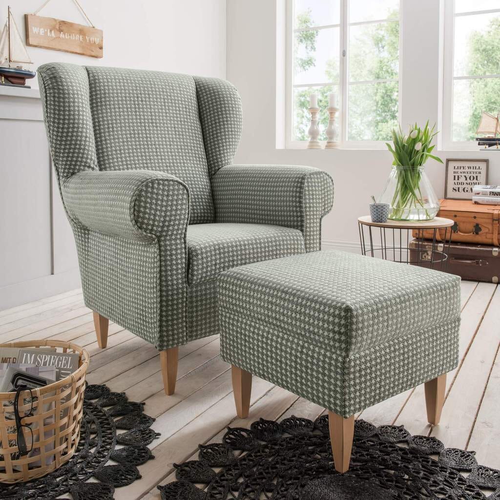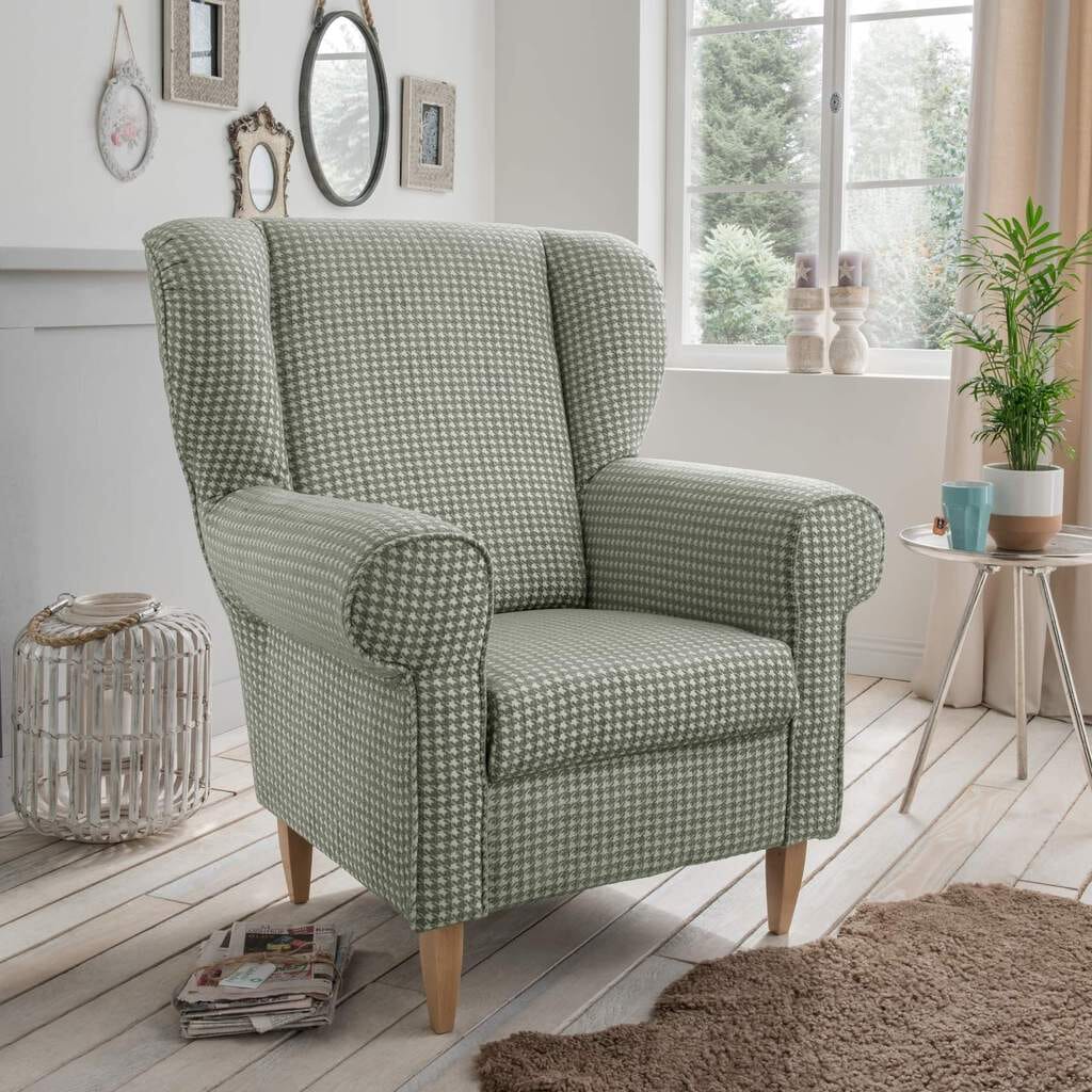 Toller Ohrensessel mit schöner Landhausstoff Kombination im Farbton Olivgrün.