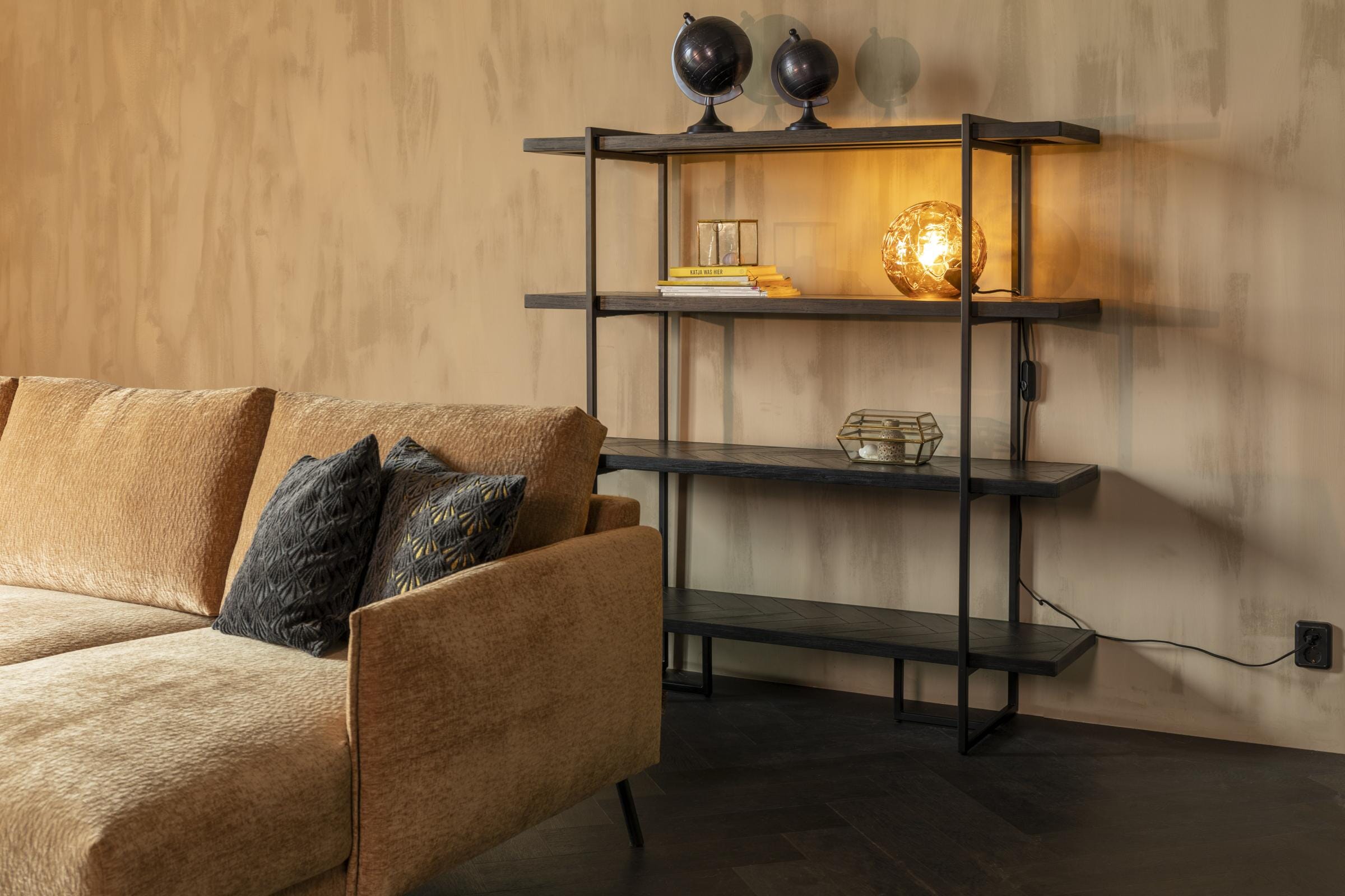 Das Holz in schwarz lackierter Akazie passt perfekt zu dem Gold des Metalls und lässt das Regal besonders stilvoll und einladend wirken. Noch dazu erlaubt die Konstruktion des Regals es Ihnen, das Möbel entweder an eine Wand oder auch als Raumteiler im Raum aufzustellen.