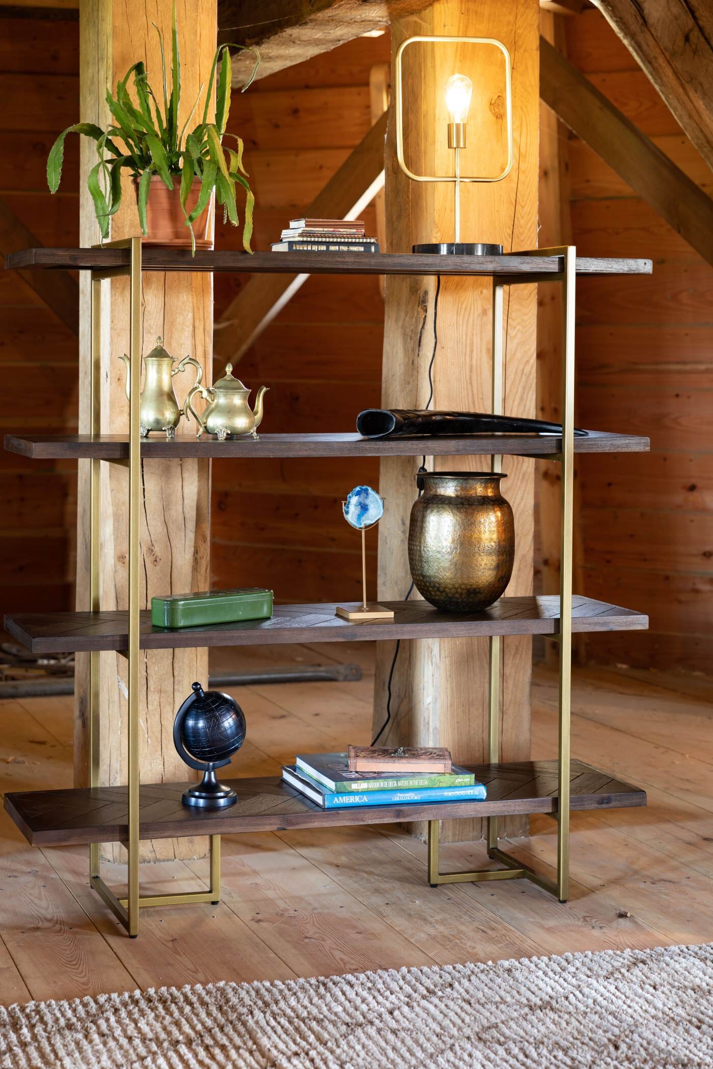 Das Regal CLASS von DutchBone ist eine wunderschöne Kombination aus kühlem Metal und warmen Holz. Der federleicht wirkende Rahmen aus Antik-Messing beschichtetem Metall hält vier Regalböden aus Holz.