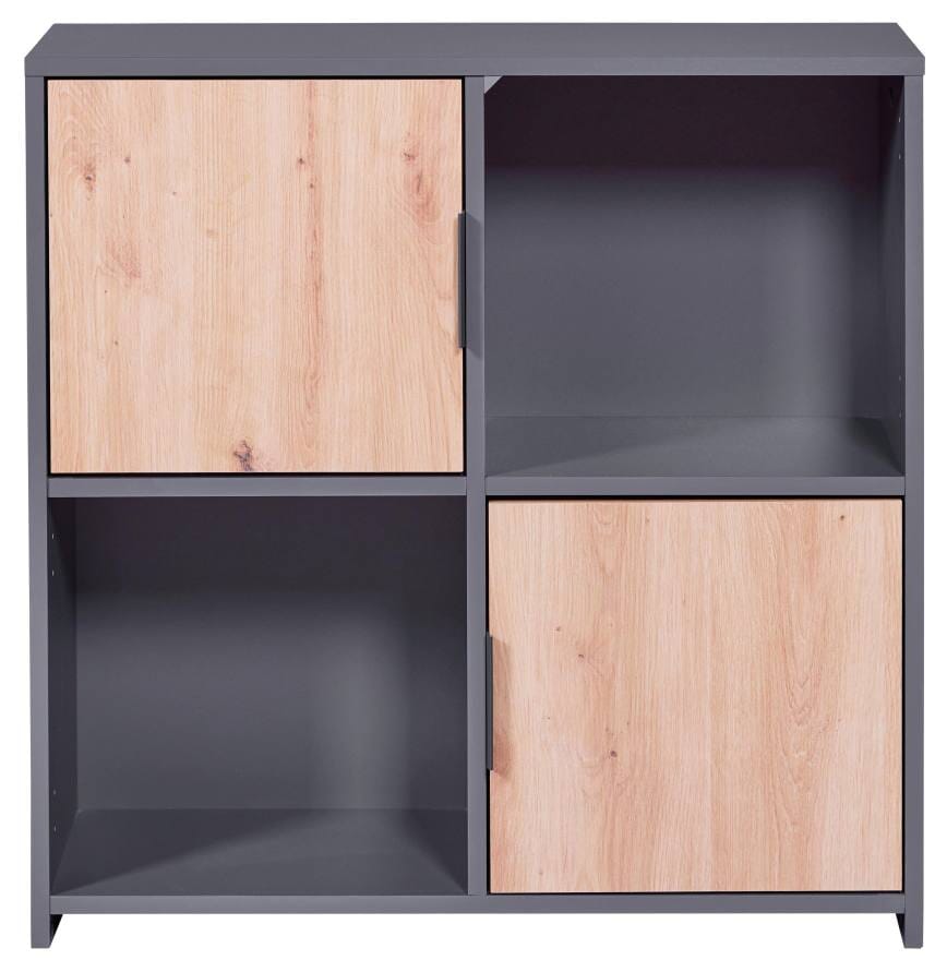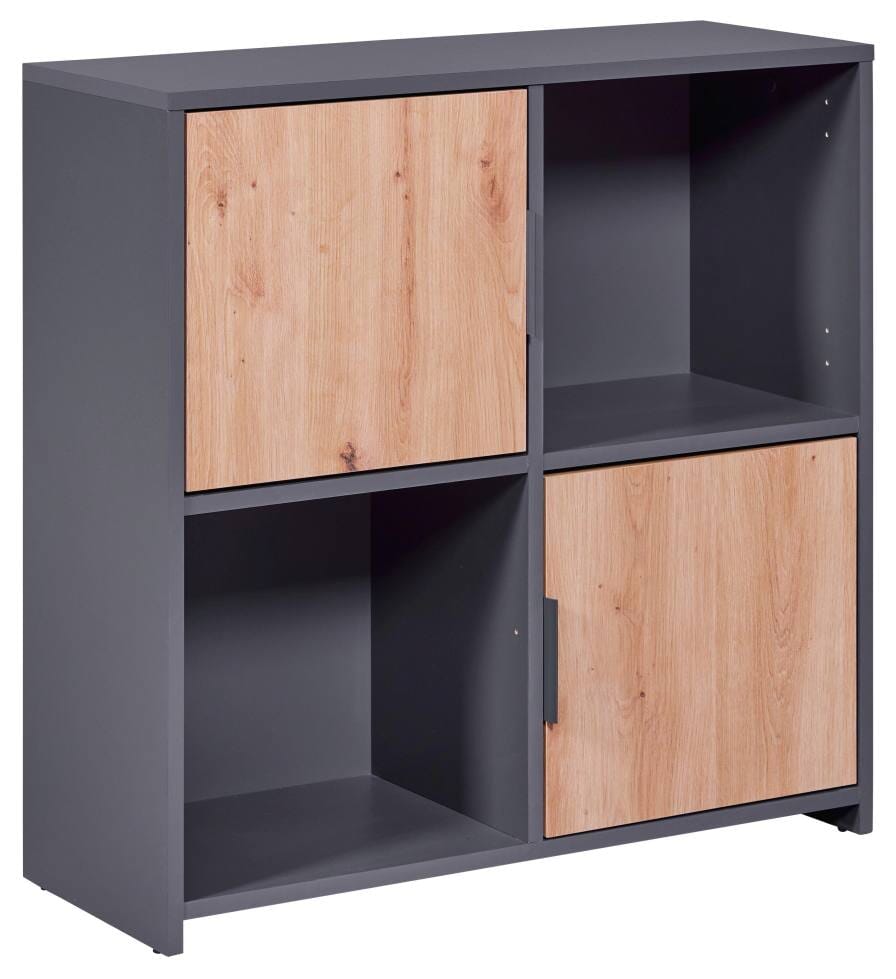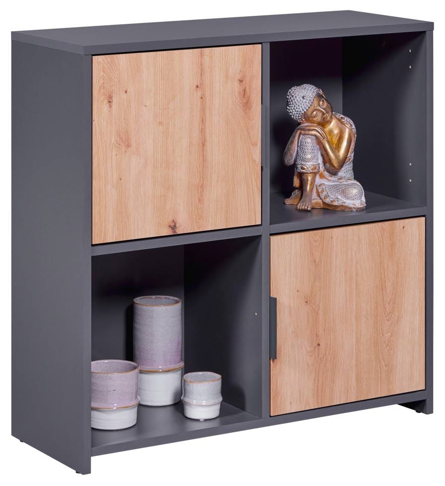 Vier Fächer, das kann so smart aussehen wie bei diesem Modell. Spanplatte wurden mit einer dekorativen Beschichtung versehen, so dass sich eine haltbare und pflegeleichte Oberfläche ergibt. Die offenen Fächer lassen Ihrer Kreativität völlig freien Lauf. Und die beiden Türen verwehren einen Blick auf Ihre Schätze.