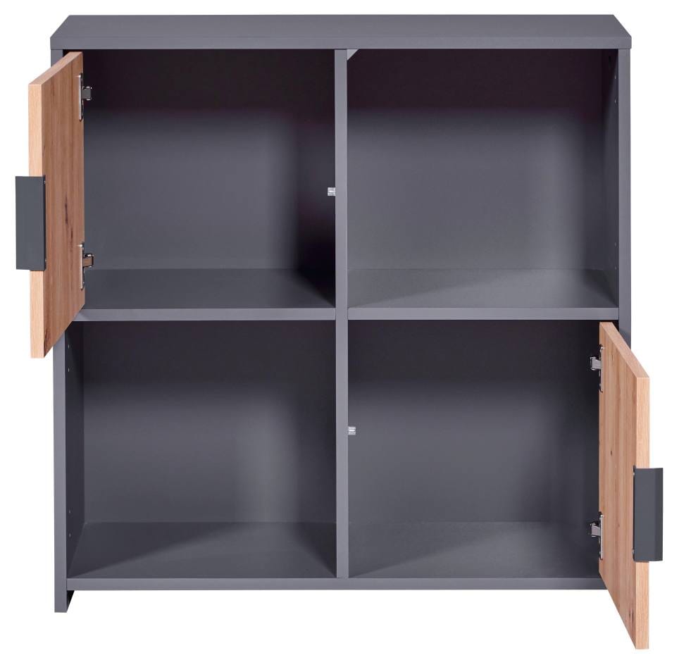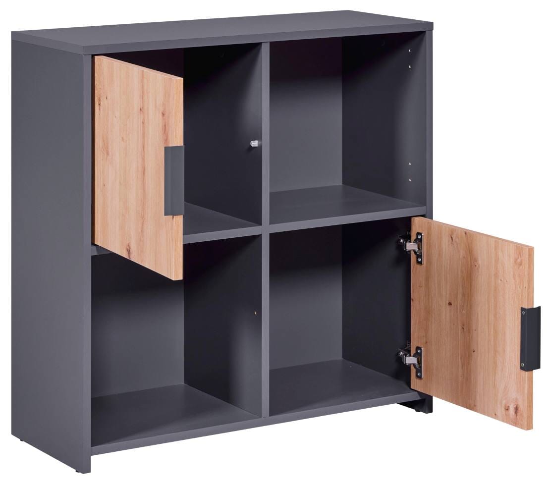 Mit dieser gefälligen Farbkombination aus grauen Korpus und zwei praktischen Türen in angesagter Artisan Eiche haben Sie einen mordernen Hingucker im Wohnzimmer. Natürlich funktioniert dieses kleine Möbelstück auch im Kinderzimmer oder im Homeoffice. Das kleine Plus: Die Türen sind je nach dem, welchen Platz man schließen möchte, variabel montierbar!