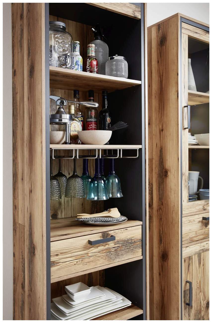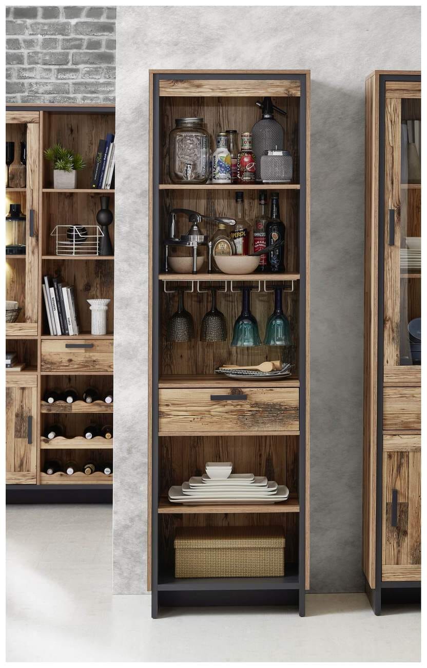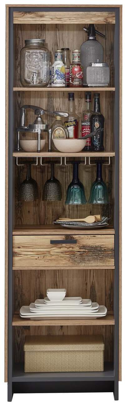 Durch die tolle Maserung fällt das vielseitig verwendbare Regal sofort ins Auge. Es passt in stilvoll eingerichtete Wohn- oder Esszimmer und ist durch das tolle Design vielseitig mit verschiedenen Möbeln kombinierbar. Viel Stauraum bieten Ihnen fünf offene Fächer und ein Schubkasten mit Softclose und Selbsteinzug. Der Clou sind vier Halter aus Metall, die sich zum Einhängen von mehreren Wein- oder Sektgläsern eignen.