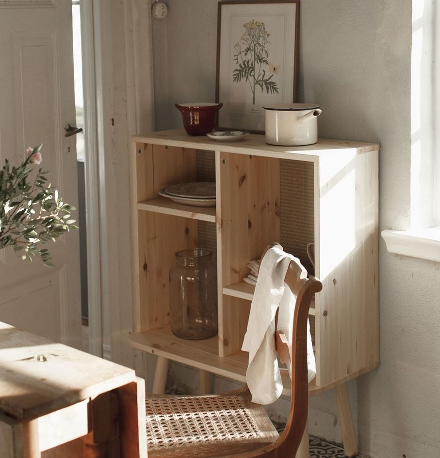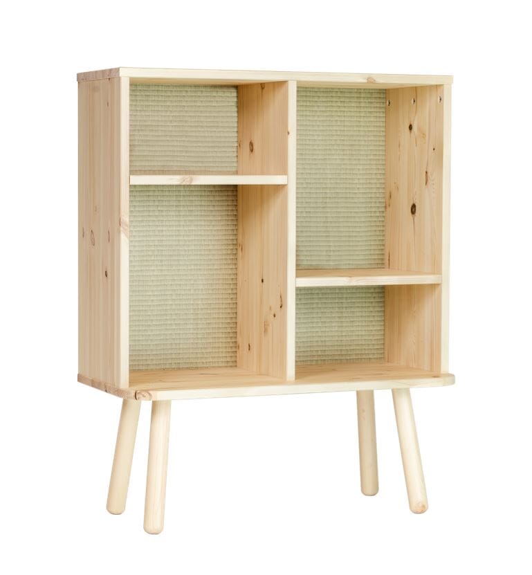 Der Korpus aus Kiefer Natur mit Lack drauf trifft im Hintergrund auf den Tatami-Effekt. Schauen Sie mal, wie das zusammen wirkt. Beim näheren Hingucken werden Sie erkennen, dass Seegras Ihr Heim bereichert. Genau daraus bestehen nämlich die Tatami Matten. Was also leicht würzig duftet, ist dieses Element. Ansonsten werden Sie frisches Holz erschnuppern können.