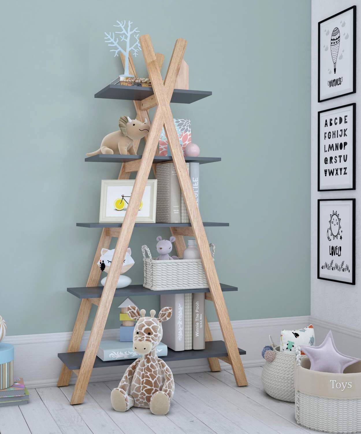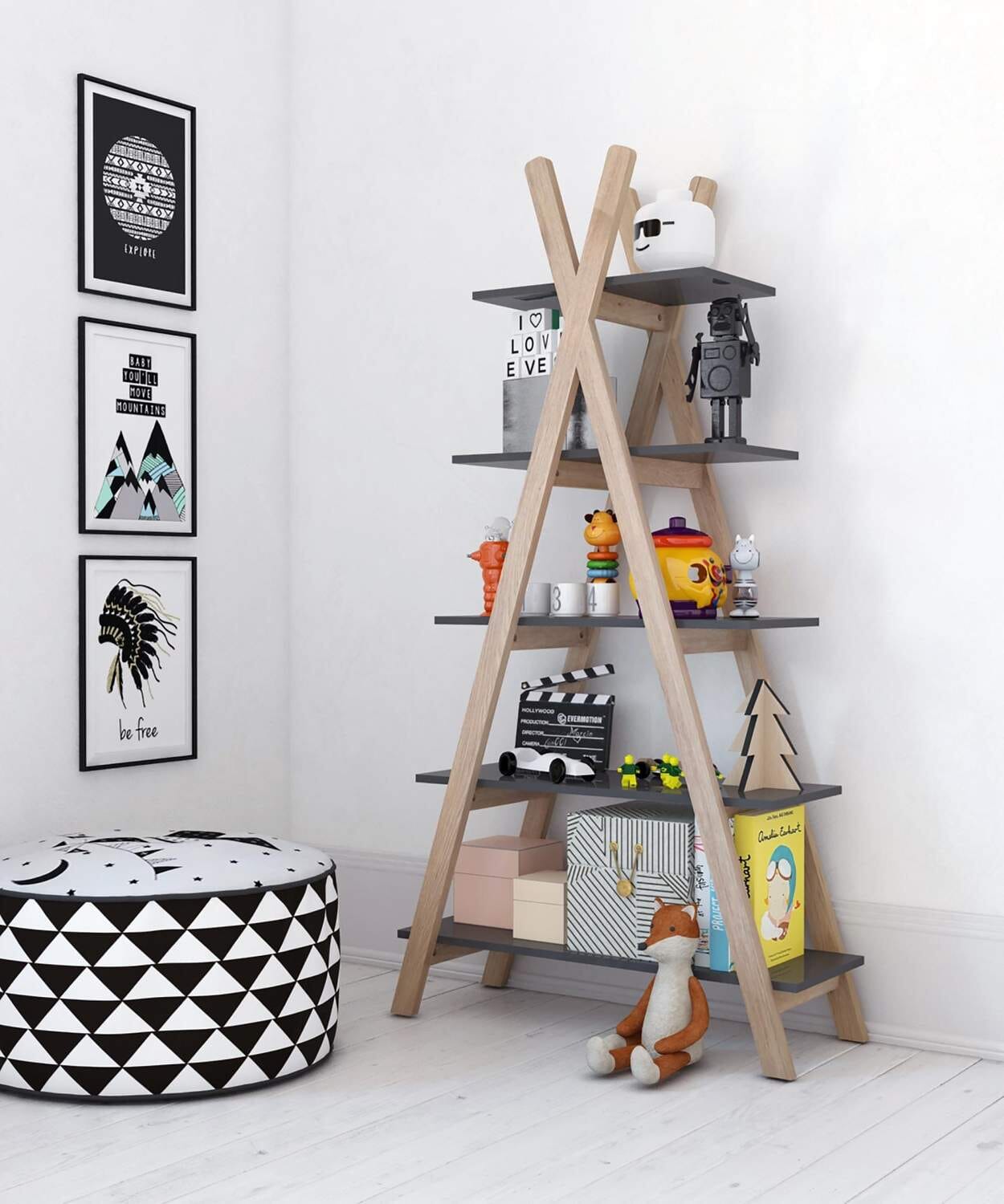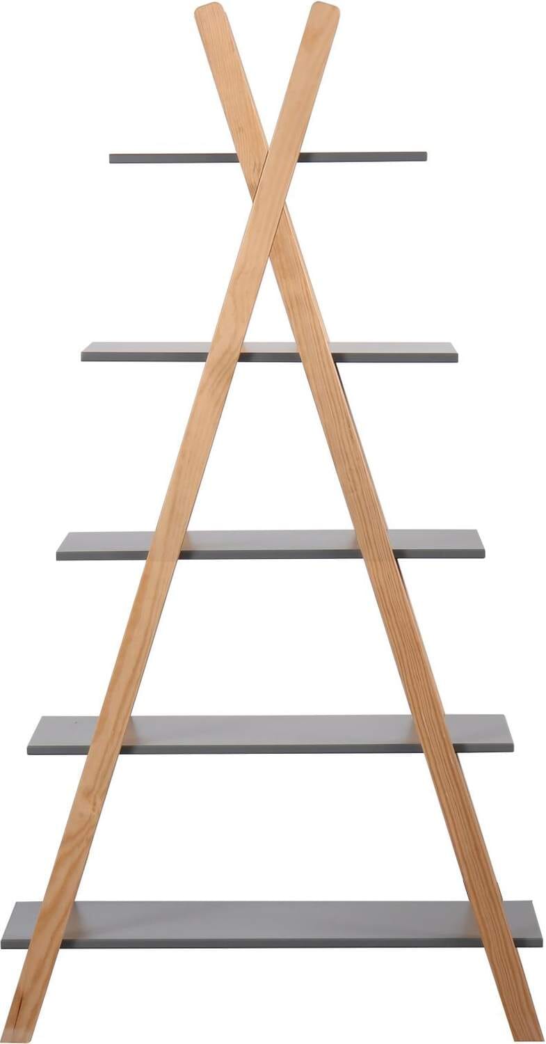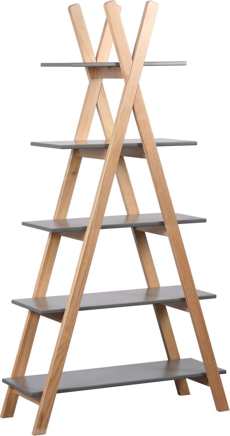 Fünf unterschiedlich lange Regalböden bieten jede Menge Platz für Bücher, Spielzeug und Dekoelemente. Die Streben aus Pinienholz sind ein natürlicher Kontrast zu den grau lackierten MDF Böden. Das nordisch-moderne Design des Regales passt in viele Kinderzimmereinrichtungen und wird dort zum Hingucker. Auch frei im Raum gestellt, z.B. als Raumteiler macht das zeltförmige Regal eine gute Figur.