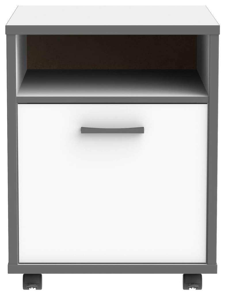 Der Rollcontainer KEFLAVIK weiß ist die perfekte Ergänzung zu den anderen Möbeln der eleganten KEFLAVIK weiß Reihe. Mit einem offenen Fach über der großen Tür bietet er viel Stauraum. Und den können Sie dank der vier robusten, langlebigen und leicht laufenden Rollen überall dorthin schieben, wo Sie ihn gerade brauchen. Optisch fügt sich der graue Korpus mit den weißen Türen vor allem in junge und moderne Wohnstile ein.