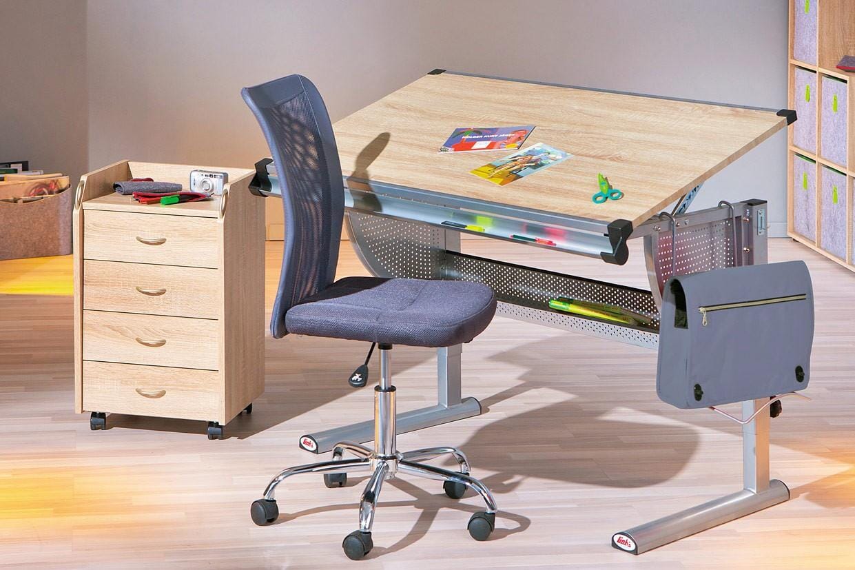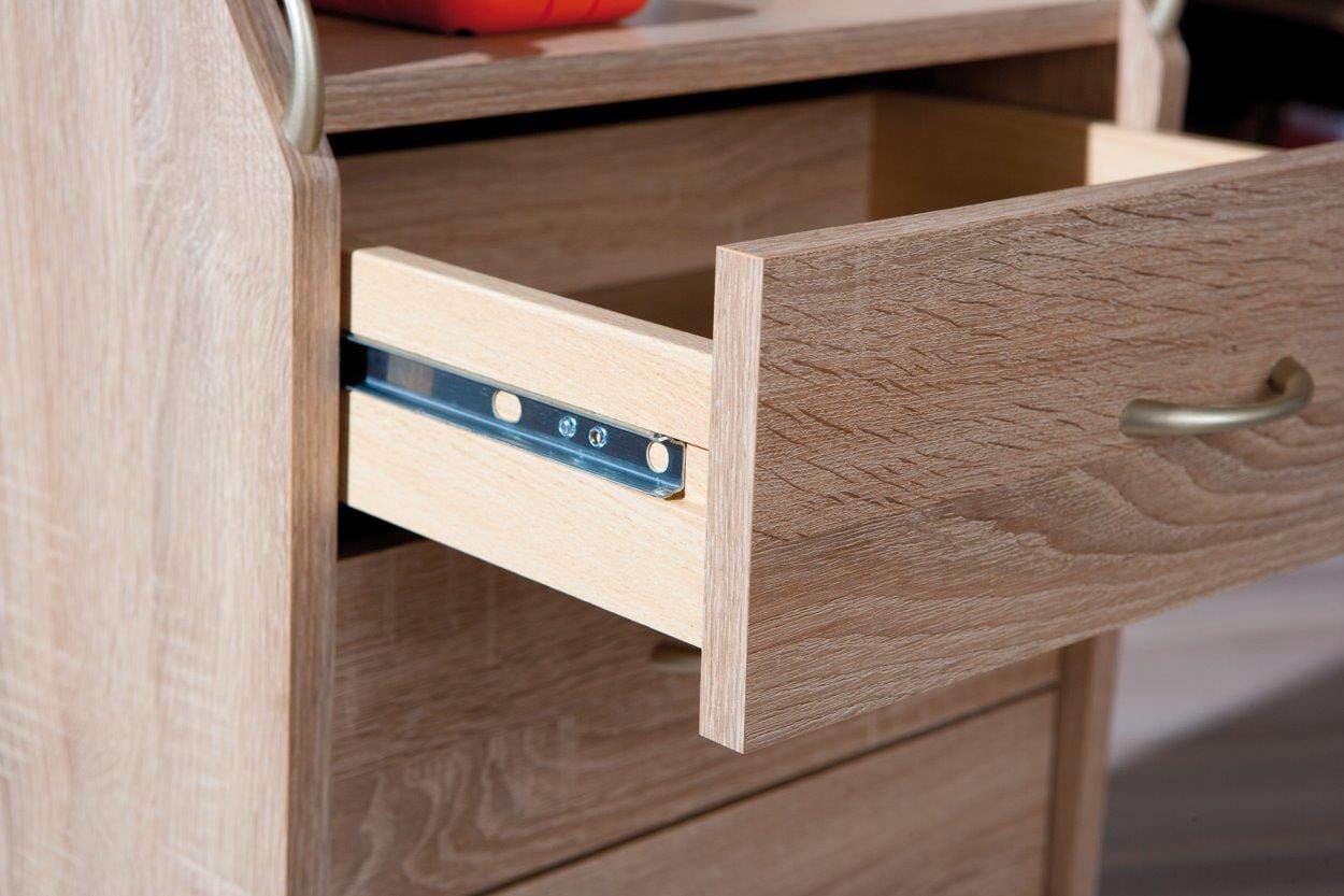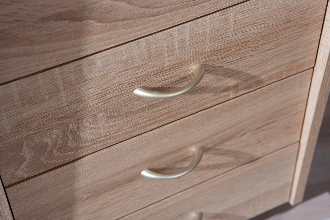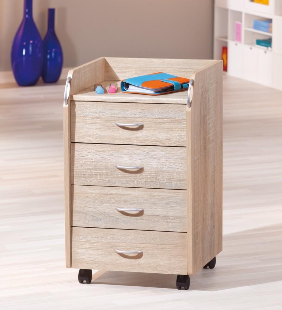 Hinzu kommt die freundliche Farbgebung, Sonoma Eiche Nachbildung, die dem tristen Büro Einerlei keine Chance gibt. Spanplatte plus Dekor, so sieht es aus! In den vier Schubladen können Sie alles verstauen, was aus den Augen - aber nicht aus dem Sinn - sein soll. Oben haben Sie alles griffbereit. Die praktischen Möbelrollen sorgen für Mobilität im Einsatz. Und auch etwas Schmückendes darf nicht fehlen: die silberfarbenen Kunststoffgriffe.