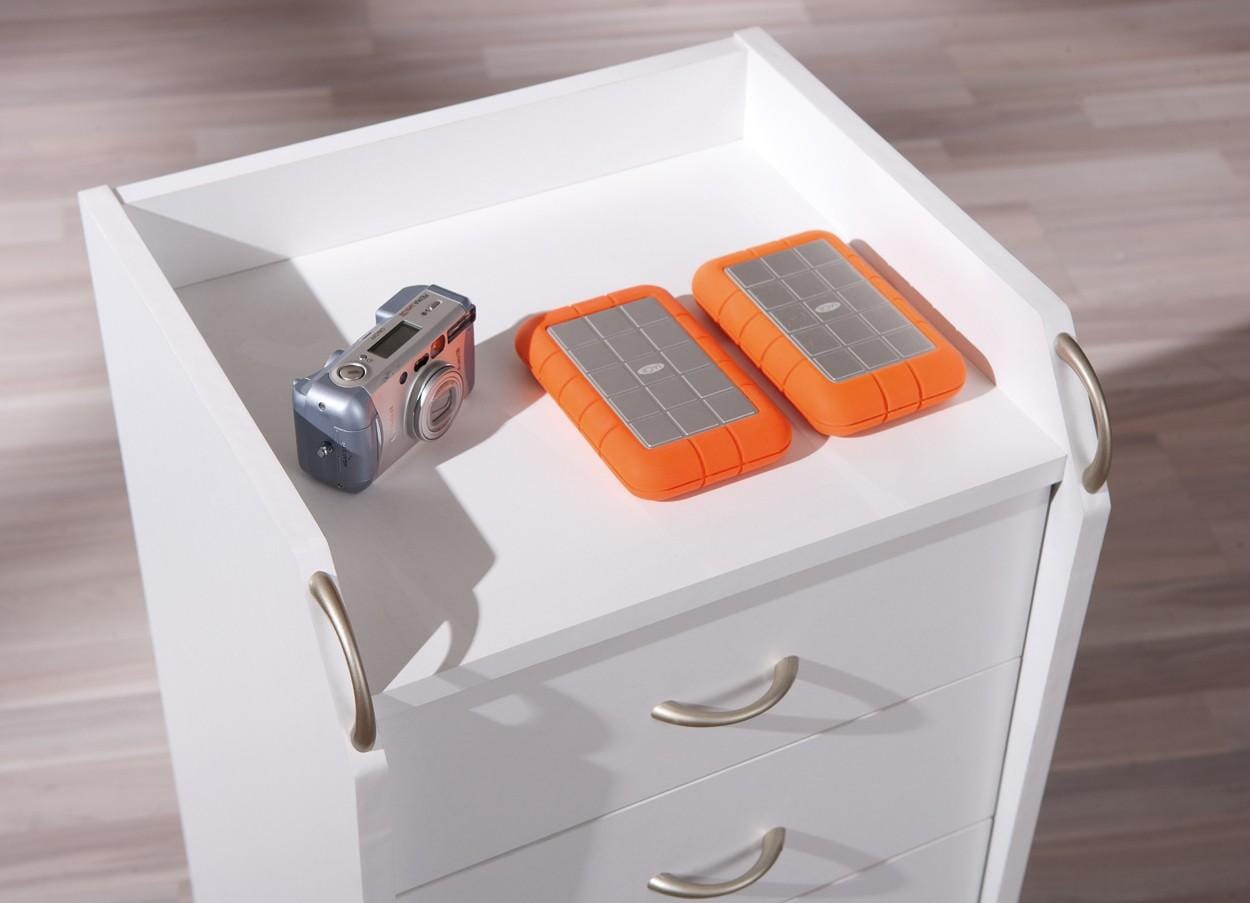 Aber nicht nur in seinem Inneren sorgt dieser Container für Freude. Oben drauf wird es erst so richtig nett, denn dort können Sie schnell alles deponieren, was Sie gerne zur Hand haben möchten. Für die Haltbarkeit zeichnet hier das Material Spanplatte verantwortlich, das noch einmal beschichtet wurde, und zwar in strahlendem, klarem Weiß.