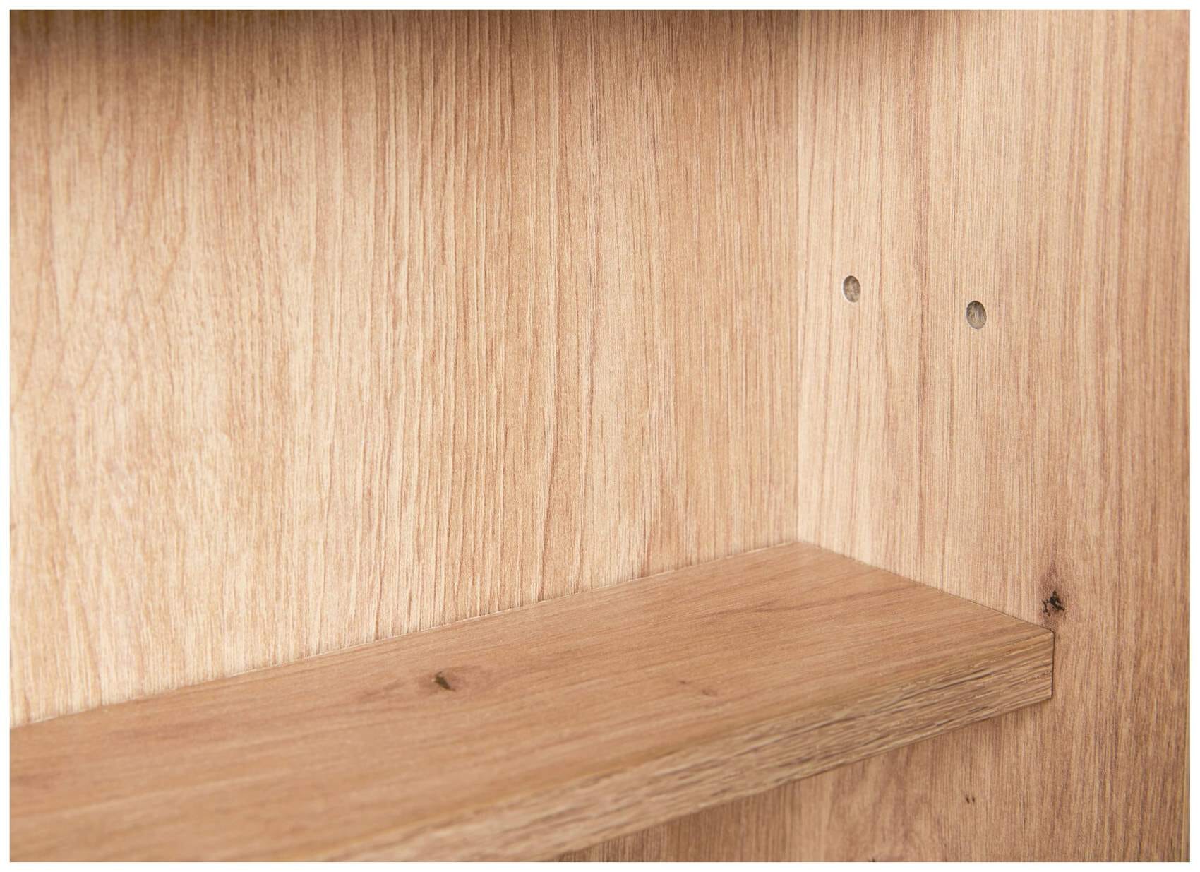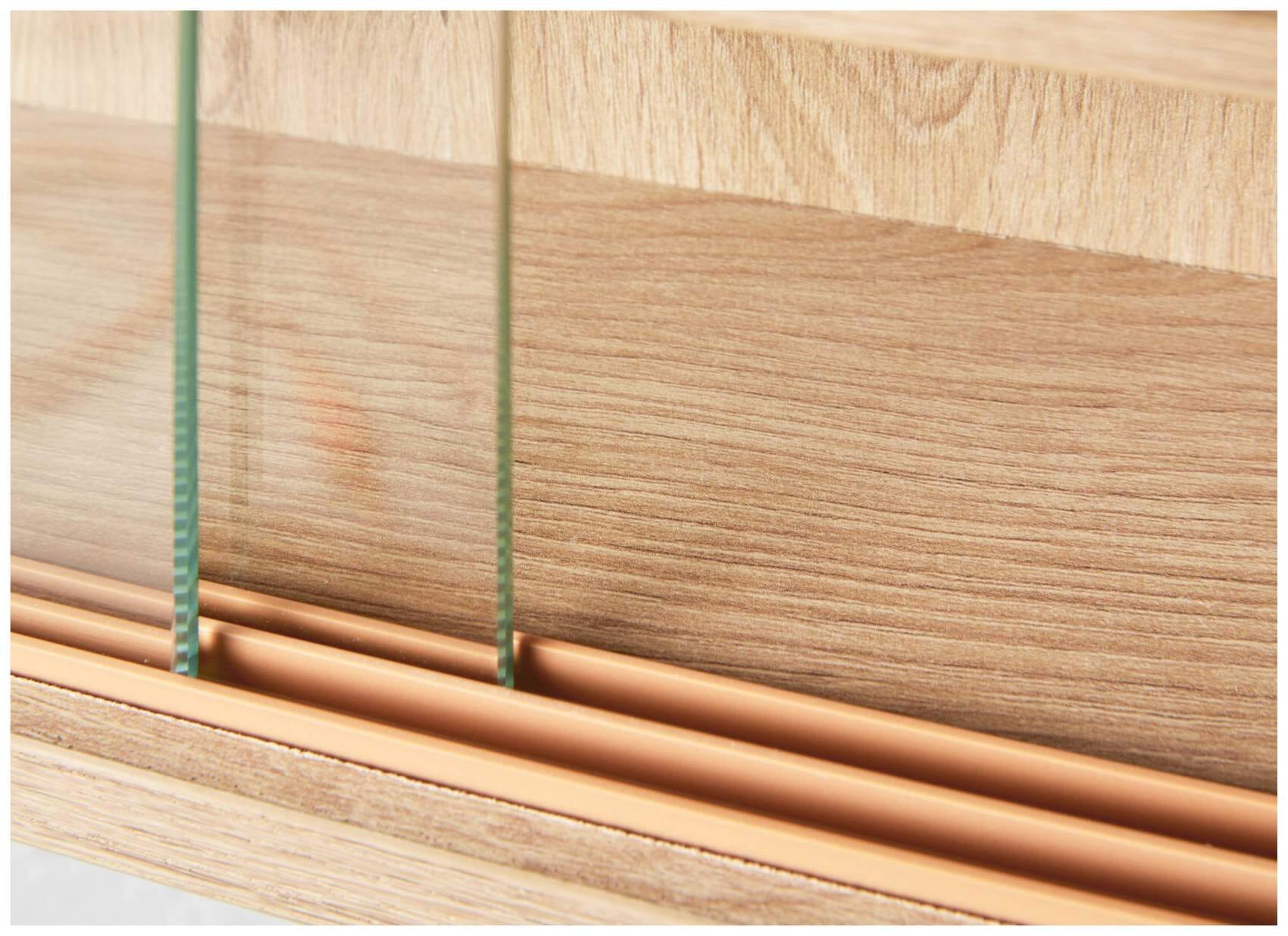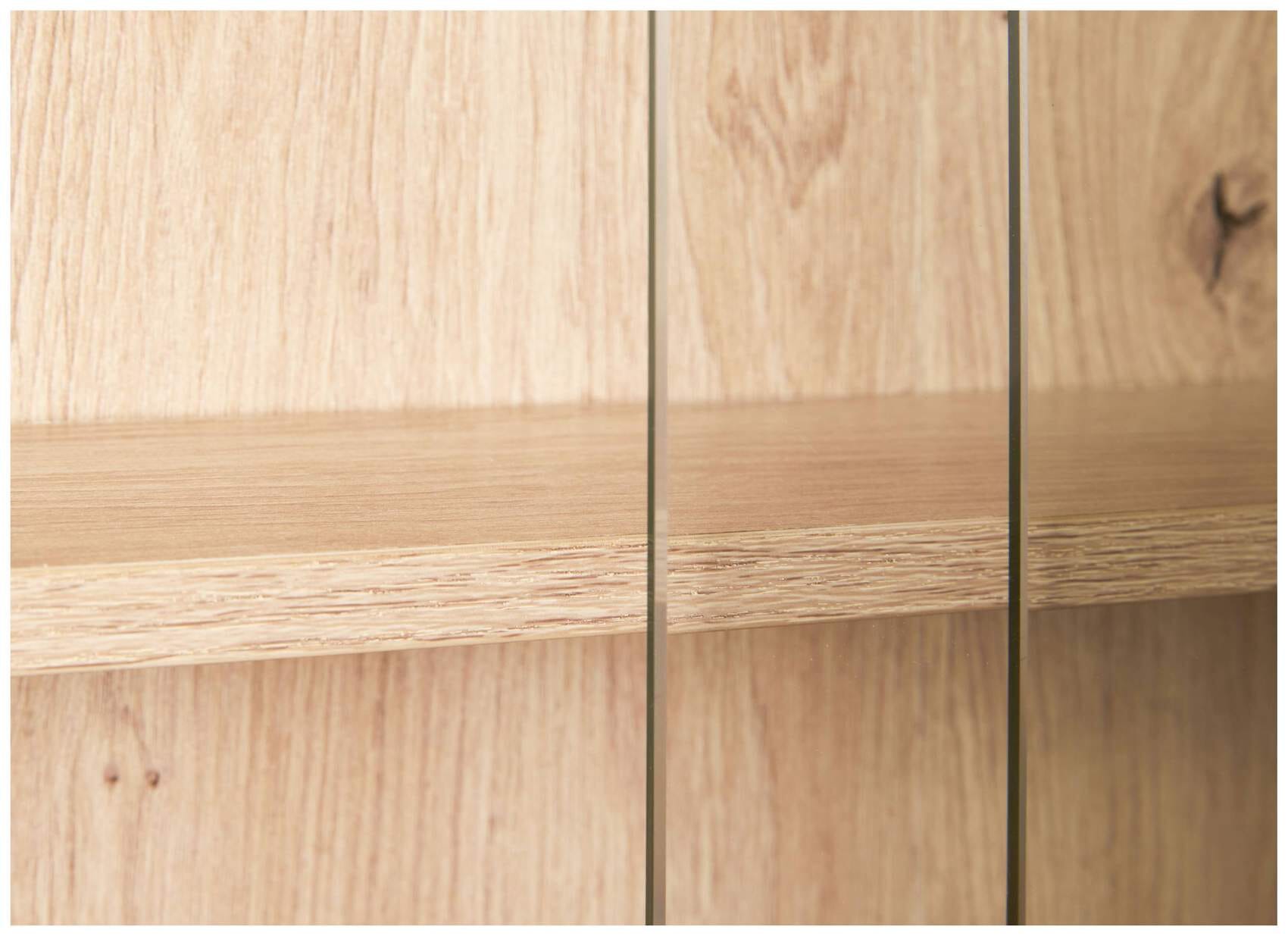 Besonders schön ist der Hintergrund, der in einem hellen, sehr natürlich wirkenden Artisan Eiche Optik gehalten ist. Sie haben hier also ein Möbel, das ein wenig nach Landhaus wirkt, das aber auch durch die beiden Glastüren einen hohen praktischen Nutzen aufweist.