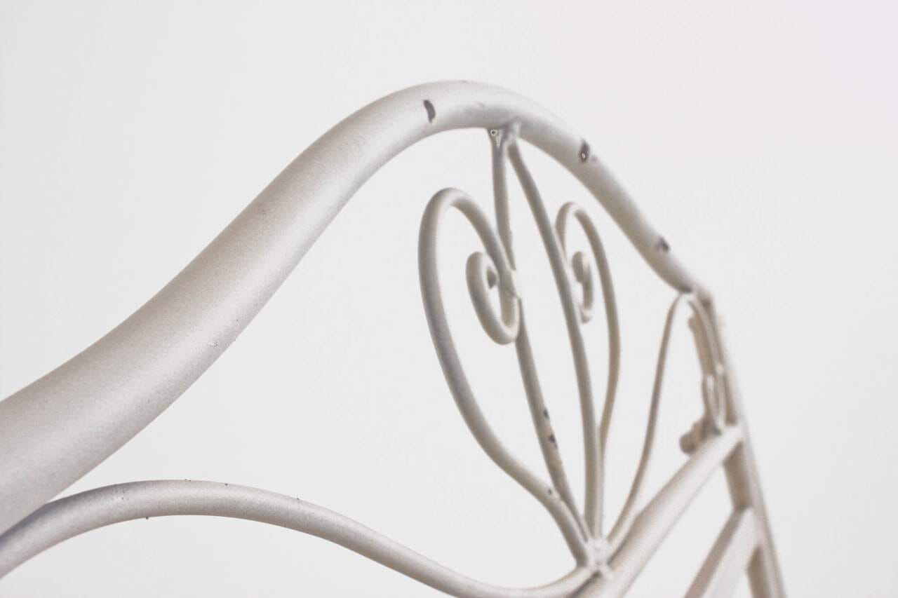 Der Stuhl ist aber nicht nur super gemütlich, er sieht auch noch schick aus. Alles rund, alles fein und luftig. Mit oder ohne Kissen ist dies ein Komfortmöbel. Haltbares Metall wurde Antik-Weiß lackiert, ein bisschen "Geschichte" macht sich eben immer gut.