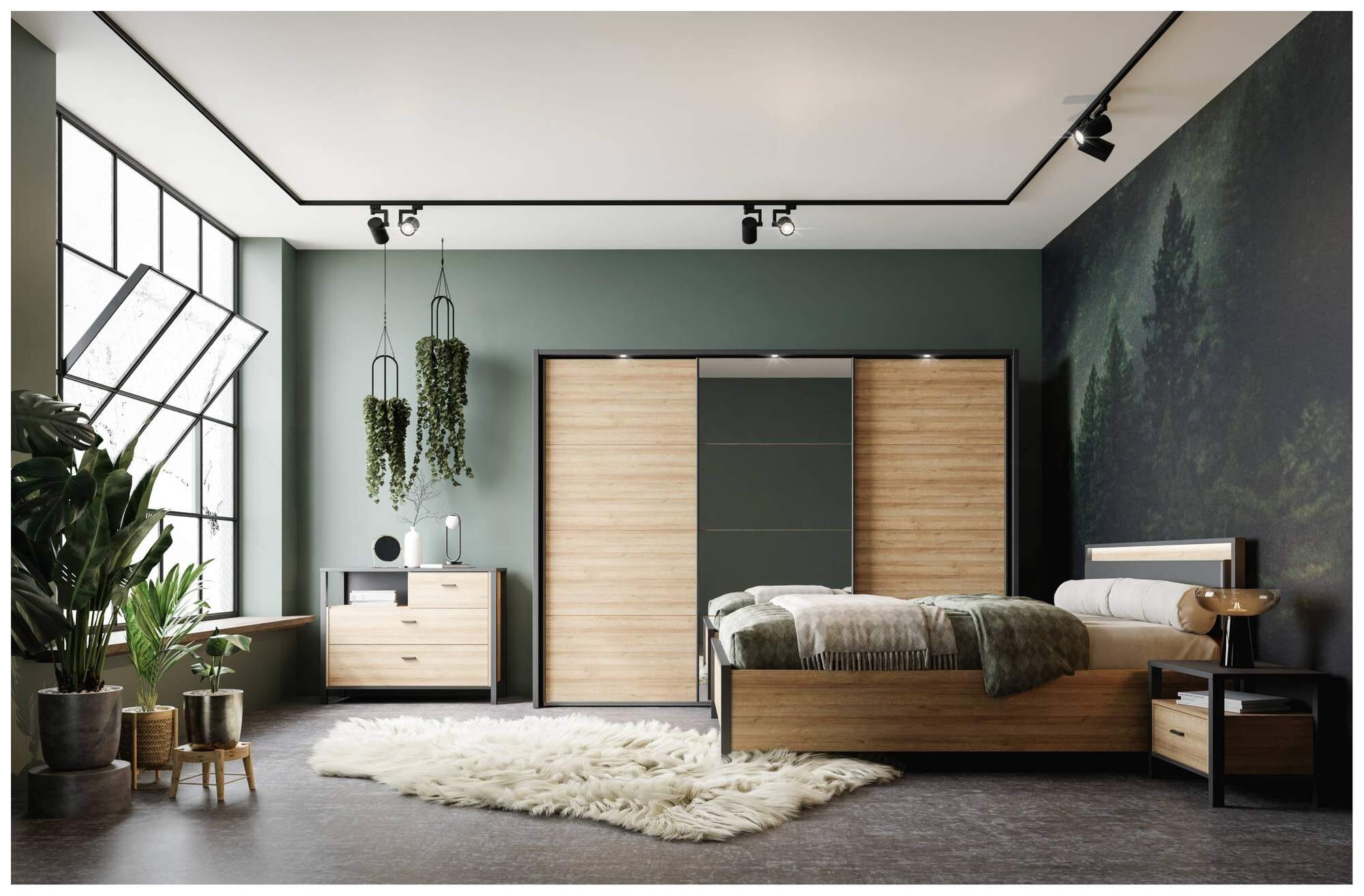 Die beiden Nachtkommoden bieten mit ihren Schubladen und Ablagen ausreichend Platz für Bücher und andere persönliche Gegenstände. Das Bett mit einer Liegefläche von 160 cm wird Sie sowohl tagsüber als auch nachts begeistern. Der Schwebetürenschrank ist ein wahres Raumwunder, das mit seinen drei Türen für ausreichend Stauraum sorgt und durch einen ansprechenden Rahmen ergänzt wird. Eine attraktive Schubladenkommode bietet zusätzlichen Platz für Ihre Lieblingsstücke.