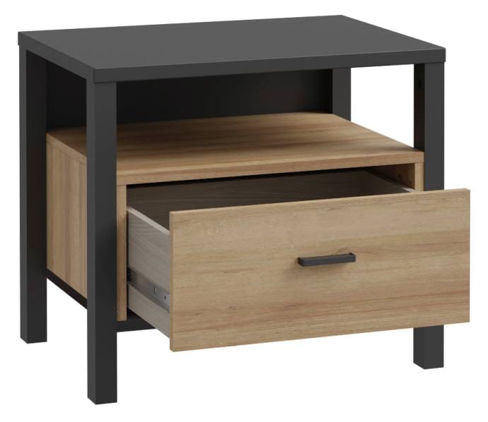 Rahmen, Füße, Ober- und Rückseite sind in tiefem Schwarz gehalten, während Tür, Seiten und ein Teil des offenen Fachs in edler Riviera-Eiche erstrahlen. Die Kombination von hell und dunkel und der fast industrielle Look der High Rock Serie findet vor allem bei Puristen und Fans moderner, geradliniger Designs Anklang.