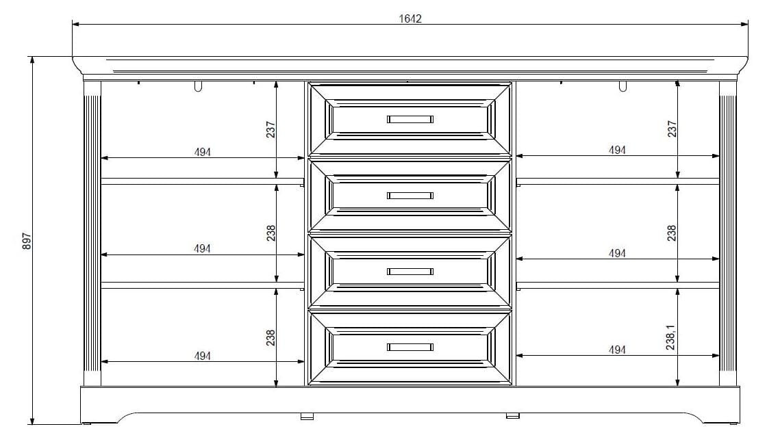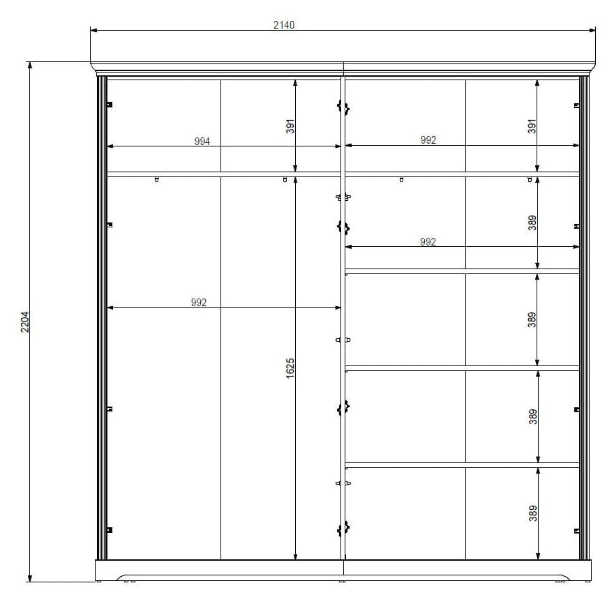 - Mitte: 1 Montageboden, 3 Einlegeböden verstellbar