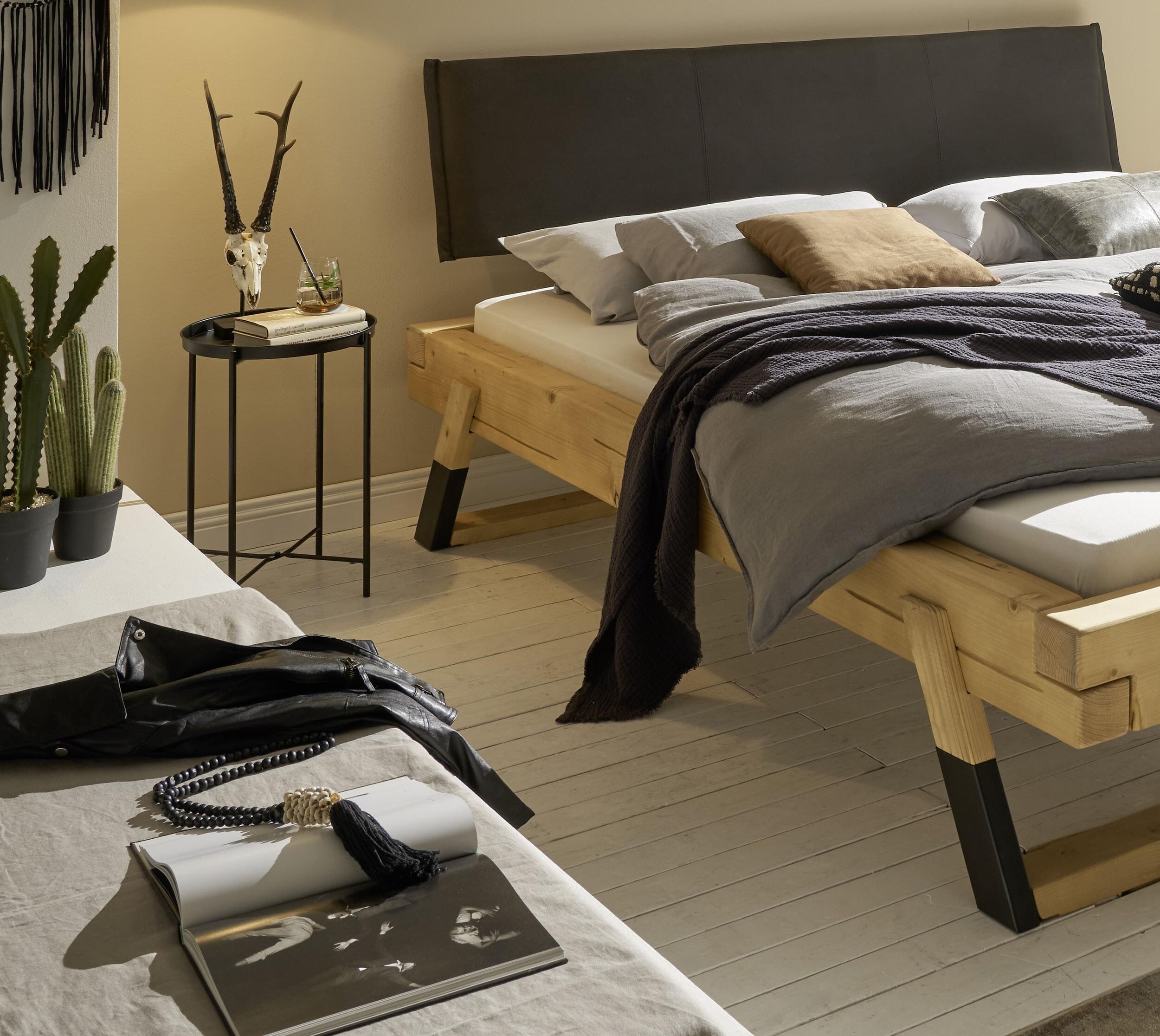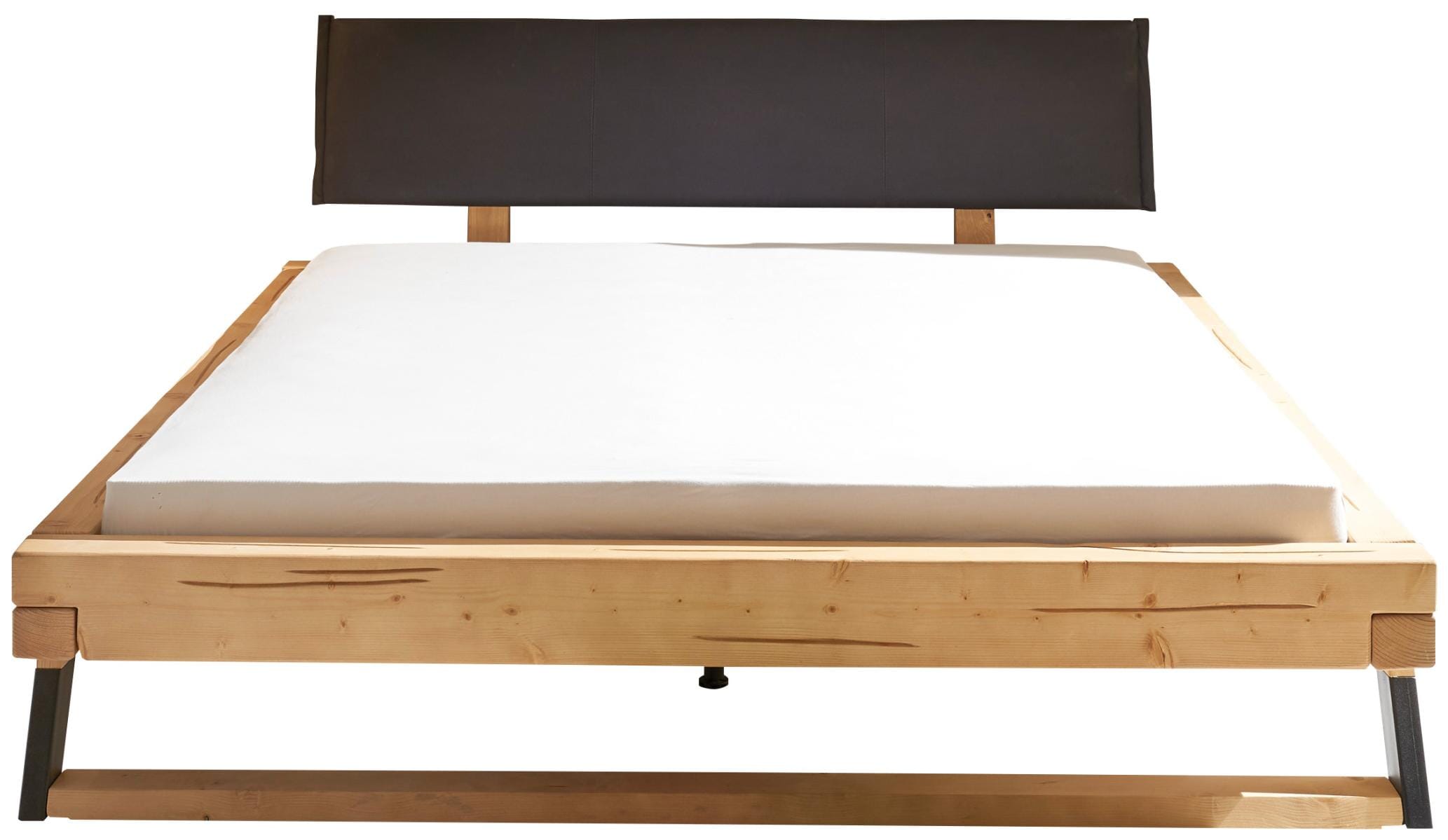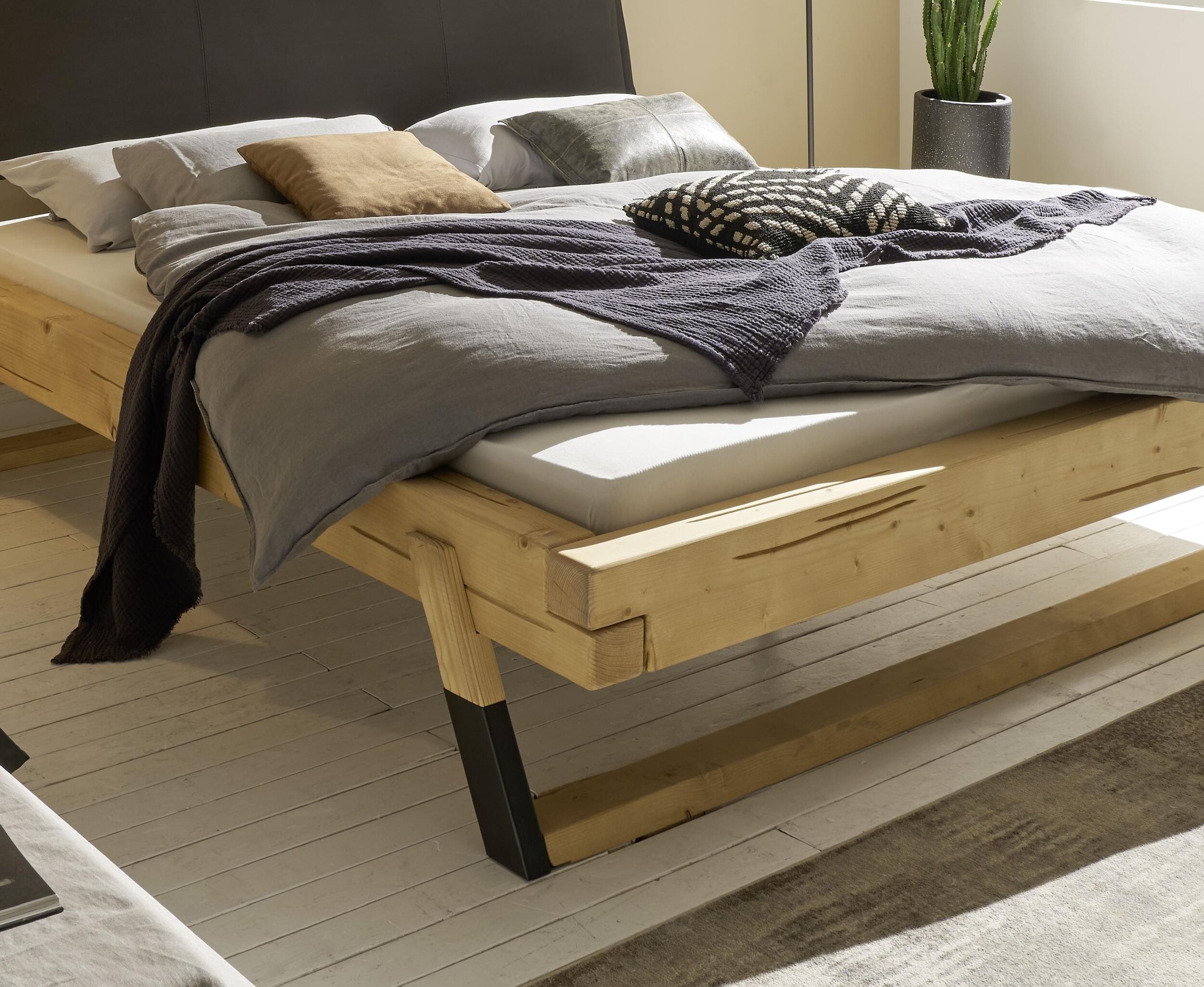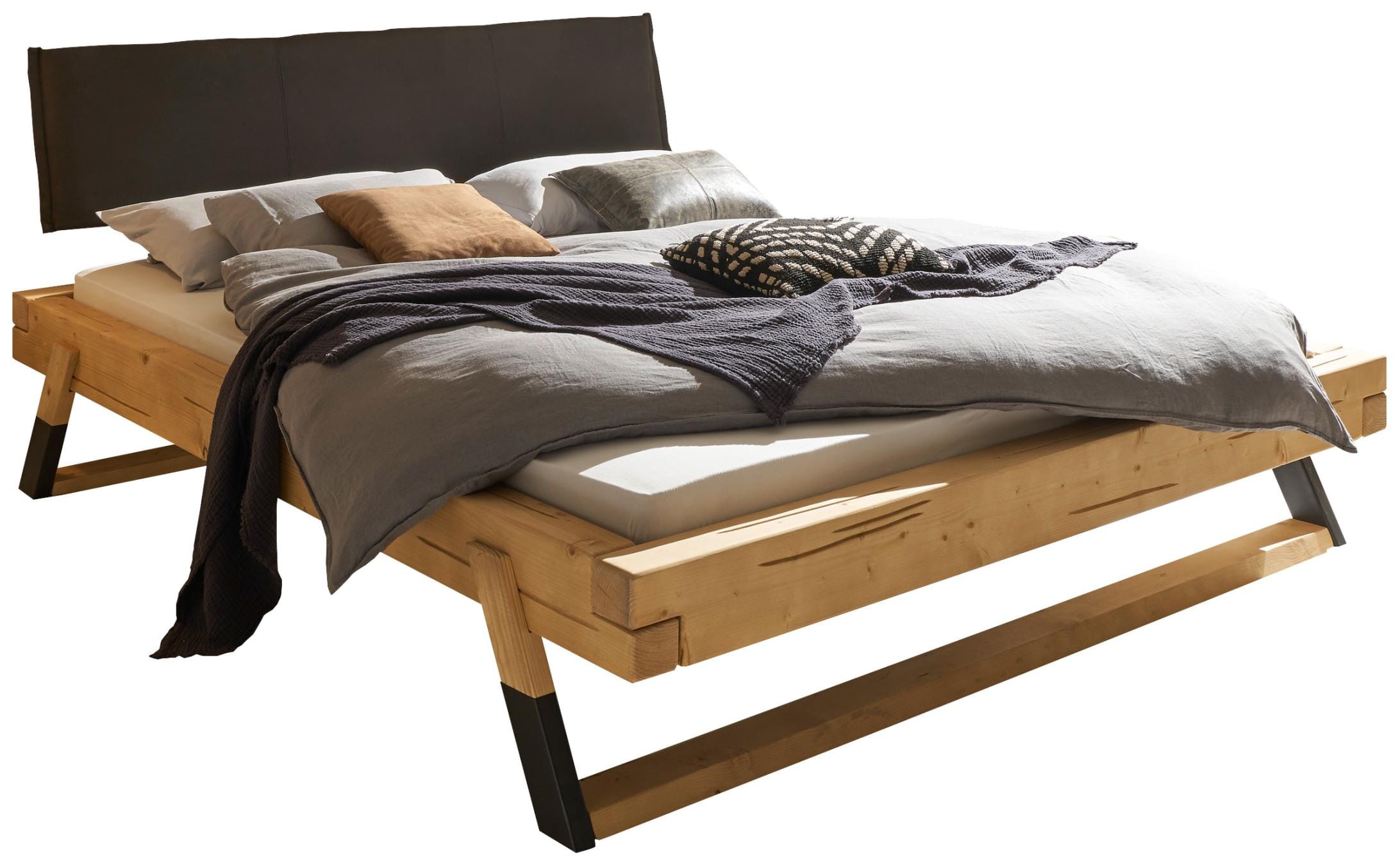 Gefertigt aus massiver Fichte, besticht das LOBIA Bett durch seine einzigartige Ästhetik: Die warmen Töne des Nadelholzes harmonieren perfekt mit den markanten, zweifarbigen und abgeschrägten Holz-Kufen. Ein besonderes Highlight ist das gepolsterte Kopfteil in stilvollem Anthrazit, das dem Bett eine moderne Note verleiht und zum Anlehnen einlädt.