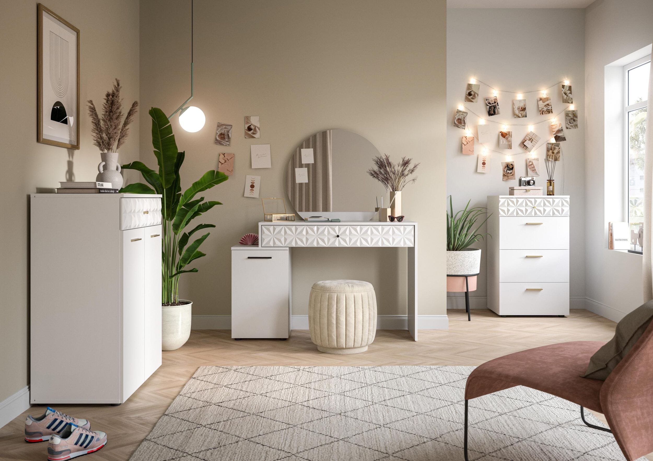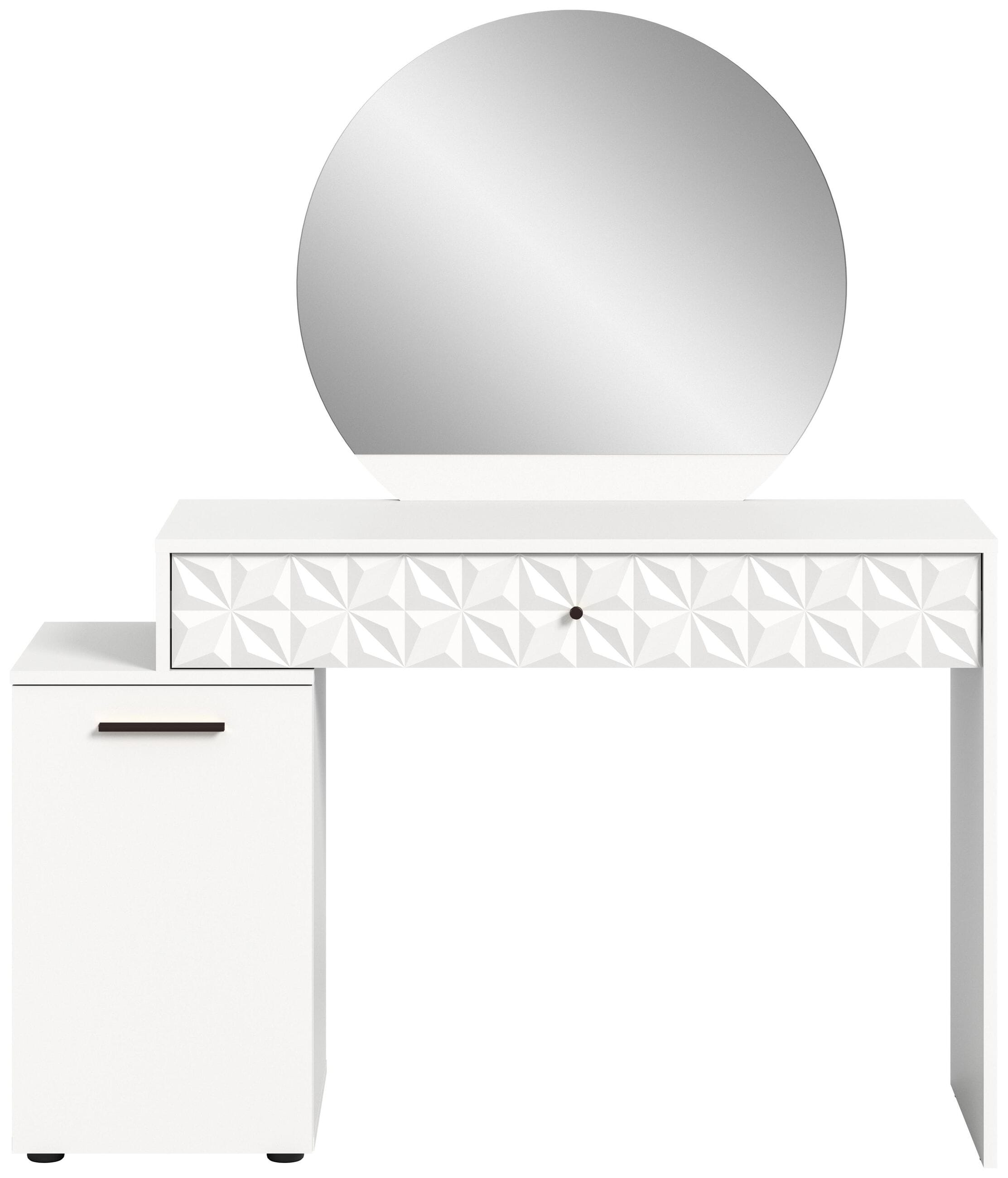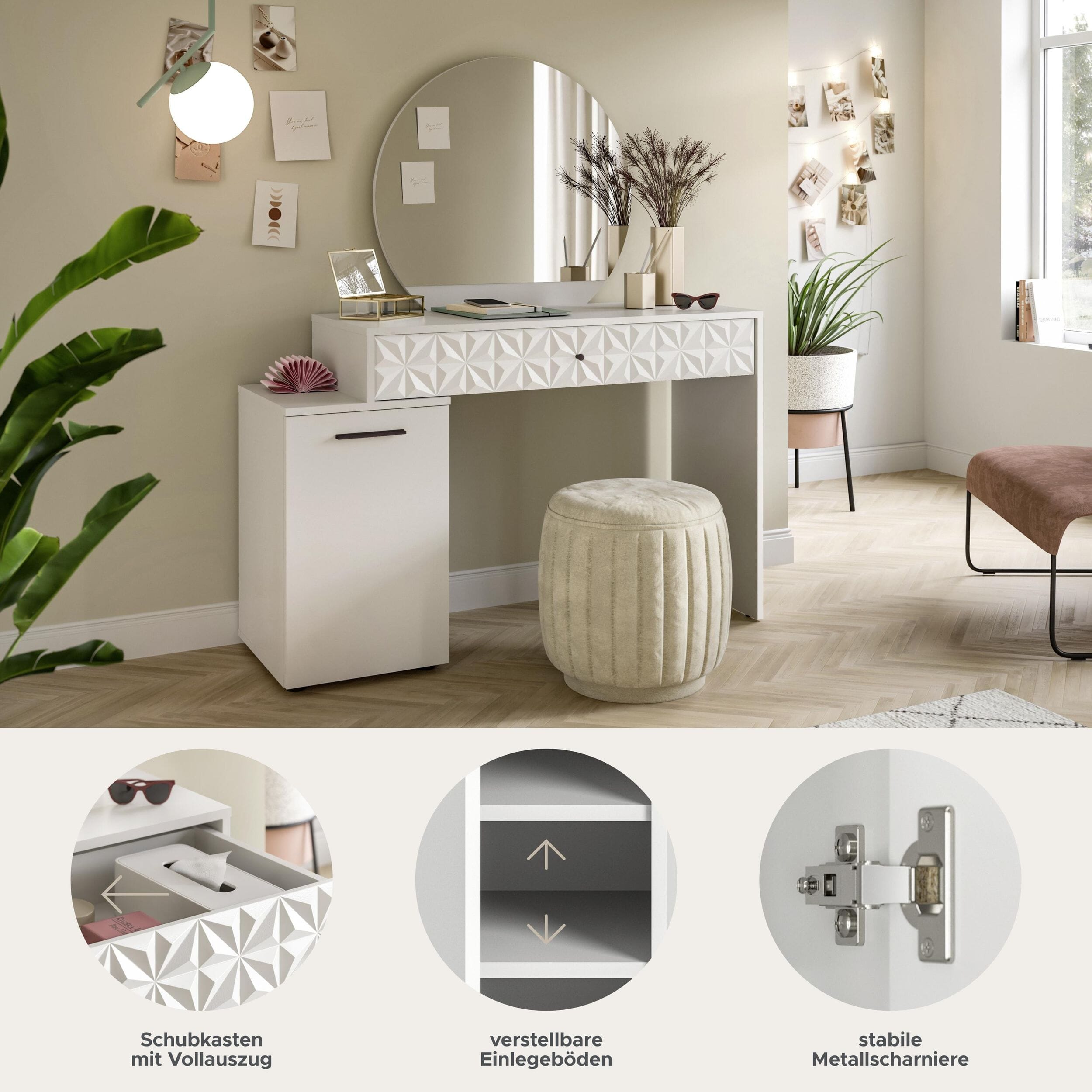 Design/Stil: Der Schminktisch in Weiß Melamin und Weiß Hochglanz präsentiert sich mit einem modernen und eleganten Design. Die Kombination aus mattem und glänzendem Finish verleiht dem Schminktisch eine zeitgemäße Ästhetik