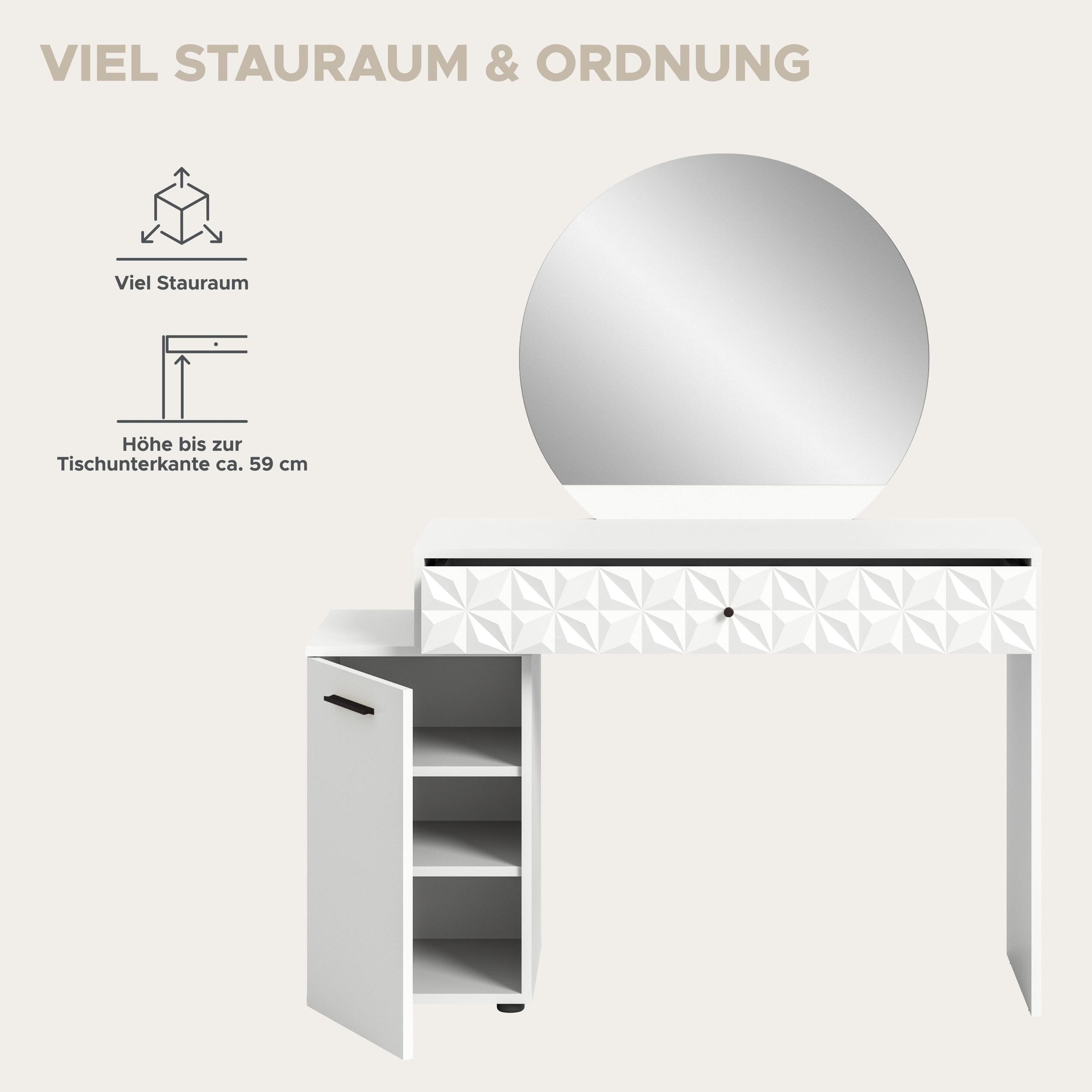 Funktionalität: Der Schminktisch bietet eine durchdachte Funktionalität mit großzügigen Ablageflächen, Schubladen und Fächern, um Kosmetikartikel, Schmuck und Accessoires ordentlich zu verstauen. Der große Spiegel ermöglicht eine optimale Nutzung beim Schminken.