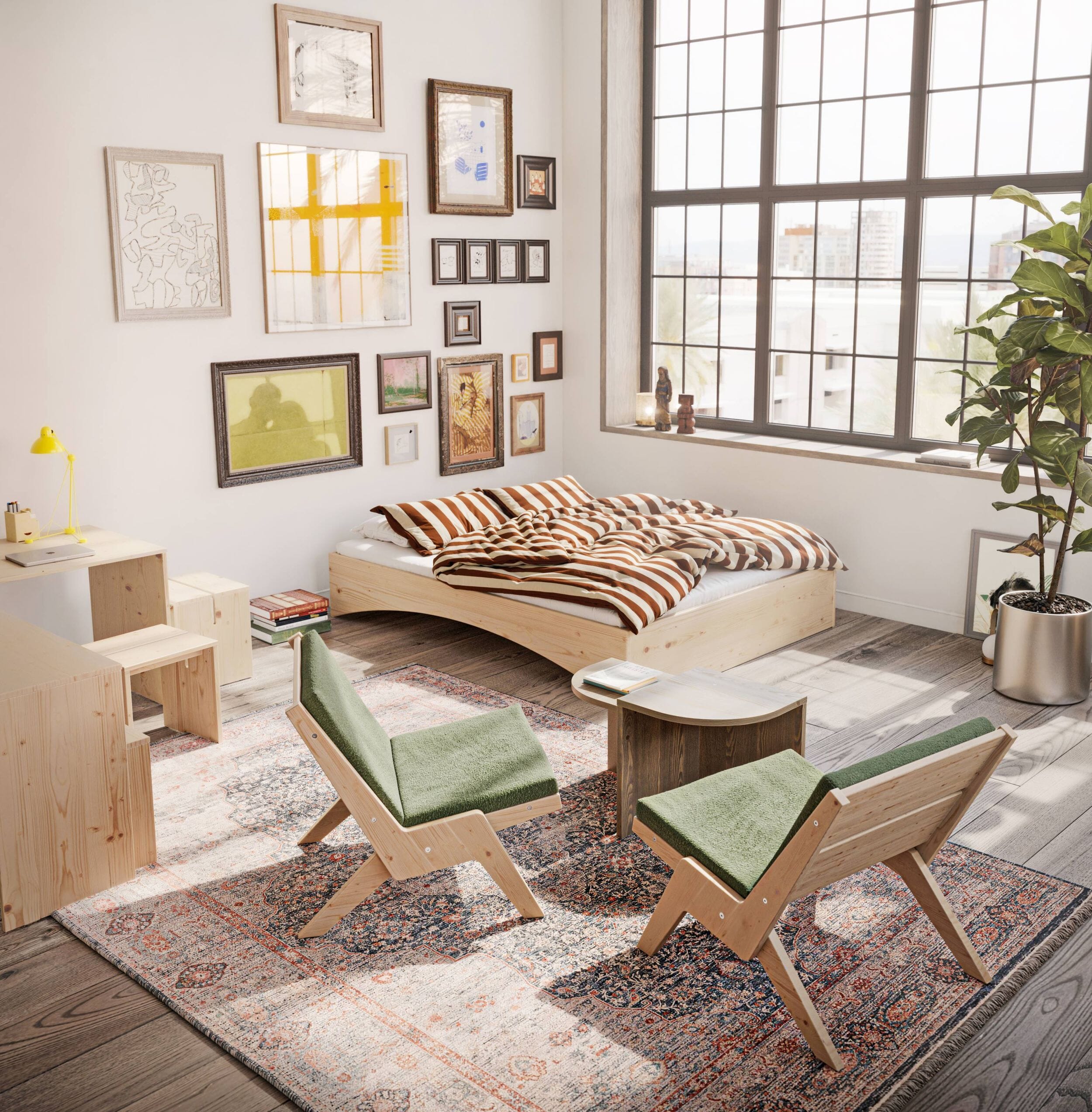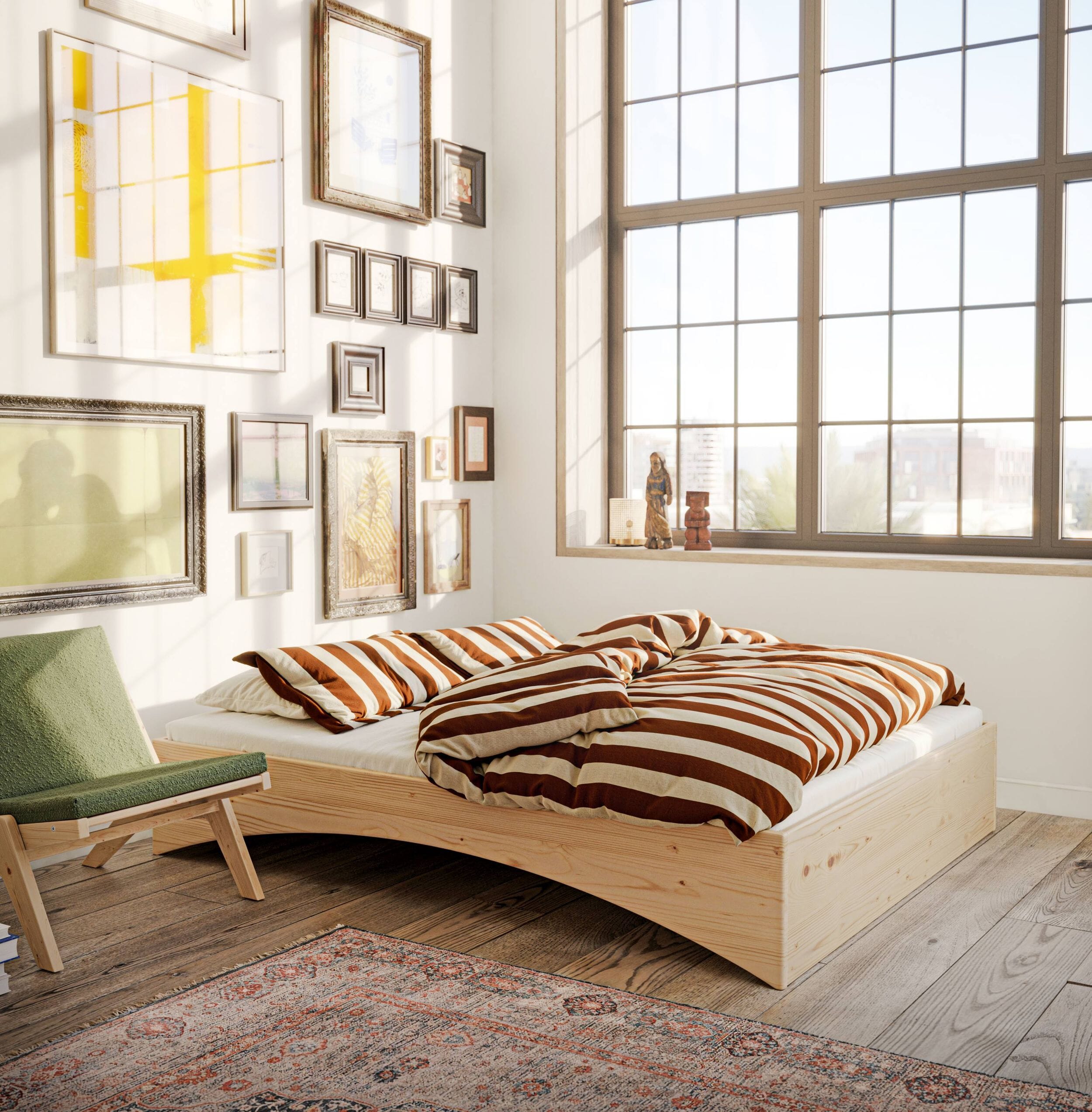 Der charakteristische Bogen des Bettes verleiht ihm Leichtigkeit und skulpturale Eleganz, während das unbehandelte, massive Kiefernholz Wärme und ehrliche Handwerkskunst ausstrahlt.