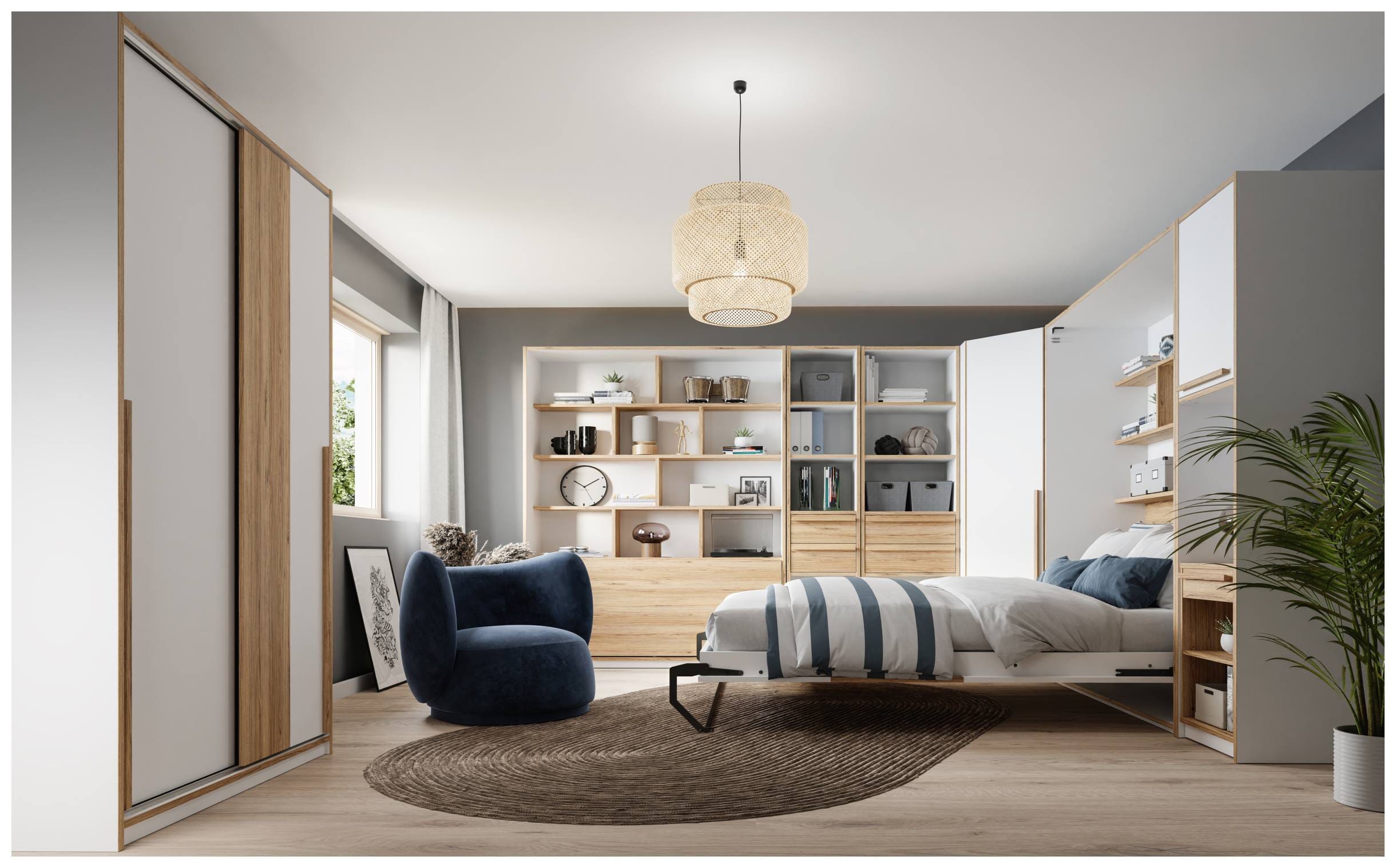 Das hochmoderne Schrankbett S-ROOM verwandelt kleine Räume in wahre Multifunktionsbereiche. Ob im Jugendzimmer oder Gästezimmer, das Klappbett findet überall seinen Platz. Es ist eine kompakte und ästhetisch ansprechende Lösung für begrenzte Raumverhältnisse, ob als dauerhafter Schlafplatz oder ideales Gästebett. Durch den effektiven Aufklappmodus lässt sich das Bett bequem nach oben klappen oder in eine horizontale Position bringen, während der Federmechanismus für ein stressfreies Öffnen und Schließen sorgt.