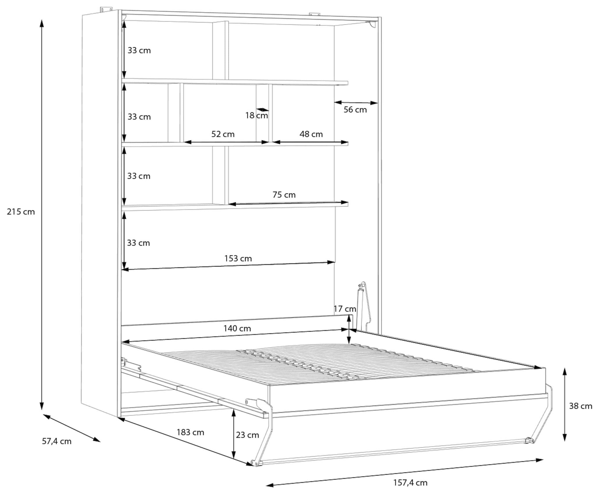 Das helle beschichtete Klappbett ist mit einem stabilen Lattenrost und einem abklappbaren Metallrahmen ausgestattet, auf dem die Liegefläche horizontal gelagert wird. Innenliegende Regalflächen bieten individuelle Dekorationsmöglichkeiten. Die Oberkante des Bettrahmens ohne Matratze beträgt 37 cm. Eine stabile Wandmontage ist zwingend erforderlich.