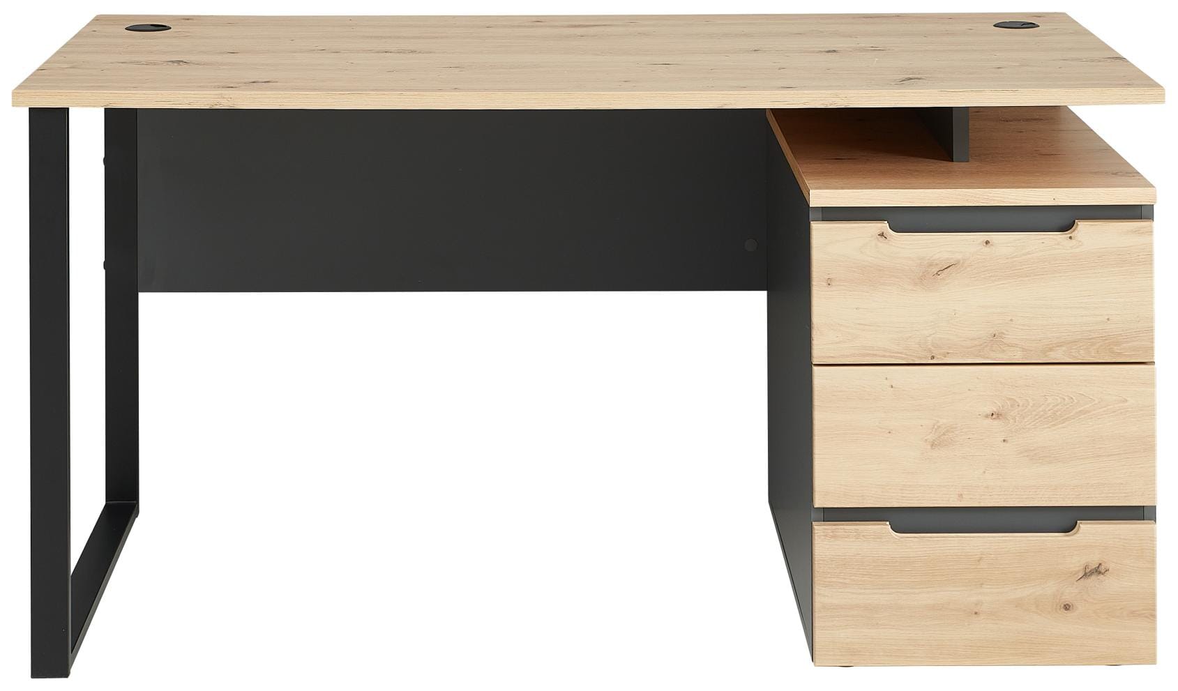 Natürlich hat der Schreibtisch praktische Kabeldurchführungen, die beiden Kabeldurchführungen auf der Tischplatte verhindern nervigen Kabelsalat und sorgen mit dem sauberen Kabelmanagement für einen aufgeräumten Arbeitsplatz.