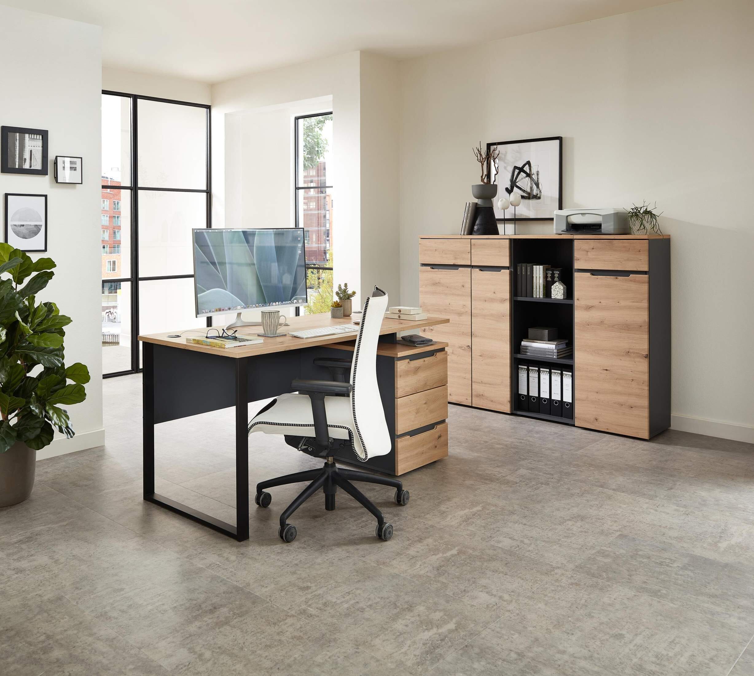 Die Serie Memphis steht für Innovatives und durchdachtes Design. Der Schreibtisch mit stabiler Tischplatte und robustem Stahlgestell, schwarz matt lackiert, passt ideal in jedes modern eingerichtete Büro und Homeoffice, aber am besten stellen Sie sich das komplette Büro aus der Memphis Serie zusammen.