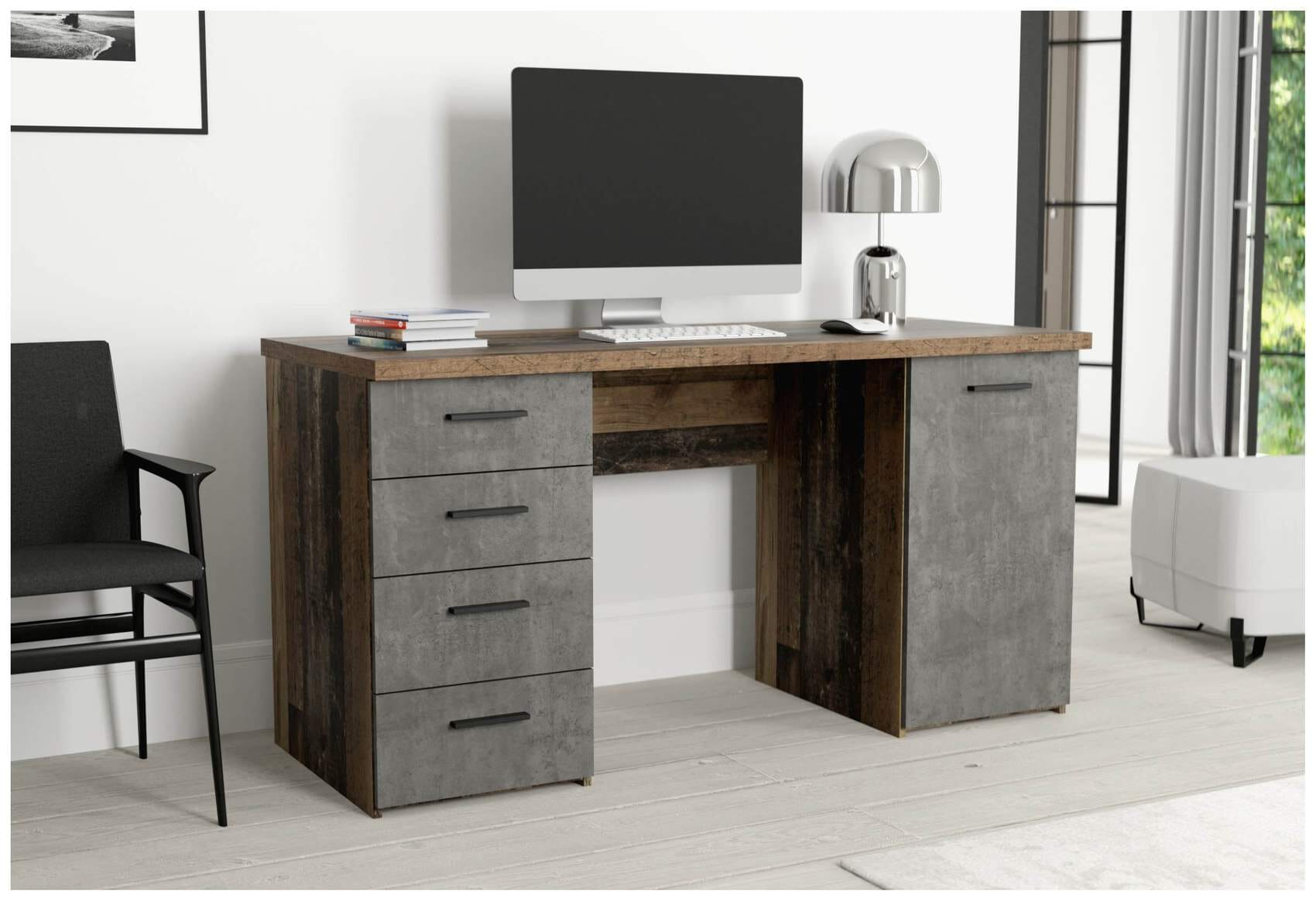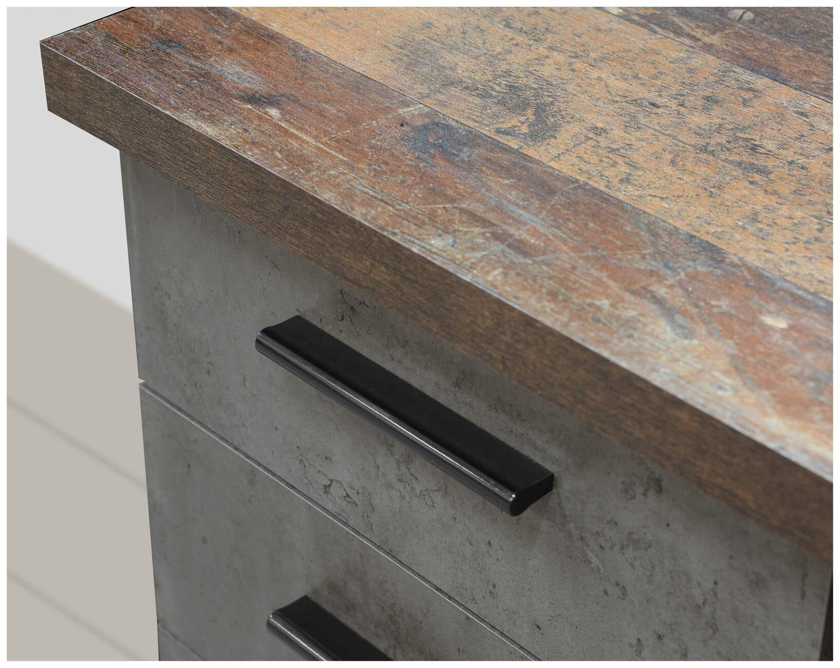 Der Schreibtisch NETBOB Old Wood kombiniert die Optik von altem, gebrauchtem Holz mit der von kühlem Beton. Doch er sieht nicht nur wunderschön aus, er erfüllt auch die Wünsche nach Stauraum. Denn er bringt nicht nur vier Schubladen auf Metallauszügen mit, sondern auch eine Tür, hinter der sich zwei Einlegeböden befinden. Die Fronten sind in Betonoptik und mit schwarzen Kunststoffgriffen versehen.