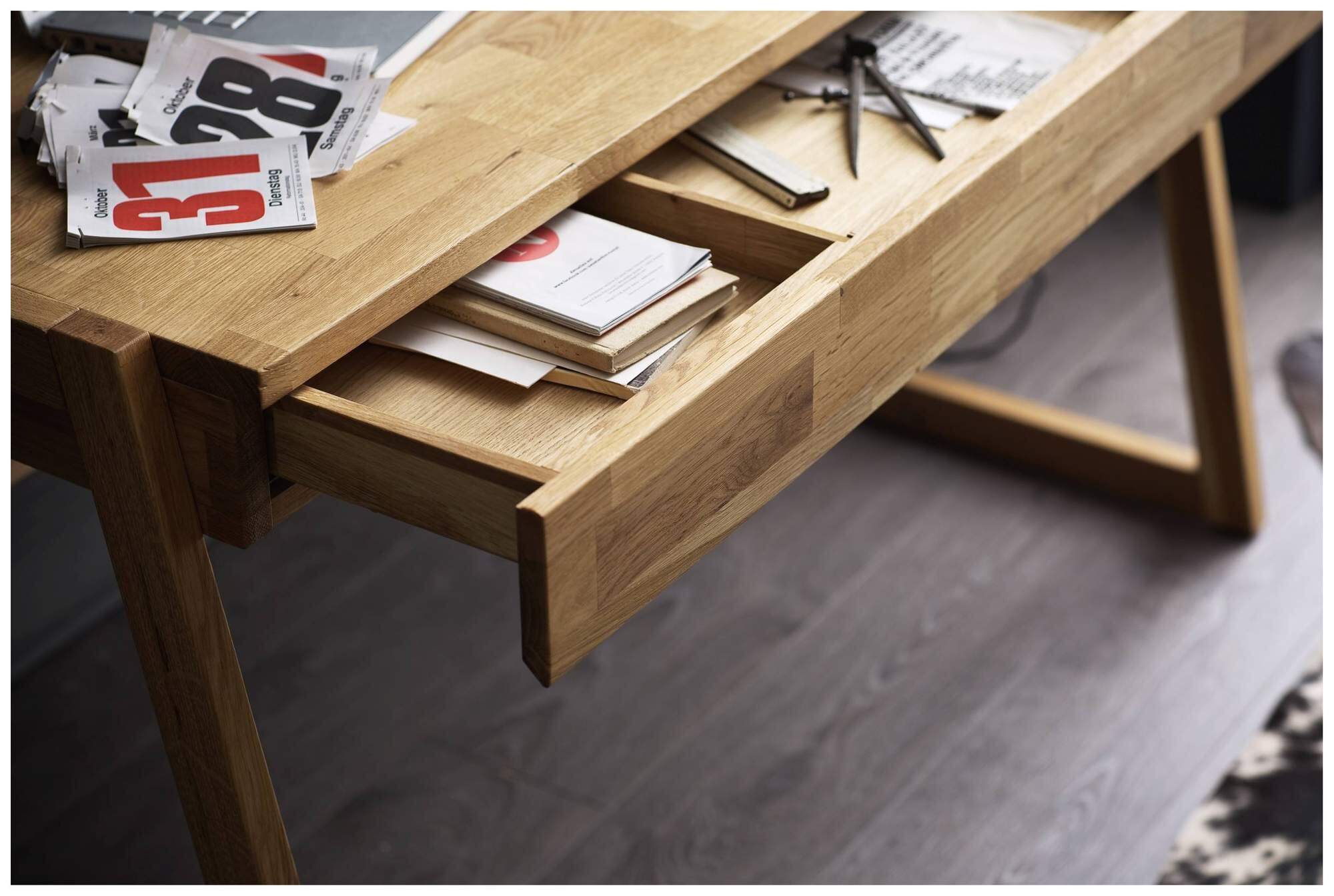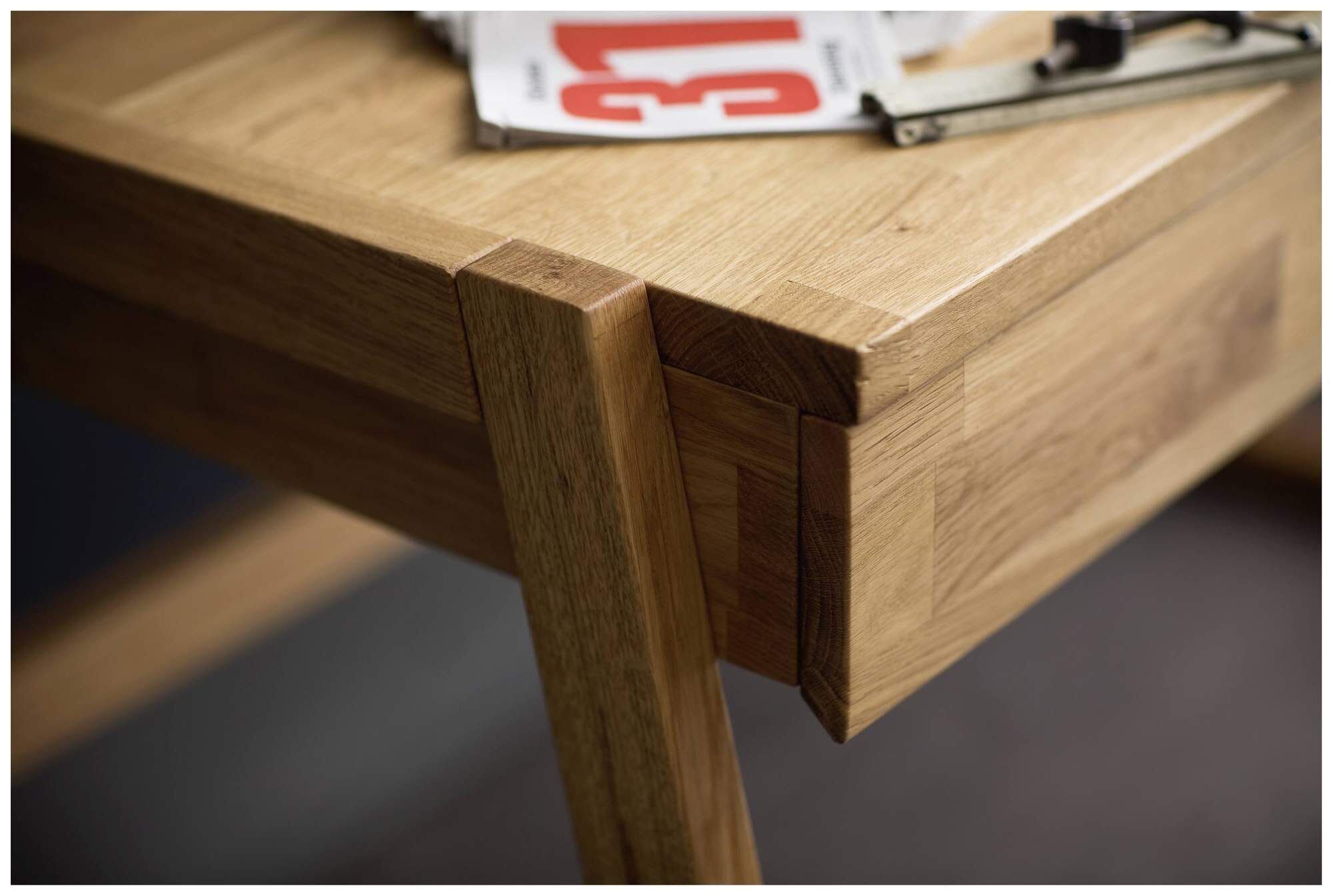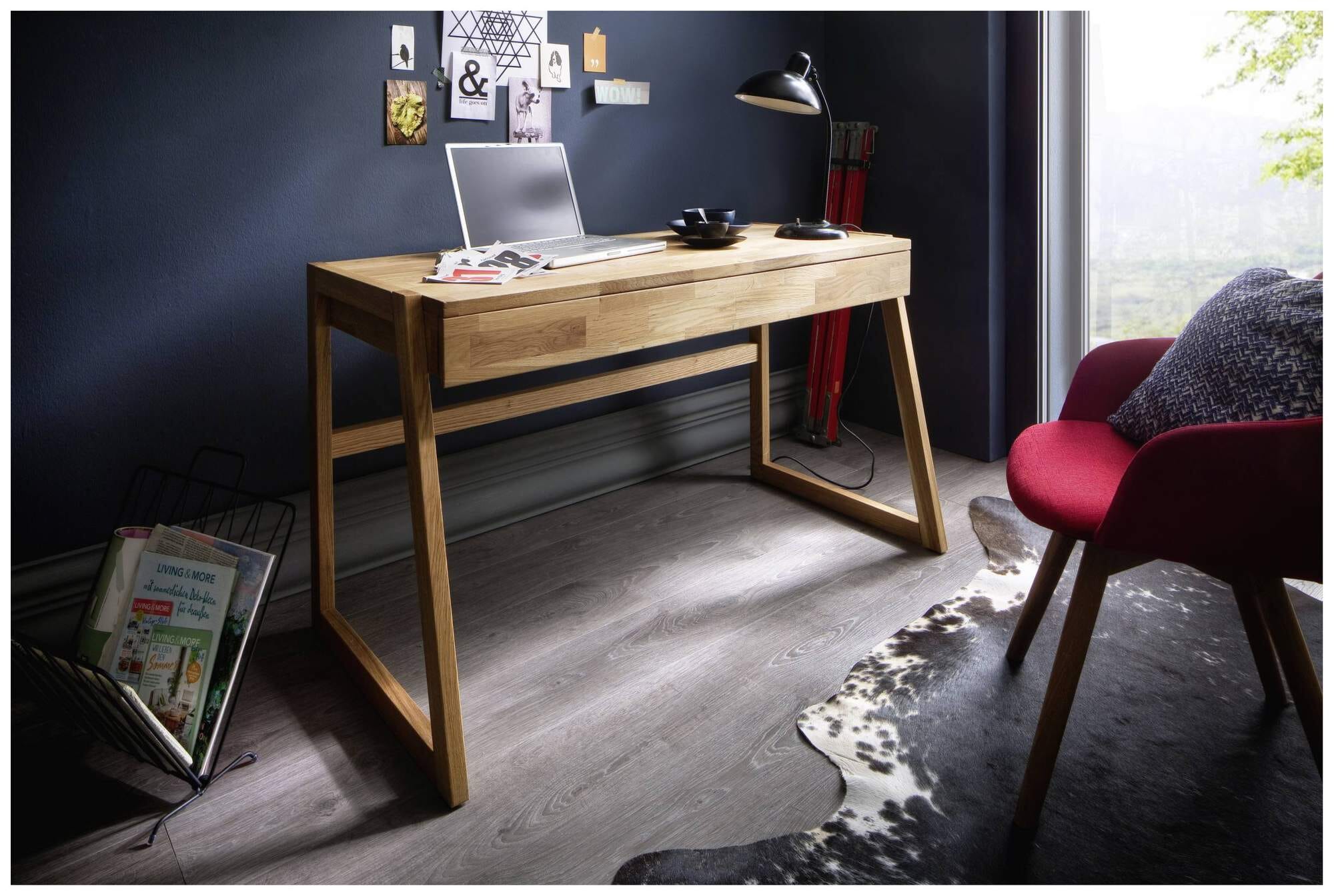 Mit seiner geräumigen Tischfläche und der praktischen Schublade bietet er ausreichend Platz für Ihre täglichen Schreibarbeiten und Hobbys. Die warme und dekorative Aufmachung aus massiver Wildeiche verleiht Ihrem Homeoffice eine gemütliche Atmosphäre und sorgt für ein angenehmes Arbeitsumfeld. Ob als Schreibtisch im Homeoffice oder als multifunktionale Arbeitsfläche im Wohnzimmer, der Schreibtisch KIRSA lässt keine Wünsche offen und ist ein Möbelstück, das Sie nicht mehr missen möchten.
