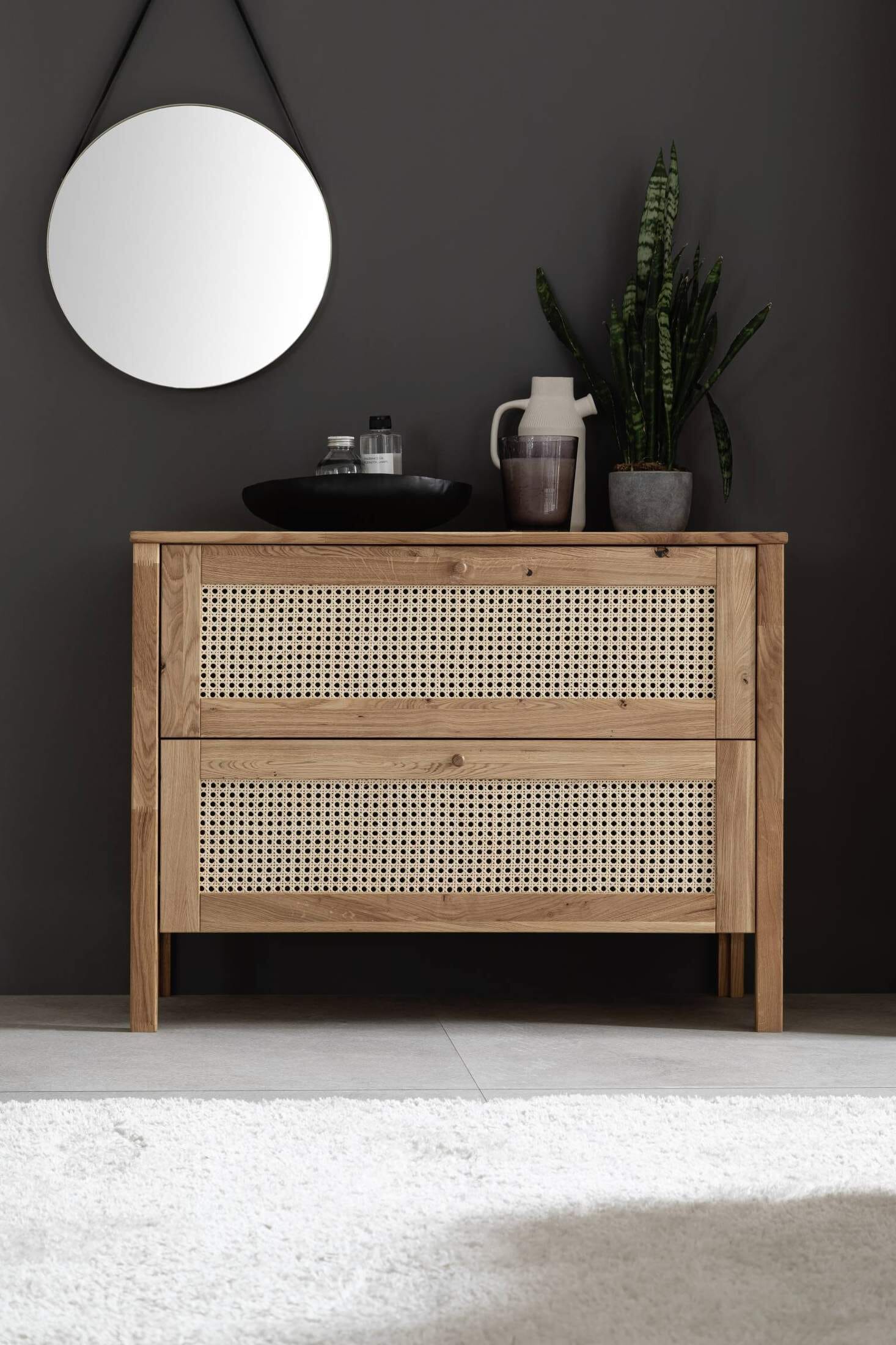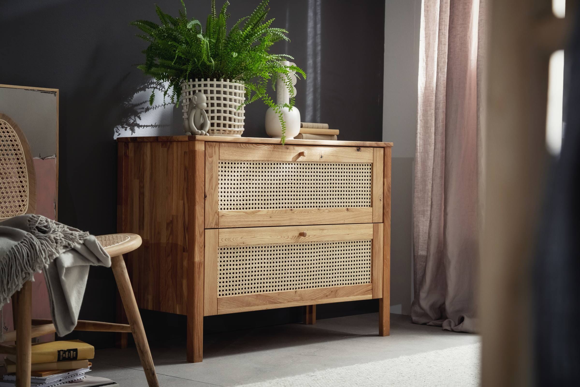 Schubladenkommode FRIA, 2 Schubladen Wildeiche mit Wiener Geflecht