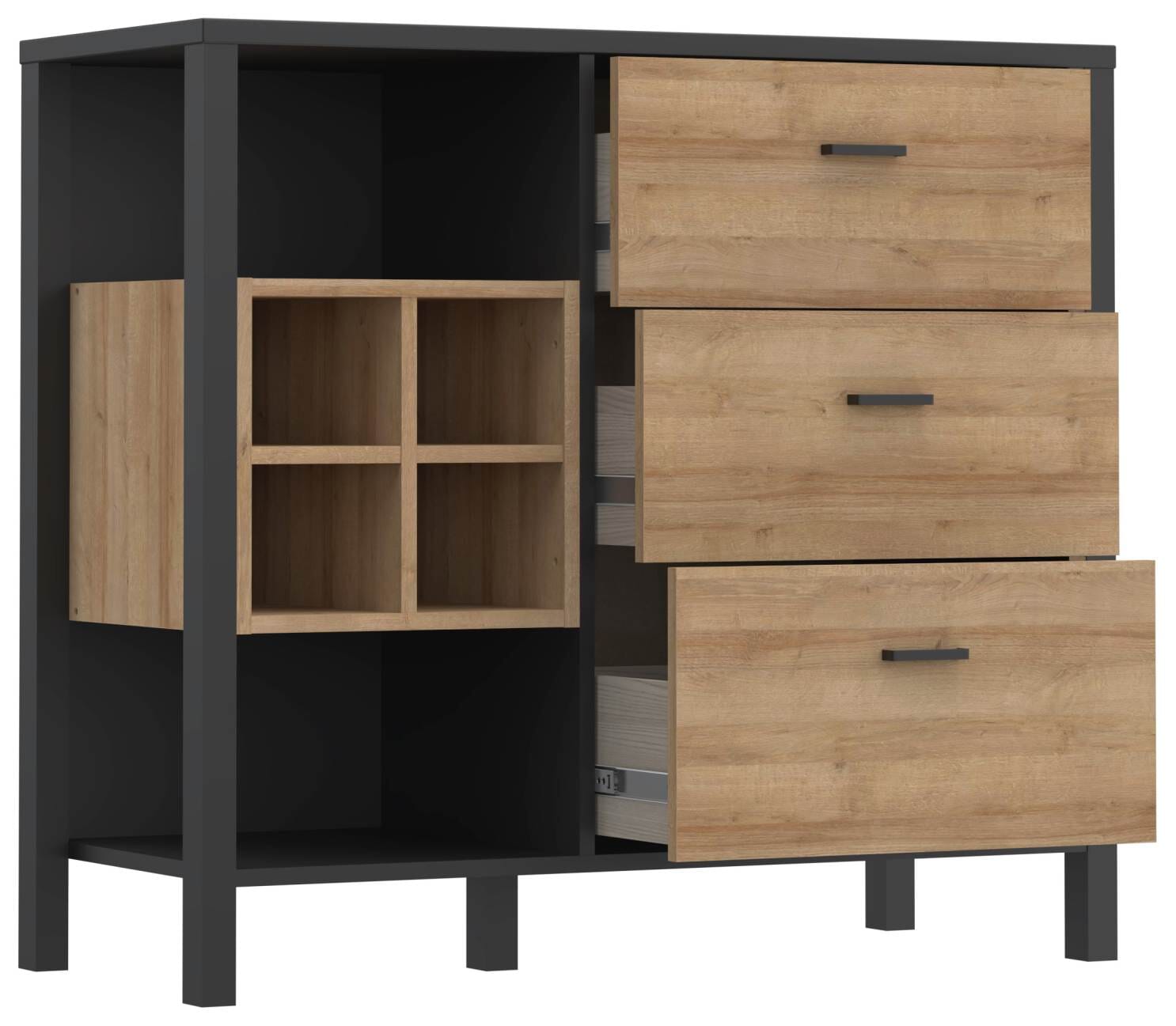 Vor allem im Wohnzimmer macht sich die Schubladenkommode HighRock besonders gut. Denn in den offenen Fächern können Sie vielleicht einen guten Tropfen aufbewahren oder andere Schätze zur Schau stellen. Und in den großen Schubladen mit dem Metallauszügen verschwindet einfach alles, was niemanden etwas angeht. So ziehen die Gegensätze sich an und sorgen auch noch für Ordnung.