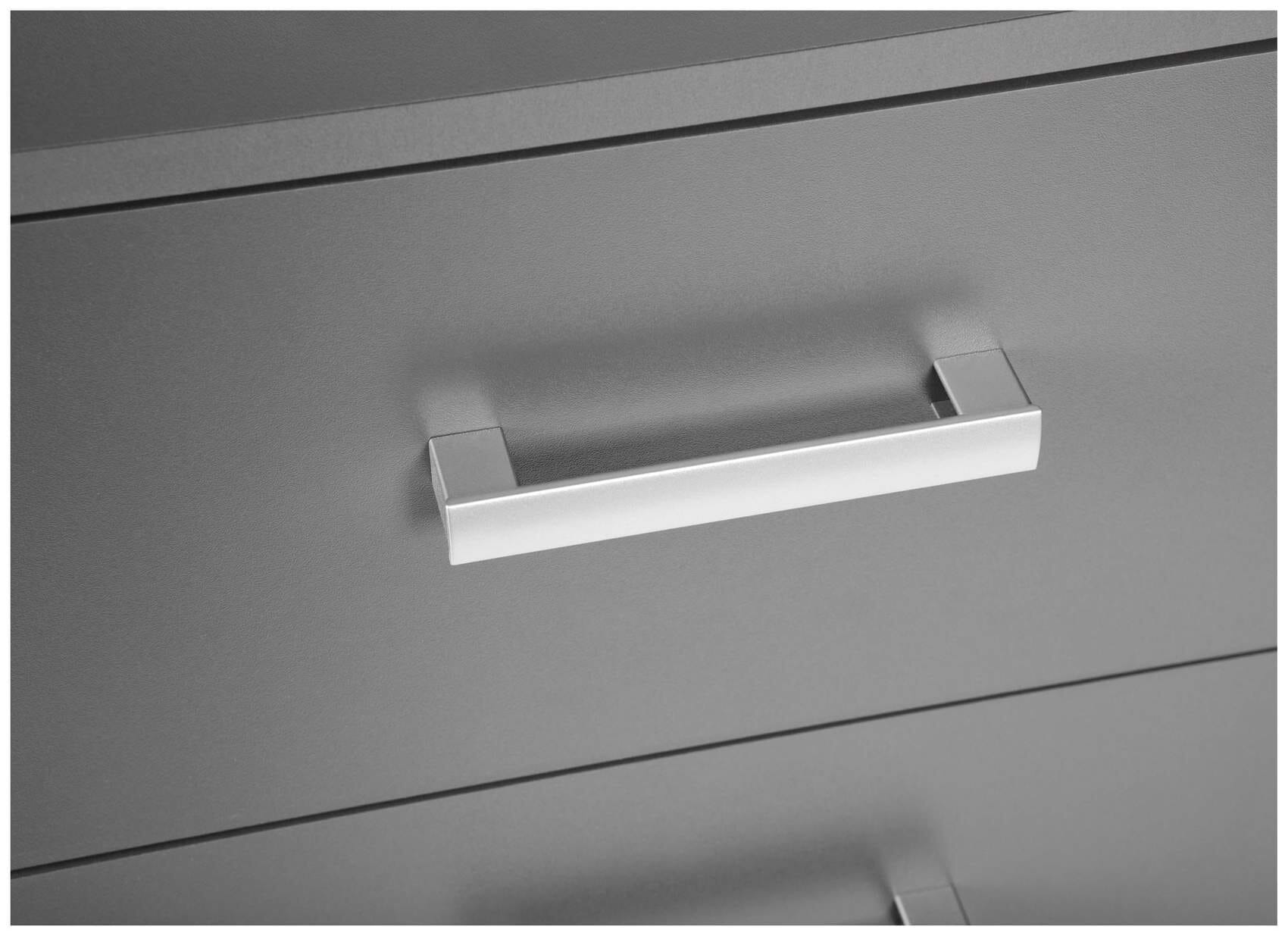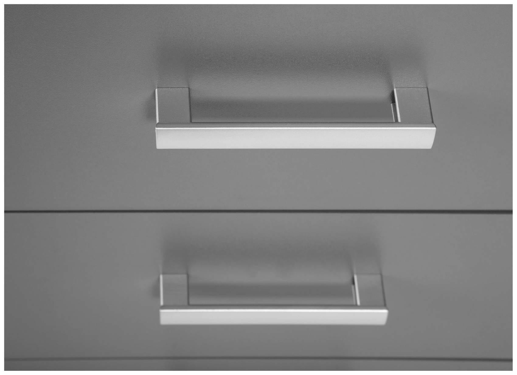 Ein schlanker, etwas höherer grauer Quader, dass ist die Kommode Schubladenkommode ELENZIO 4. Sie ist etwa 91,5 cm hoch und steht bündig auf dem Boden. Vier Schubladen, die auf Metallauszügen laufen, werden mit schlanken, silberfarbenen Griffen geschlossen. Das schlichte Design bekommt durch ihr edles Graphit Grau das gewisse Etwas, wodurch es in einen jungen Einrichtungsstil genauso passt, wie zu einem puristischen Stil.