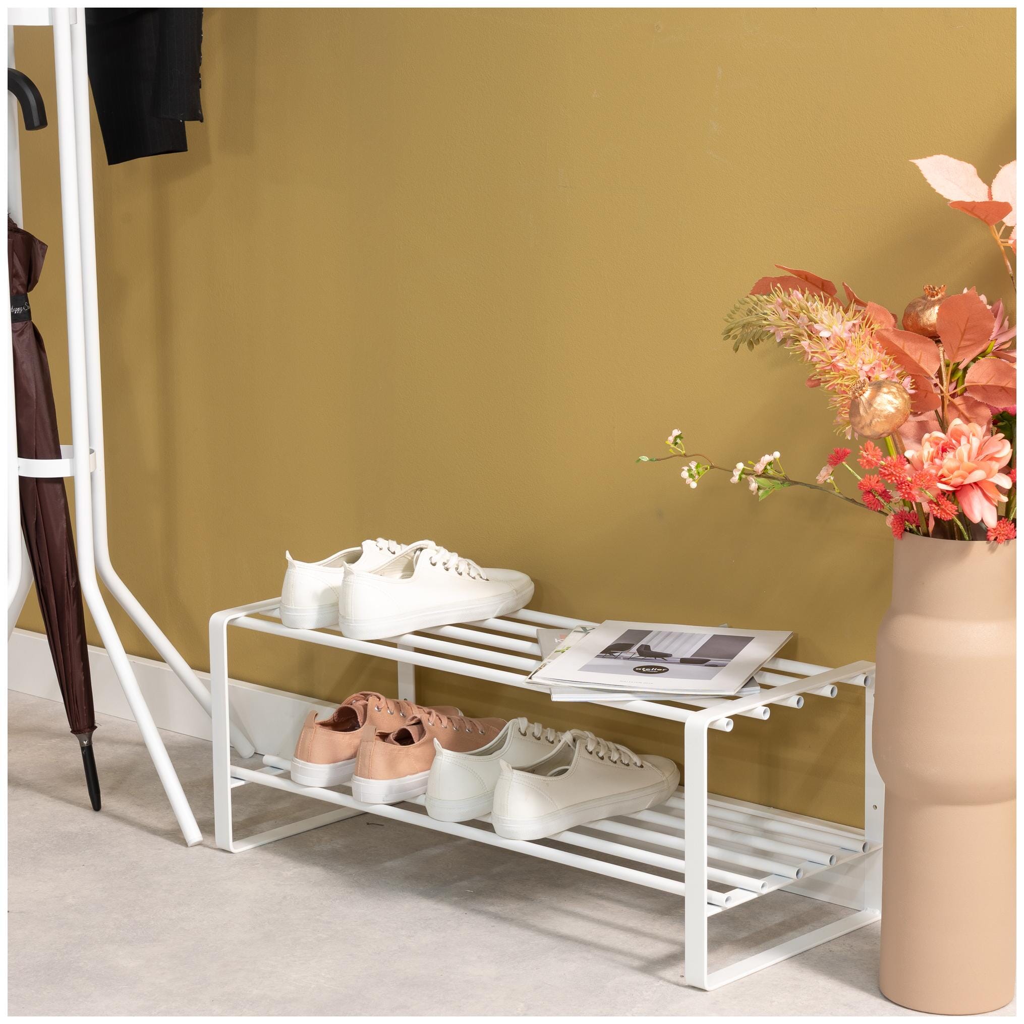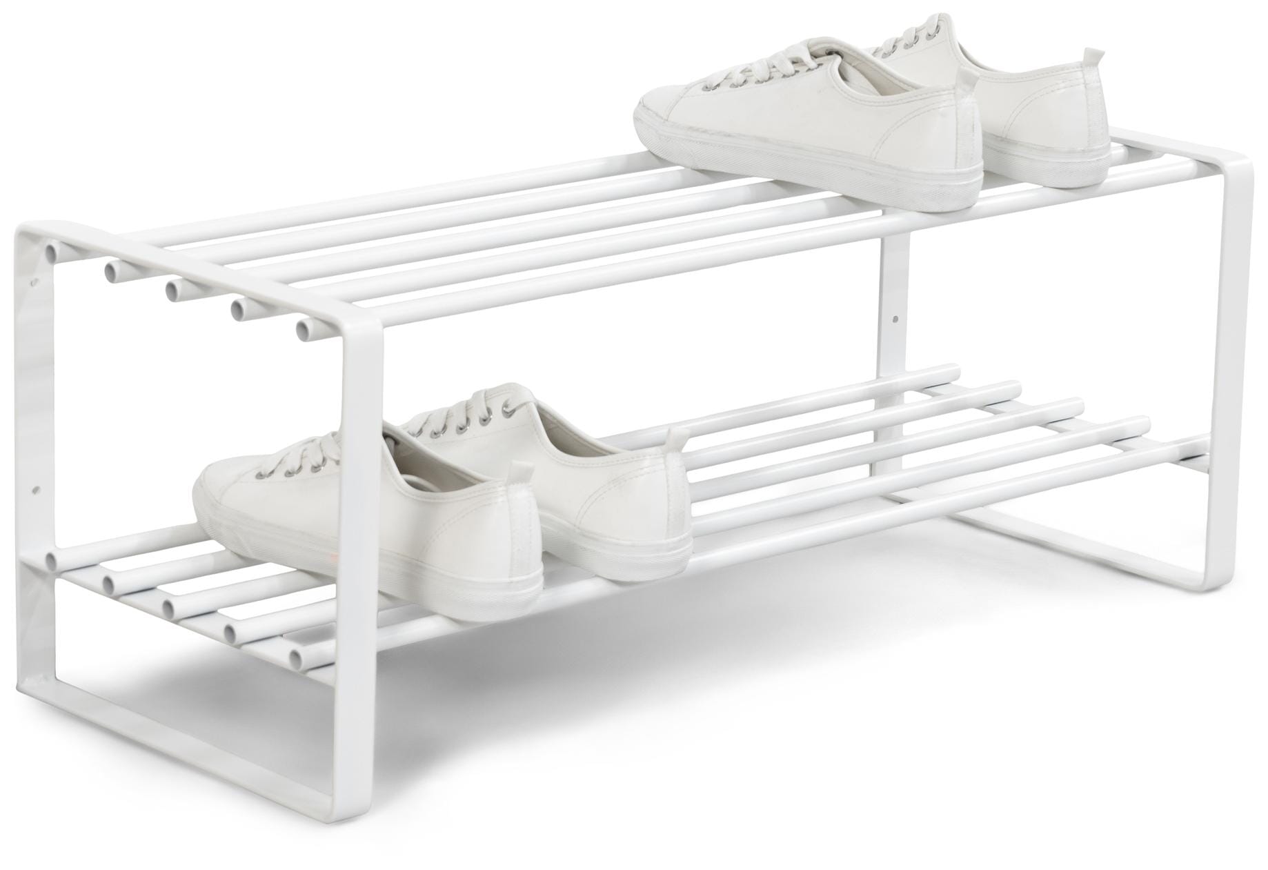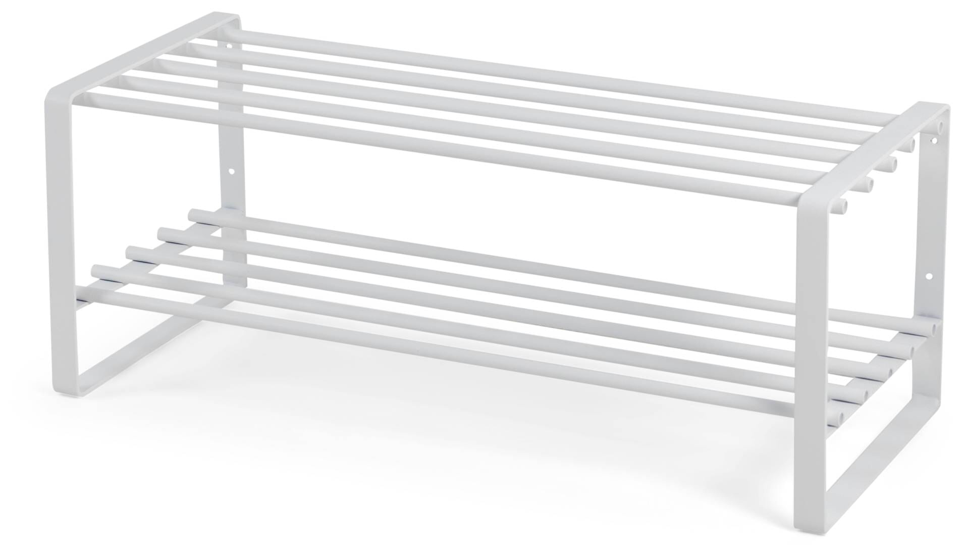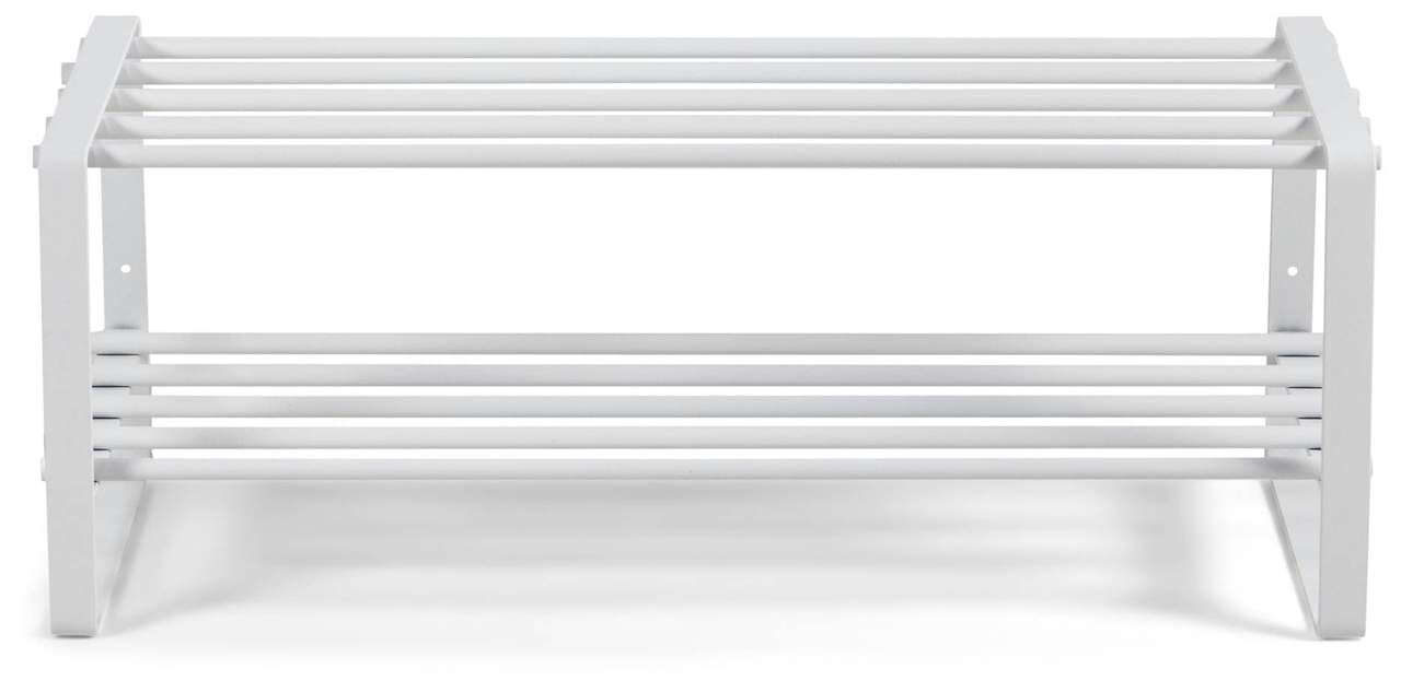Das weiße Regal aus pulverbeschichtetem Stahlrohr ist pflegeleicht und passt sich dezent in Ihre Einrichtung ein. Egal, ob Sie das Schuhregal REX SR weiß direkt in Ihre Garderobe stellen, oder ob Sie eine Verstaumöglichkeit für High Heels und Winterboots in Ihrem Ankleidezimmer benötigen, auf den zwei großzügigen Ablageflächen bringen Sie problemlos mehrere Schuhpaare aufgeräumt und übersichtlich unter.