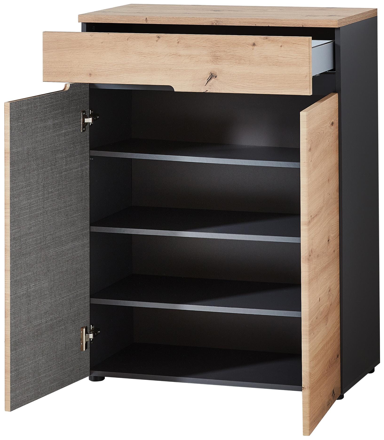 Der 2-türige Schuhschrank MEMPHIS mit Fronten in Artisan Eiche Nachbildung und Korpus in Graphit ist ein absolutes Highlight für Ihre Garderobe, die Farbgebung wirkt modern und natürlich zugleich.
