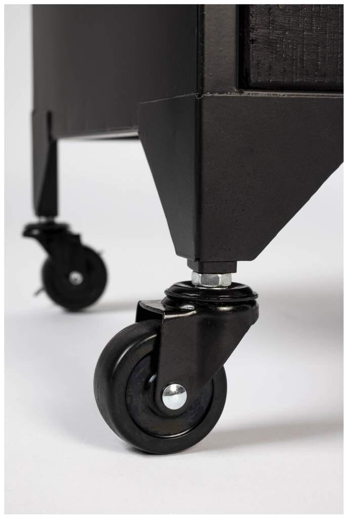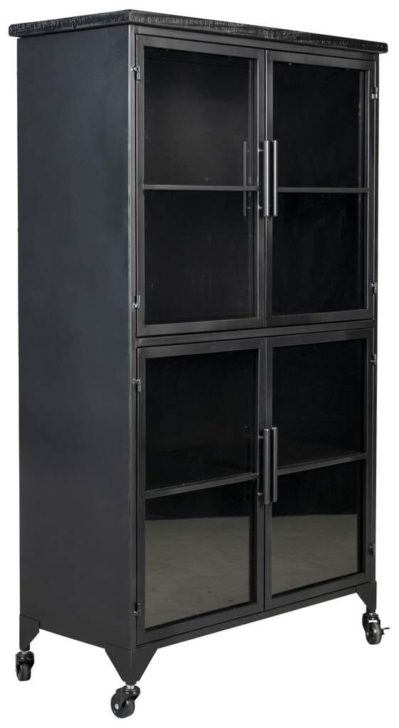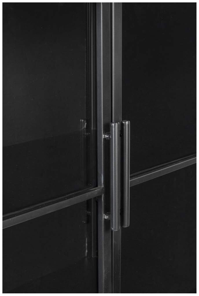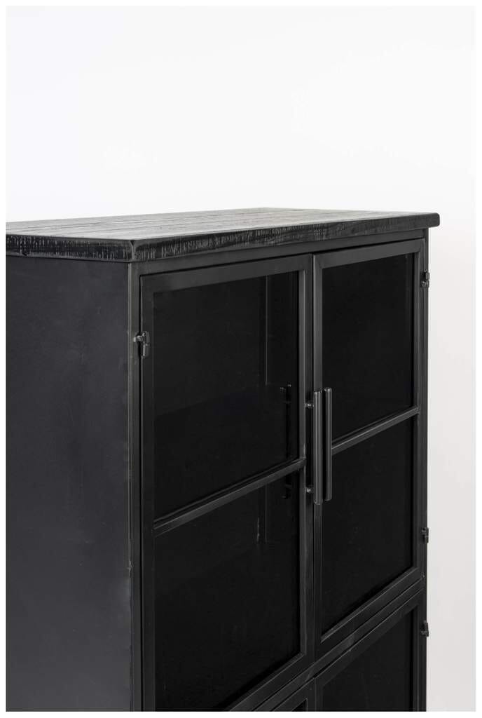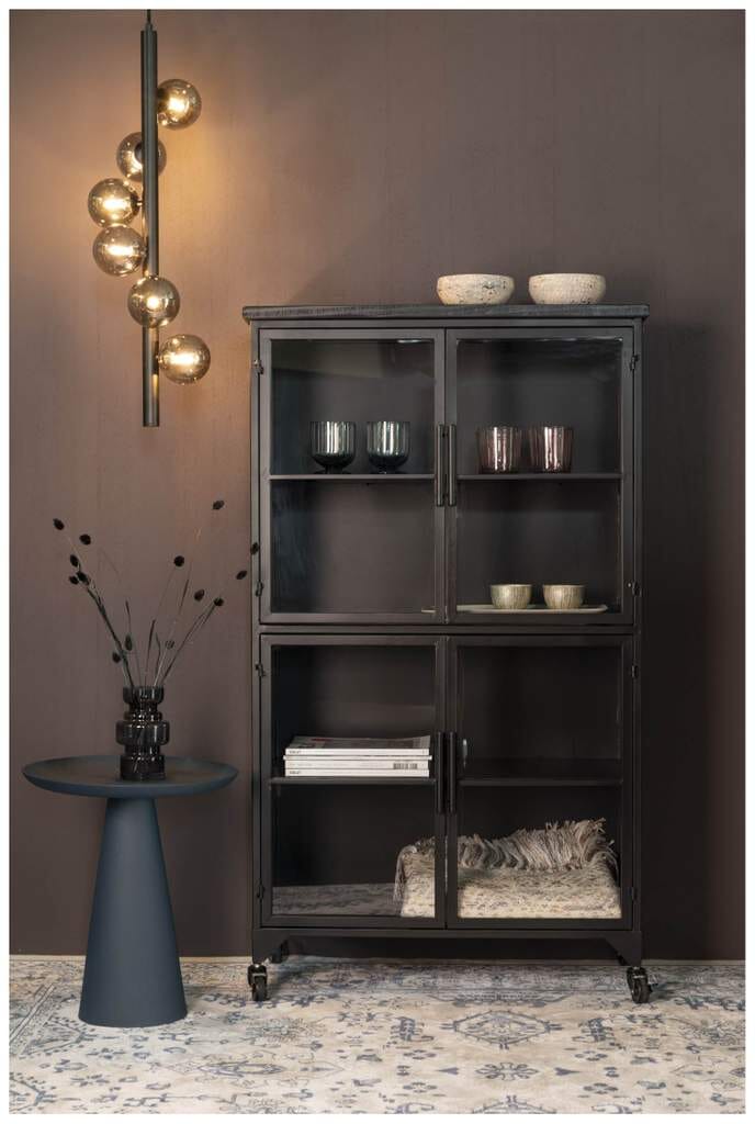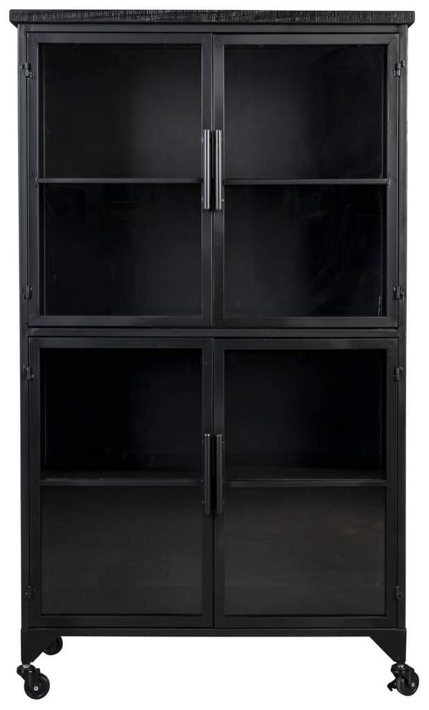Die schwarze Vintage Vitrine FERRE L sorgt für einen tollen Akzent und ist ein Blickfang für Ihren modern oder im Industry-Stil eingerichteten Wohnbereich. Sie ist hervorragend mit dunklen Möbeln kombinierbar und ist eine Bereicherung für Wohn- oder Esszimmer. Auch in einem Flur oder in einer Diele kommt die 4-türige Vitrine auf Rollen gut zur Geltung. Der geräumige Innenraum hinter den Glastüren ist mit festen Fachboden unterteilt. Somit steht Ihnen zusätzlicher Stauraum für Geschirr, Tischwäsche oder Deko-Figuren zur Verfügung.