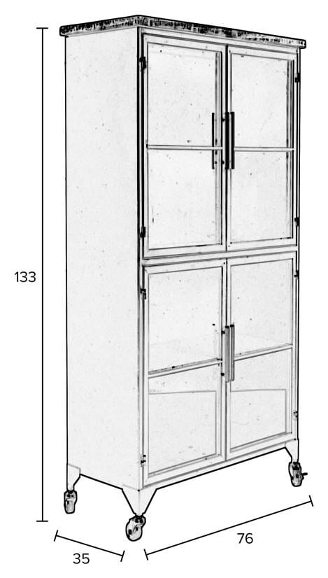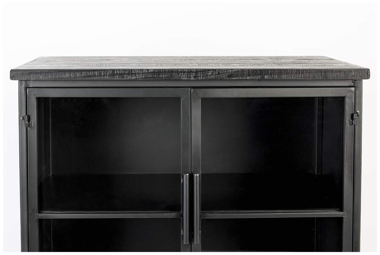 Die schöne Vitrine ist aus stabilem Metall gefertigt und innen und außen pulverbeschichtet. Die Oberplatte besteht aus einer MDF-Platte mit Tannenholzfurnier im Vintage Finish. Die Glaseinlagen der Türen sind aufwendig geschliffen und poliert. zwei der vier Rollen auf der Unterseite sind mit Bremsen ausgestattet.