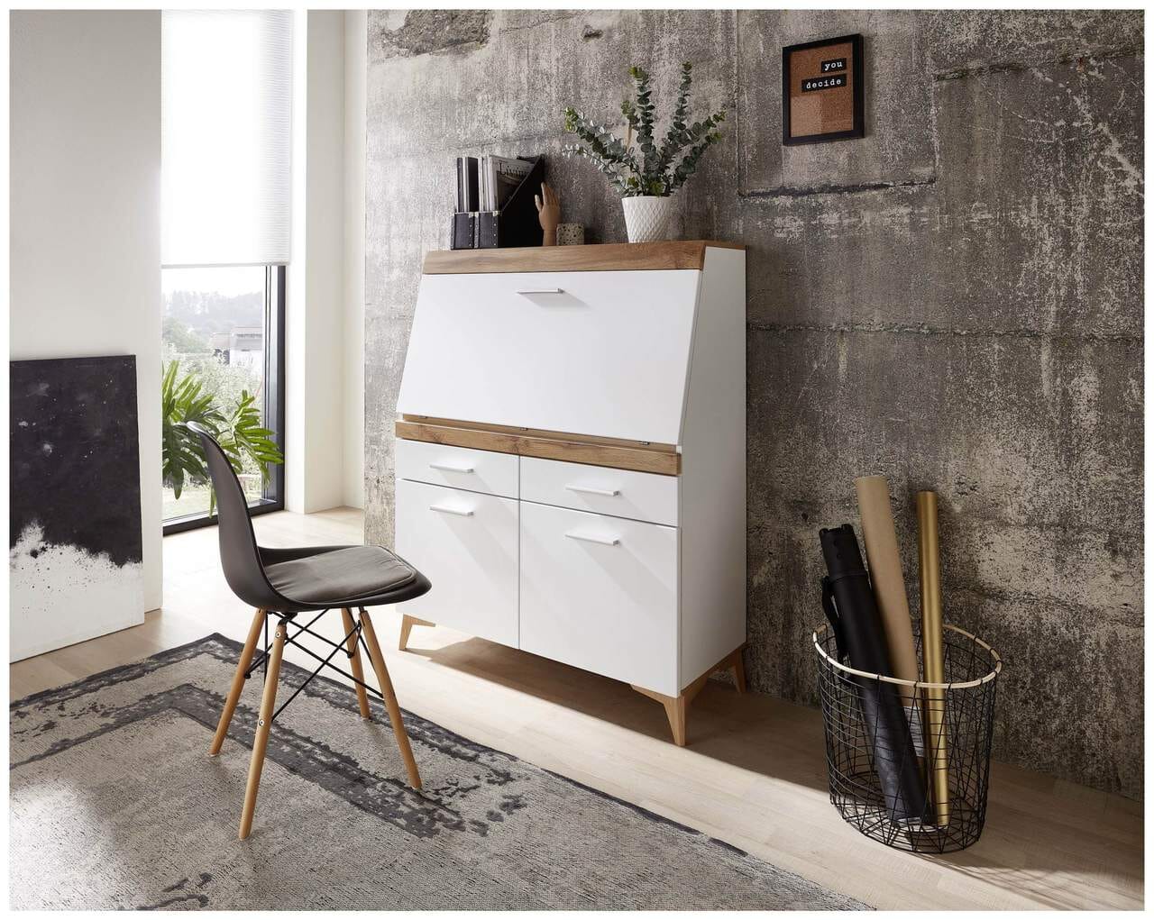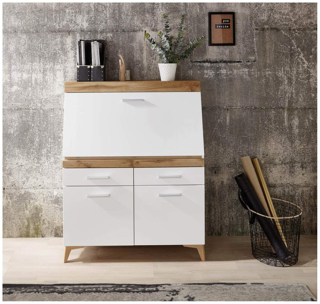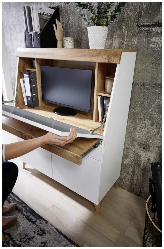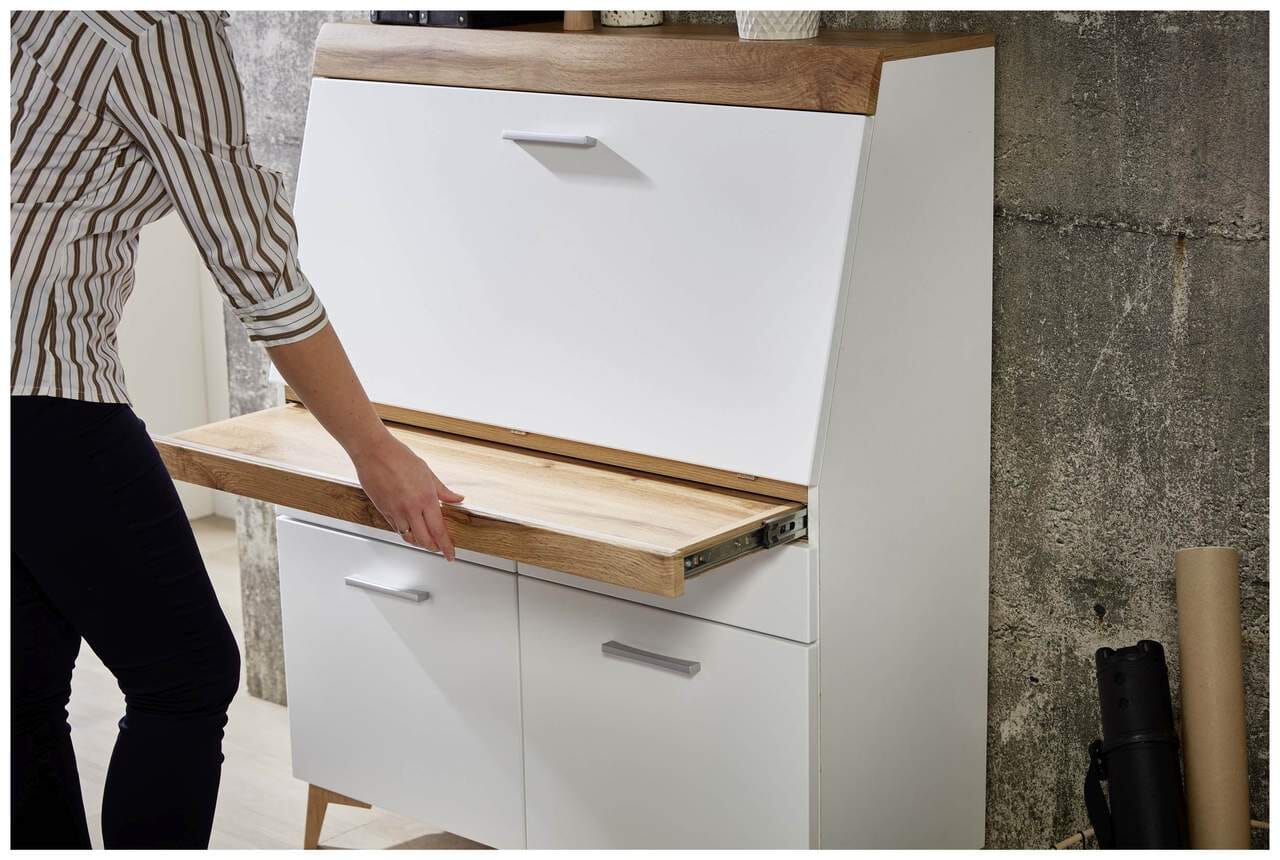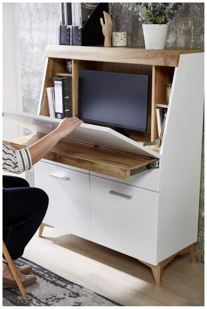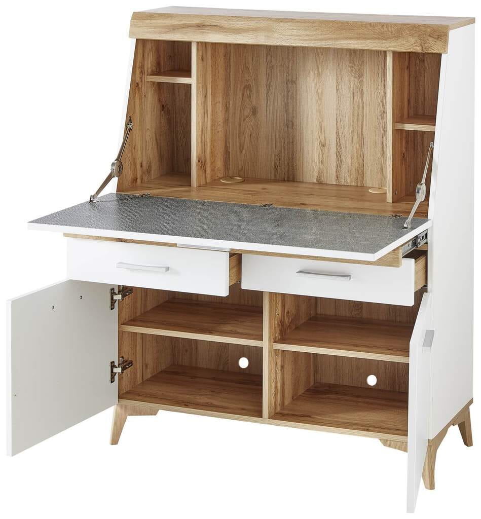 Die Kombination aus weißem MDF und Eichenholz verleiht dem Sekretär eine zeitlose Optik und eine angenehme Haptik. Die hochwertige Verarbeitung garantiert eine lange Lebensdauer und ein ansprechendes Erscheinungsbild. Der Sekretär ist zudem leicht zu reinigen und zu pflegen.