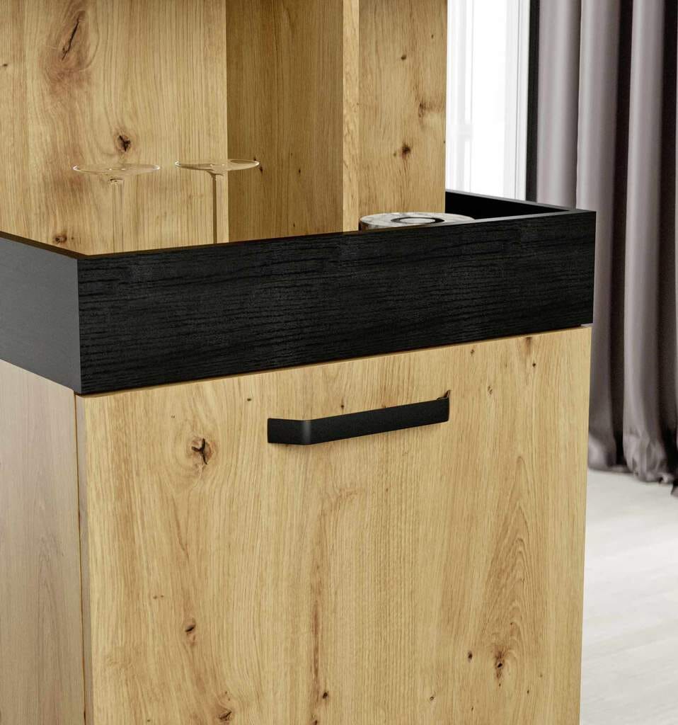 Durch die Kombination aus heller und schwarzer Eichenoptik passt das moderne Möbel zu vielen Einrichtungsstilen. Hinter einer Tür ist ein großes Fach für die unterschiedlichsten Dinge. Die Ablagen bieten Gläsern und Flaschen einen sicheren Halt, sogar dann, wenn die Home Bar 203 in Artisan Eiche und Schwarzeiche gerade bewegt wird. Verzichten Sie nicht mehr länger auf diesen gewissen kleinen Luxus, der nicht nur auf einer Party ein wunderbarer Blickfang ist.