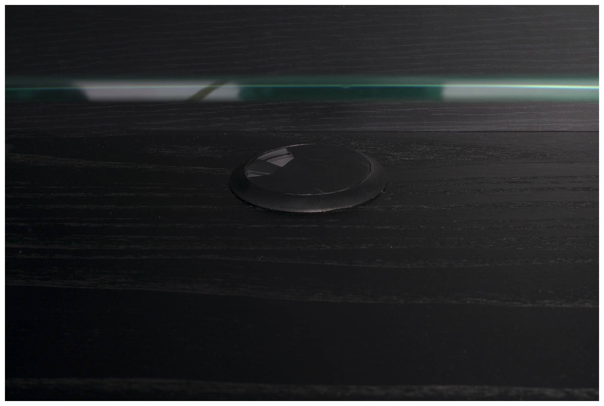 Die beiden Ebenen werden durch eine Glasplatte von einander getrennt, es wirkt innen also wie schwebend. Der Korpus ist Eiche furniert und ist sozusagen die Basis des guten Stücks. Schwarzer PU Lack rundet das Ensemble ab.