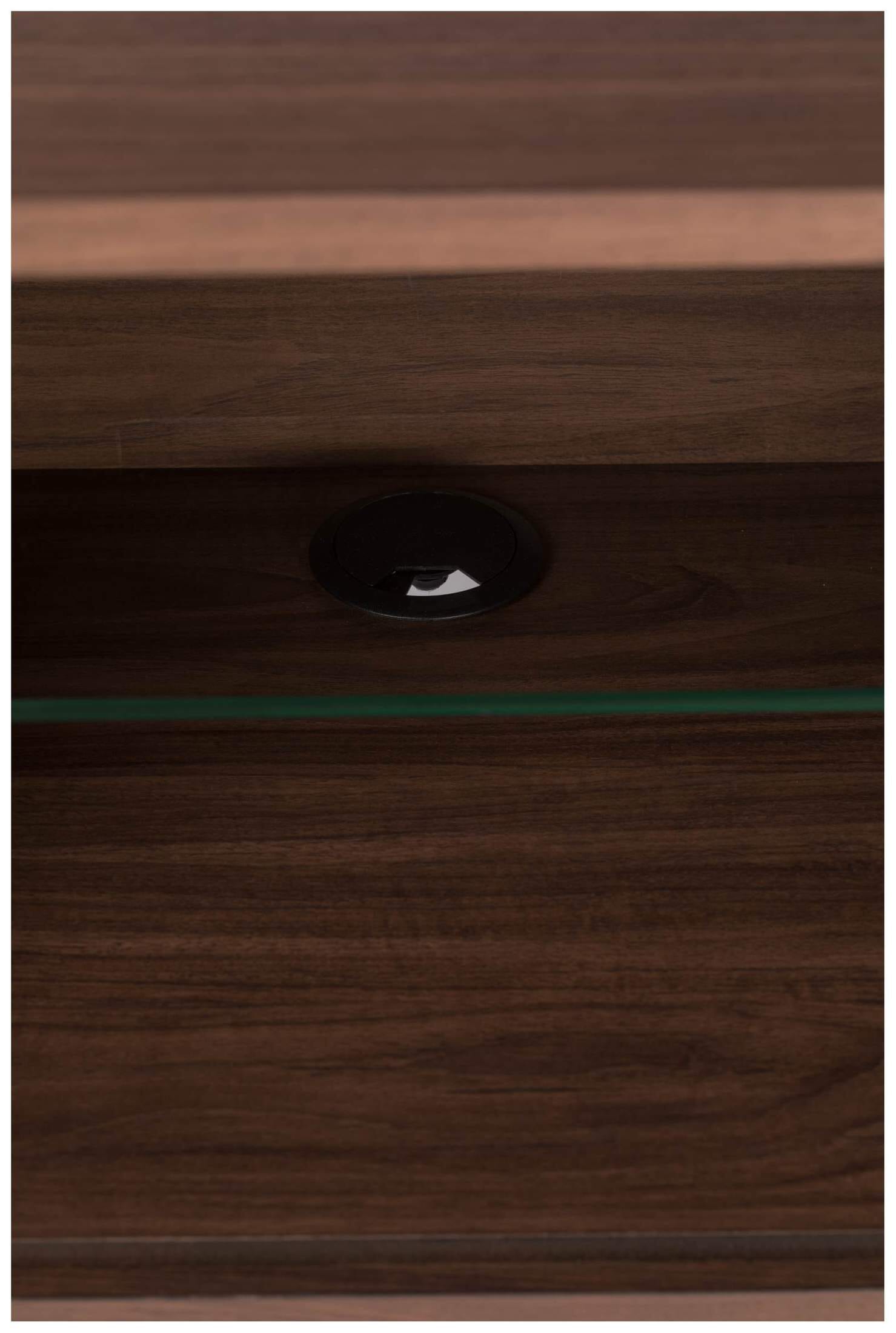Die beiden Ebenen werden durch eine Glasplatte von einander getrennt, es wirkt innen also wie schwebend. Der Korpus besteht aus Walnuss furniert und ist sozusagen die Basis des guten Stücks. PU Lack rundet das Ensemble ab.