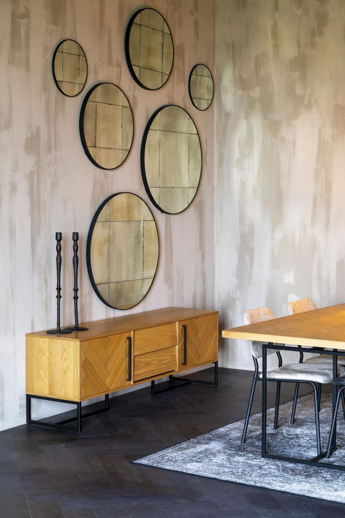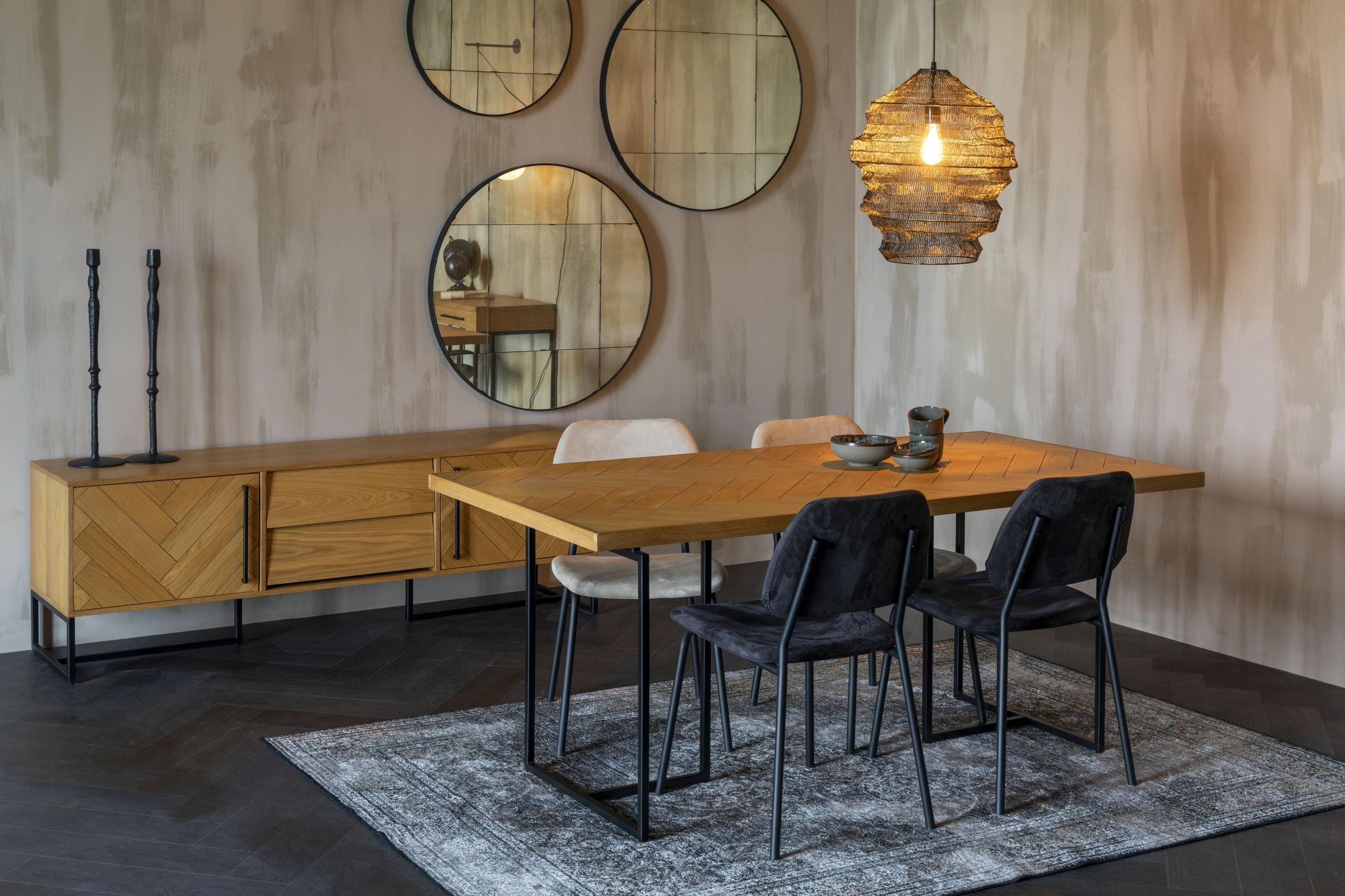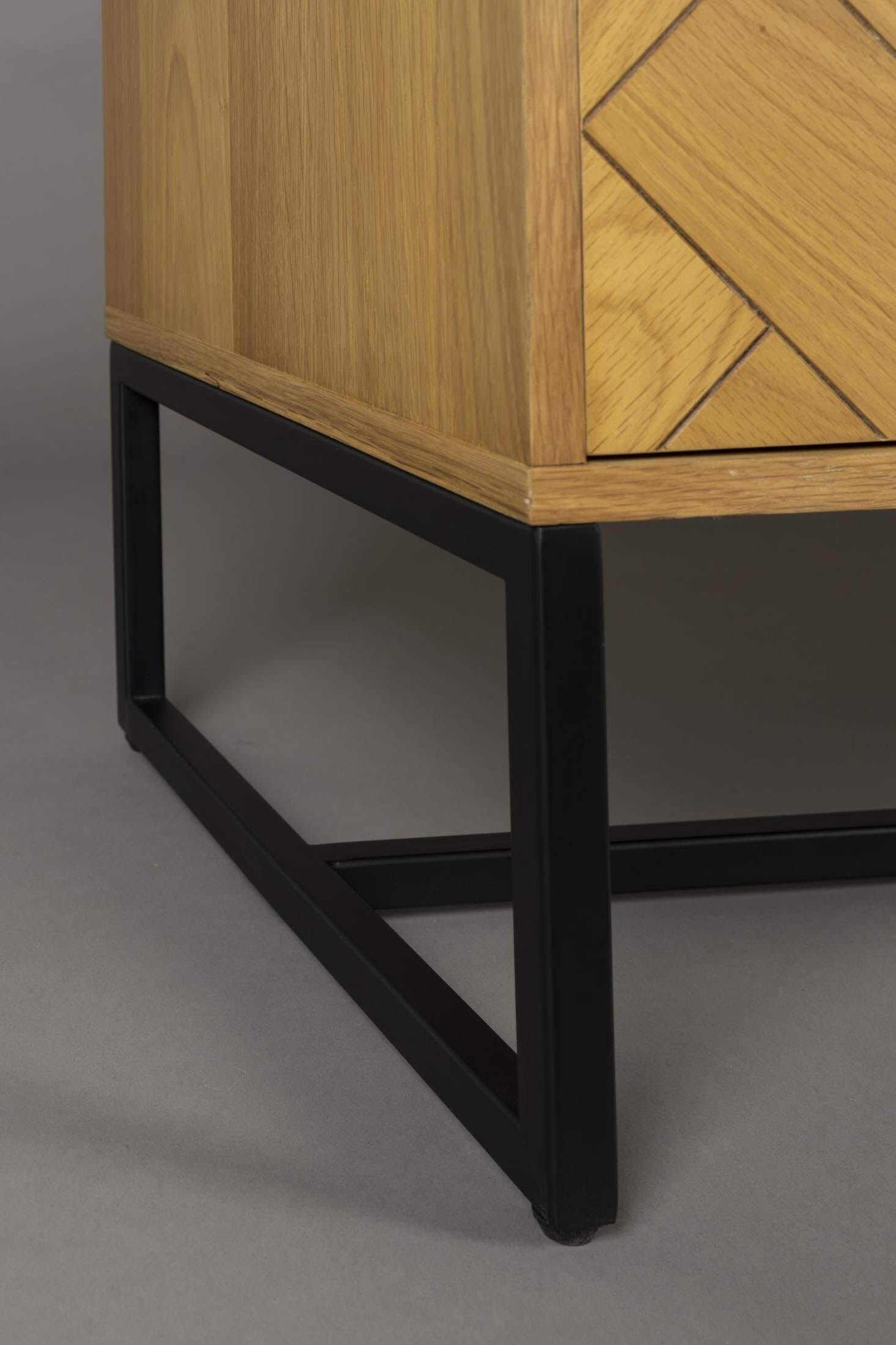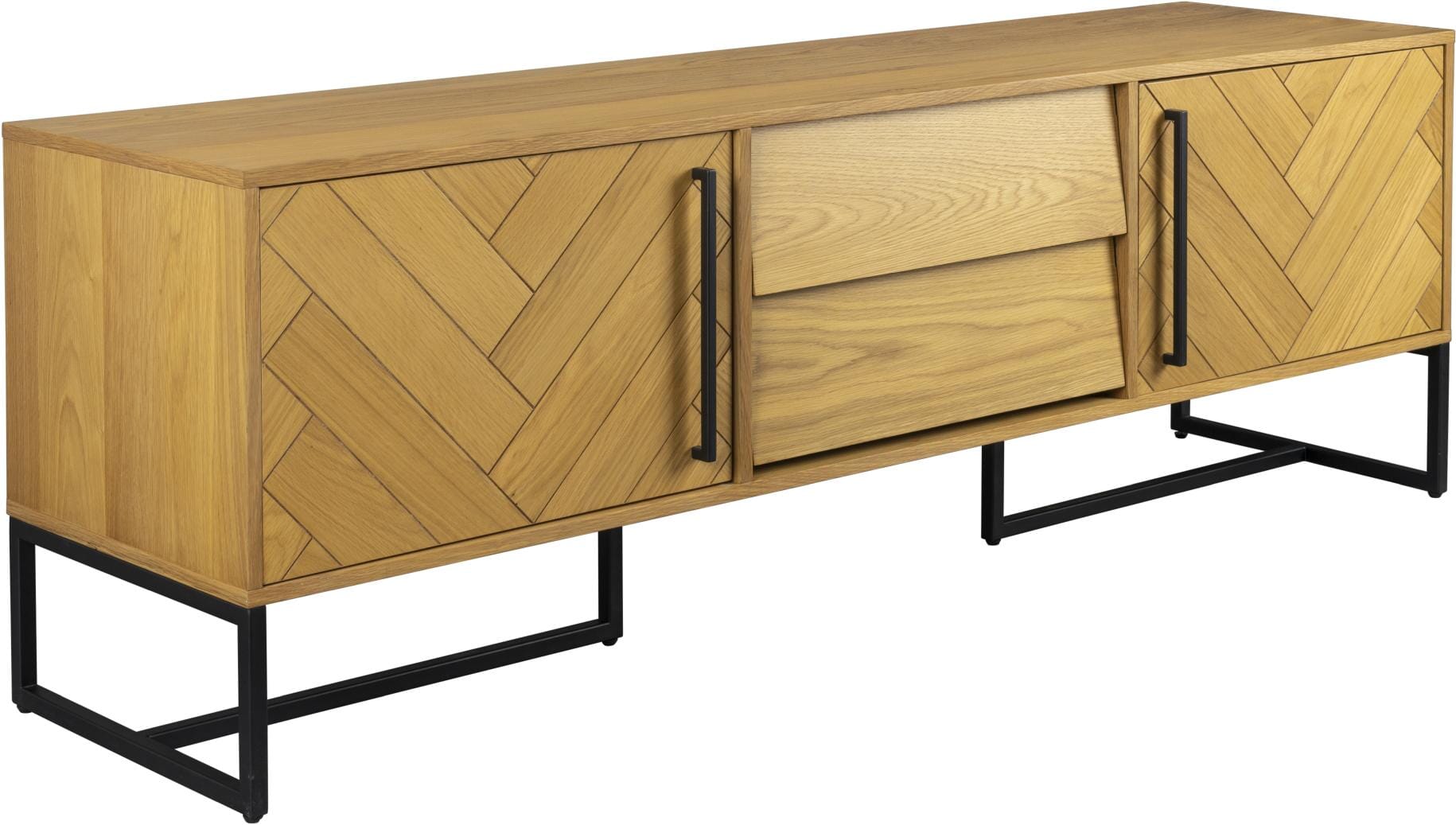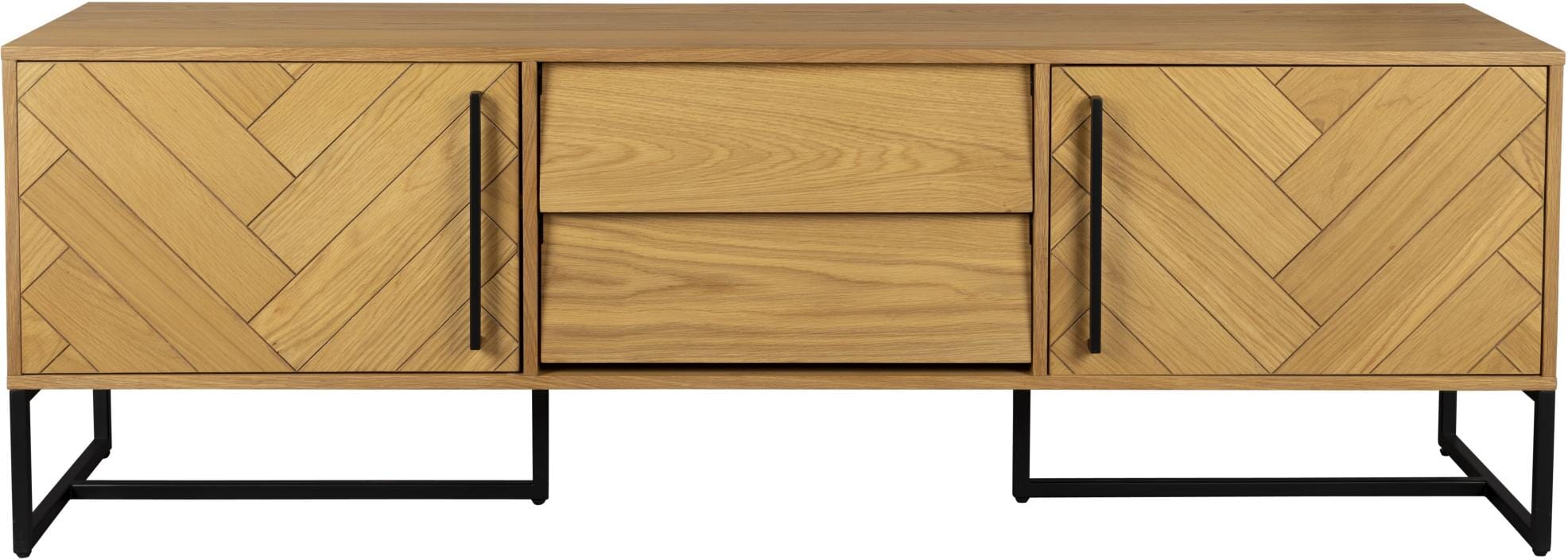 Der insgesamt behagliche Eindruck dieses kompakten Sideboards macht es zu einem Gesellen, der Flur und Wohnzimmer schmückt. An schönen Details mangelt es aber auch nicht: Ein feines Fischgrätmuster aus Eiche paart sich mit den smarten Griffen aus Metall.