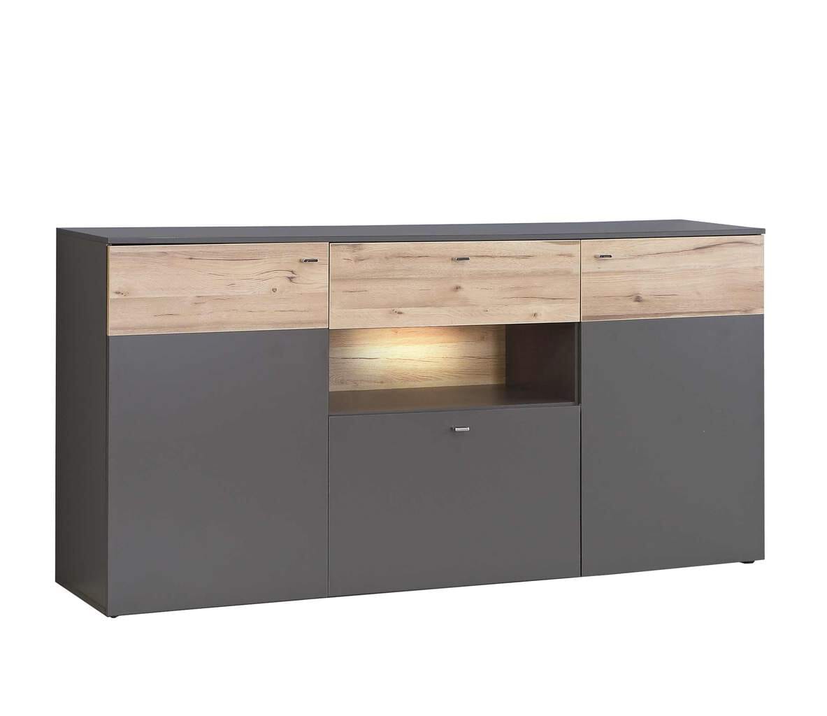 Sideboard COMO mit Nischenbeleuchtung, in elegantem Grau und Absetzungen in Balkeneiche Optik.