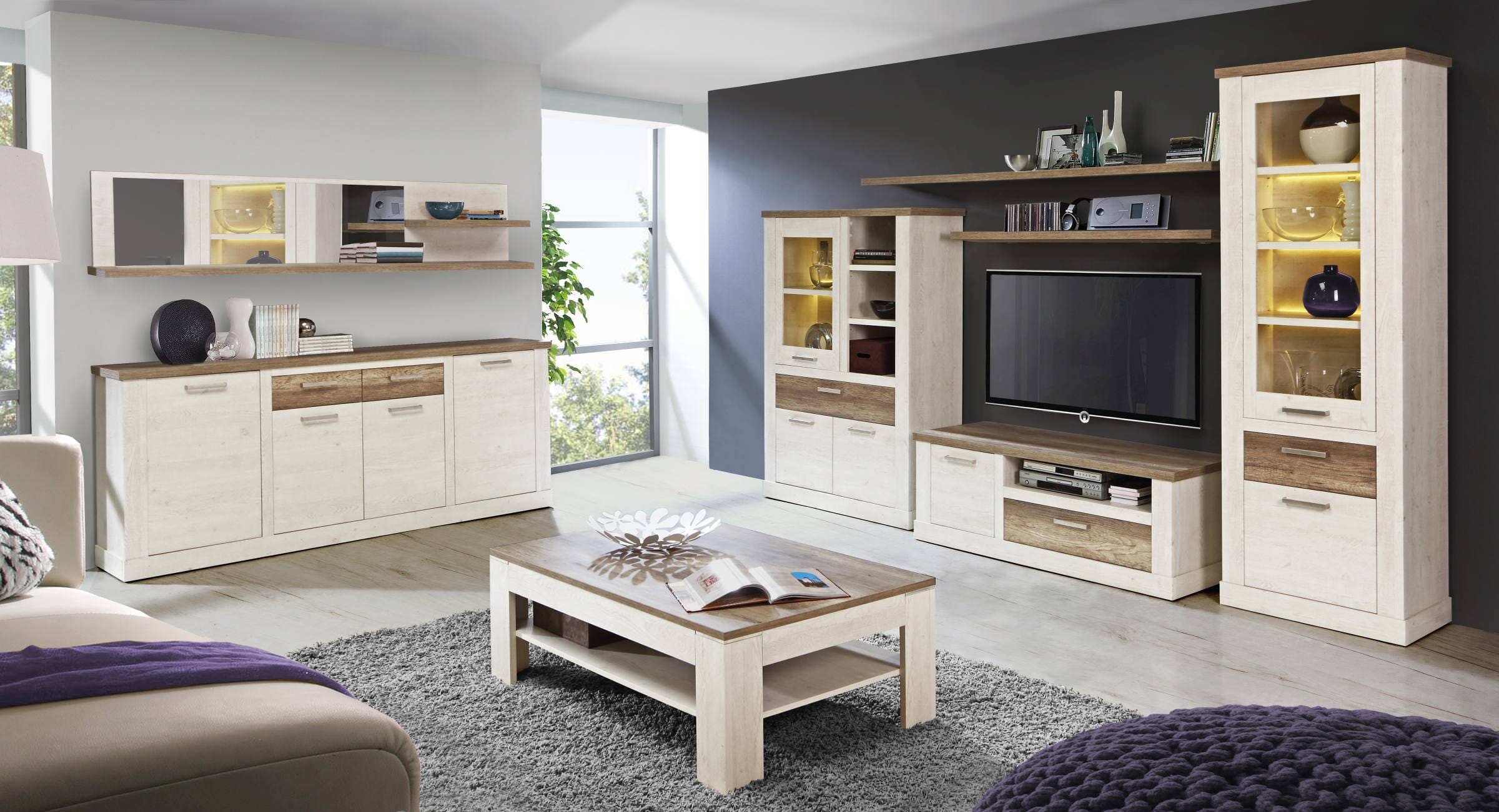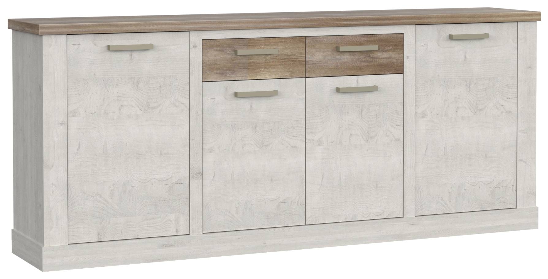 Vier Türen und zwei Schubladen - was nicht unbedingt so ungewöhnlich klingt, entpuppt sich hier als ein Design, das voller Überraschungen steckt. Das liegt vor allen Dingen an der raffinierten Kombination aus weißer Pinie und Eiche antik. Weiß ist hier die Grundfarbe, die durch die Absetzung in naturnaher Eiche, das die Schubladen ziert, wunderbar ergänzt wird.