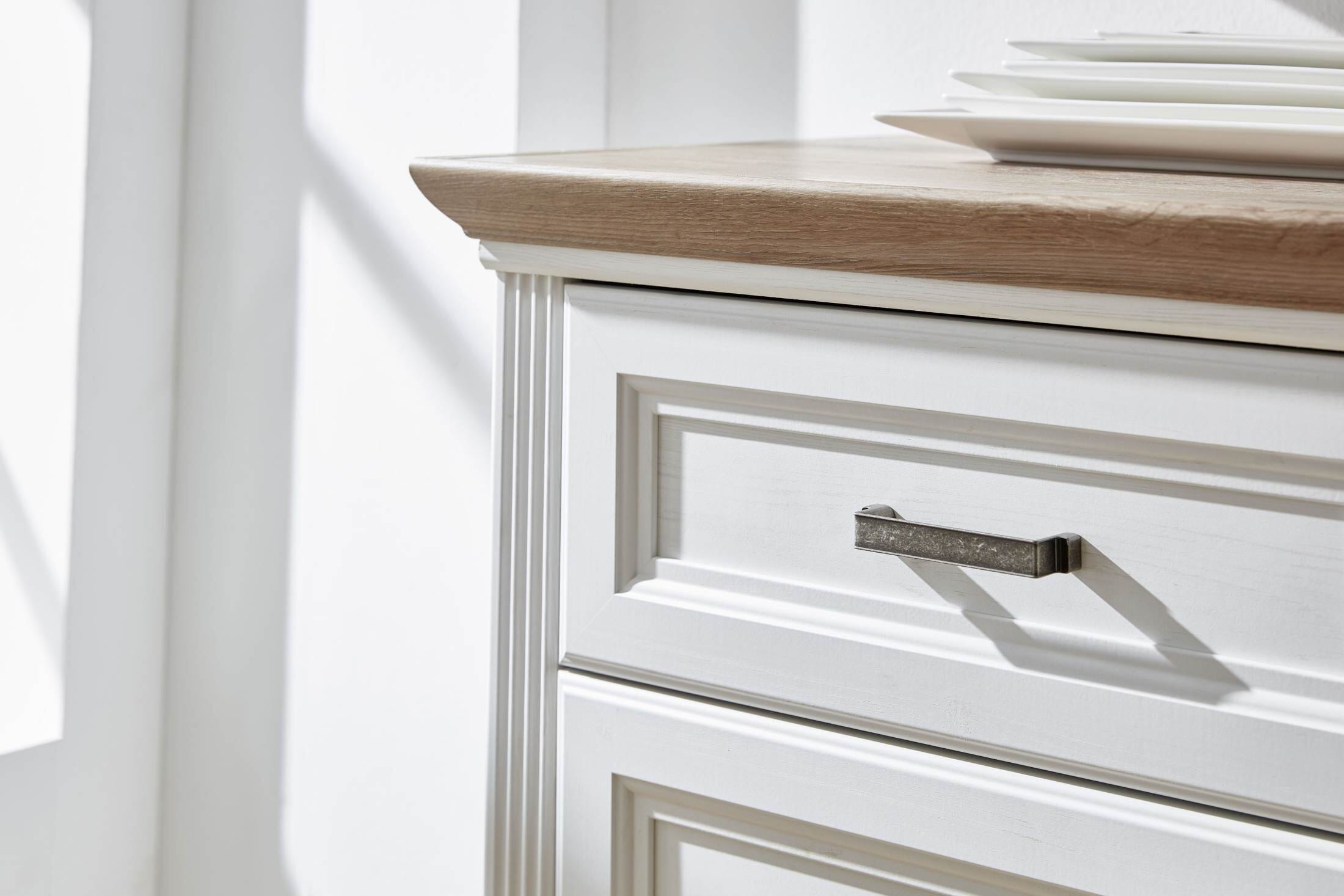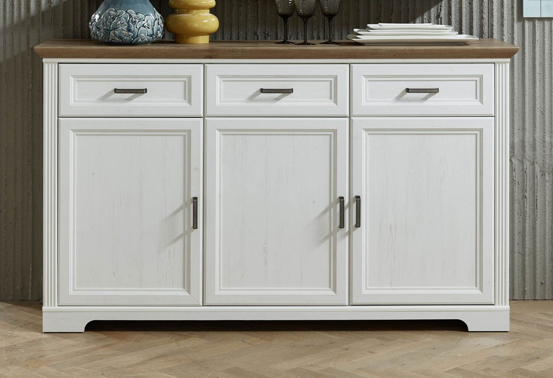 Mit dem Sideboard JASMIN Pinie weiß Nachbildung entscheiden Sie sich für eine Aufbewahrung der Extraklasse. Das aus Pinie Nachbildung hergestellte Modell bietet Ihnen hinter den drei Türen sowie in den ebenfalls drei Schubkästen jede Menge Stauraum für Geschirr, Gläser und Besteck oder alternativ für Unterlagen. Damit haben Sie die Möglichkeit, das Sideboard JASMIN nicht nur für den Wohnbereich, sondern ebenfalls für das Esszimmer oder den Arbeitsbereich zu verwenden.