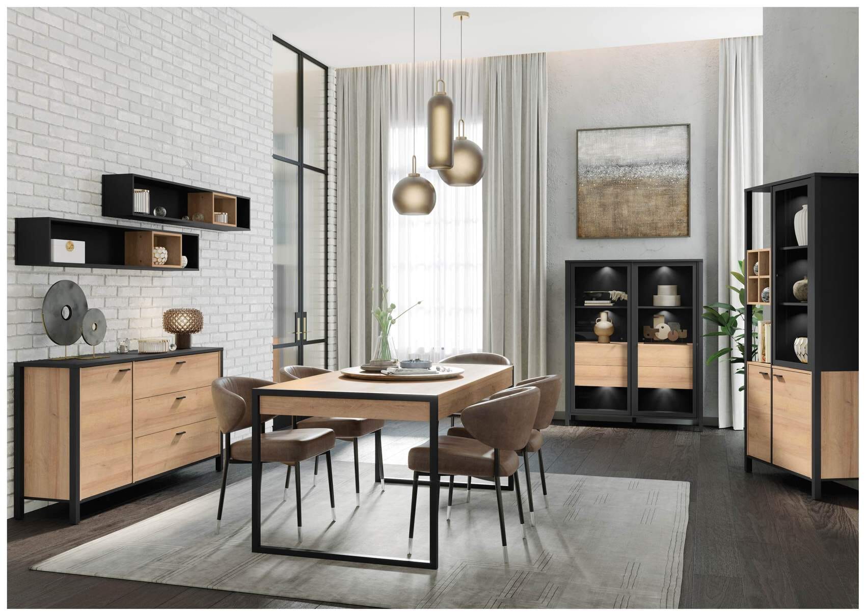 Das Sideboard High Rock hat mit seiner geradlinigen Form ein modernes Aussehen. Die Fronten sind in einer Riviera Oak Holznachbildung gestaltet, während das Gestell und die Oberplatte ein schwarzes Dekor zeigen. Auch die Griffe sind schwarz. Dieser Kontrast wirkt sehr dekorativ. Das Sideboard kann im Esszimmer, Wohnzimmer, Flur, Gästezimmer oder im Homeoffice stehen. Es ist universell einsetzbar.