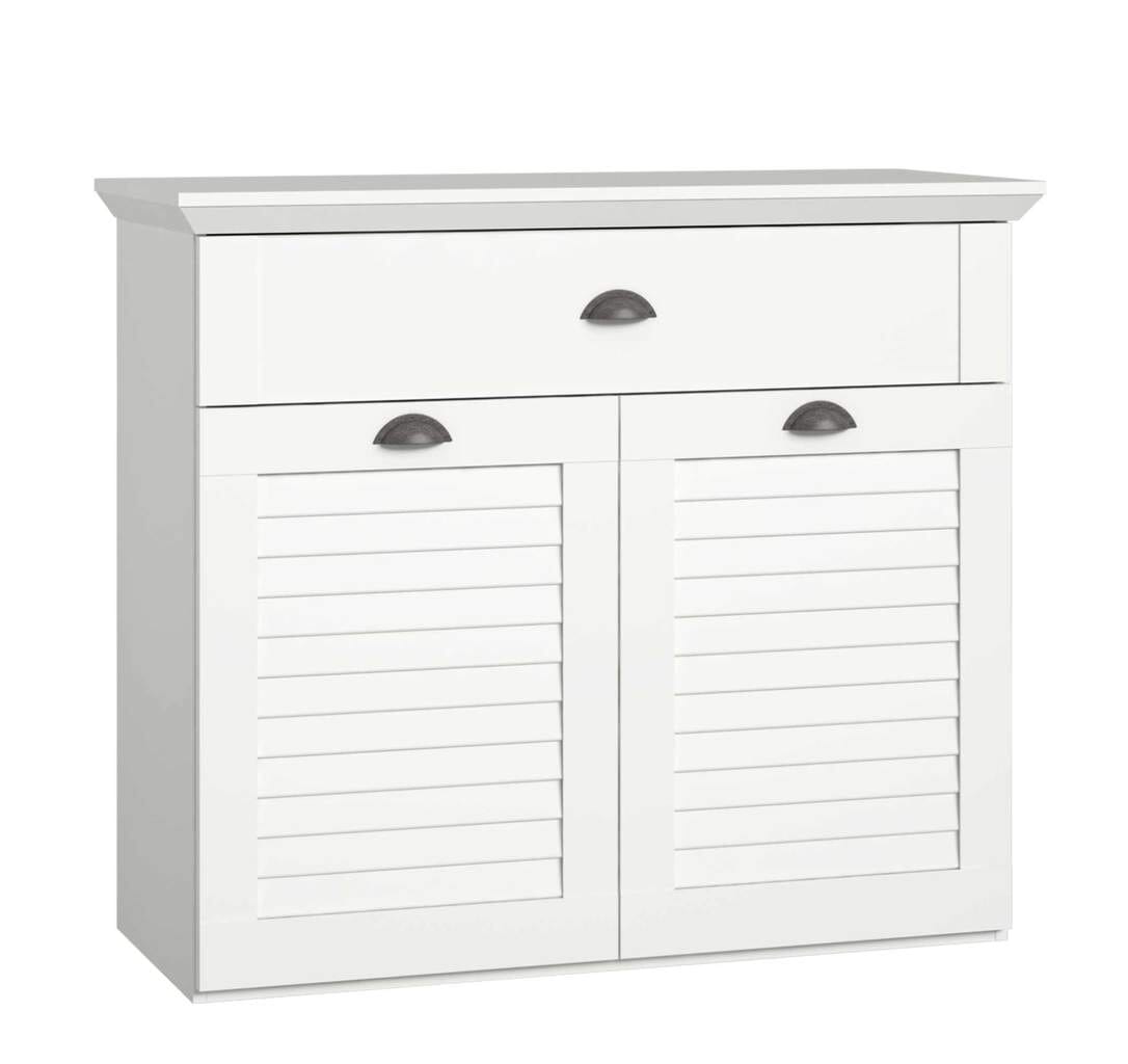 Die gefällige Oberfläche, ein matt weißes Dekor, macht aus dem schlichten Möbelstück, das aus Spanplatte bzw. MDF gefertigt ist, ein Möbel für alle Fälle. Die Schublade läuft auf einem Metall-Auszug, Metallbeschläge und schöne Metall-Griffe ergänzen ein Möbel, das sich als Allrounder schnell unentbehrlich macht.