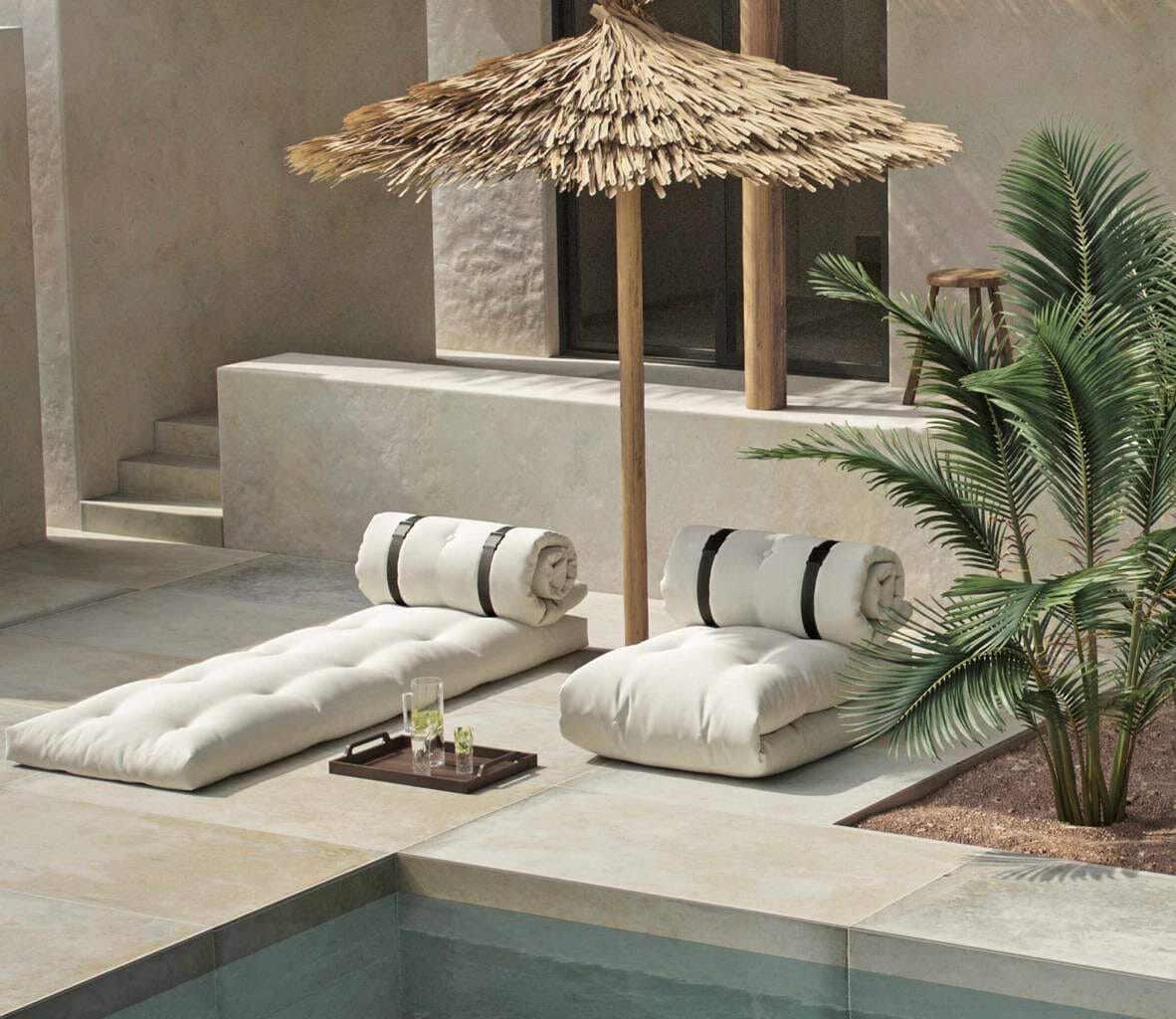 Kaum ist der Sommer endlich da, zieht es uns in die Natur hinaus. Für ein besonders gemütliches Sitz- beziehungsweise Liegeerlebnis unter Palmen sorgt dieses gemütliche Sitzpolster Futonmatratze BUCKLE UP OUT von Karup, dass in vielen verschiedenen Farben bestellbar ist. Damit lässt sich die Auflage beispielsweise auch gestalterisch dem Außenbereich anpassen.