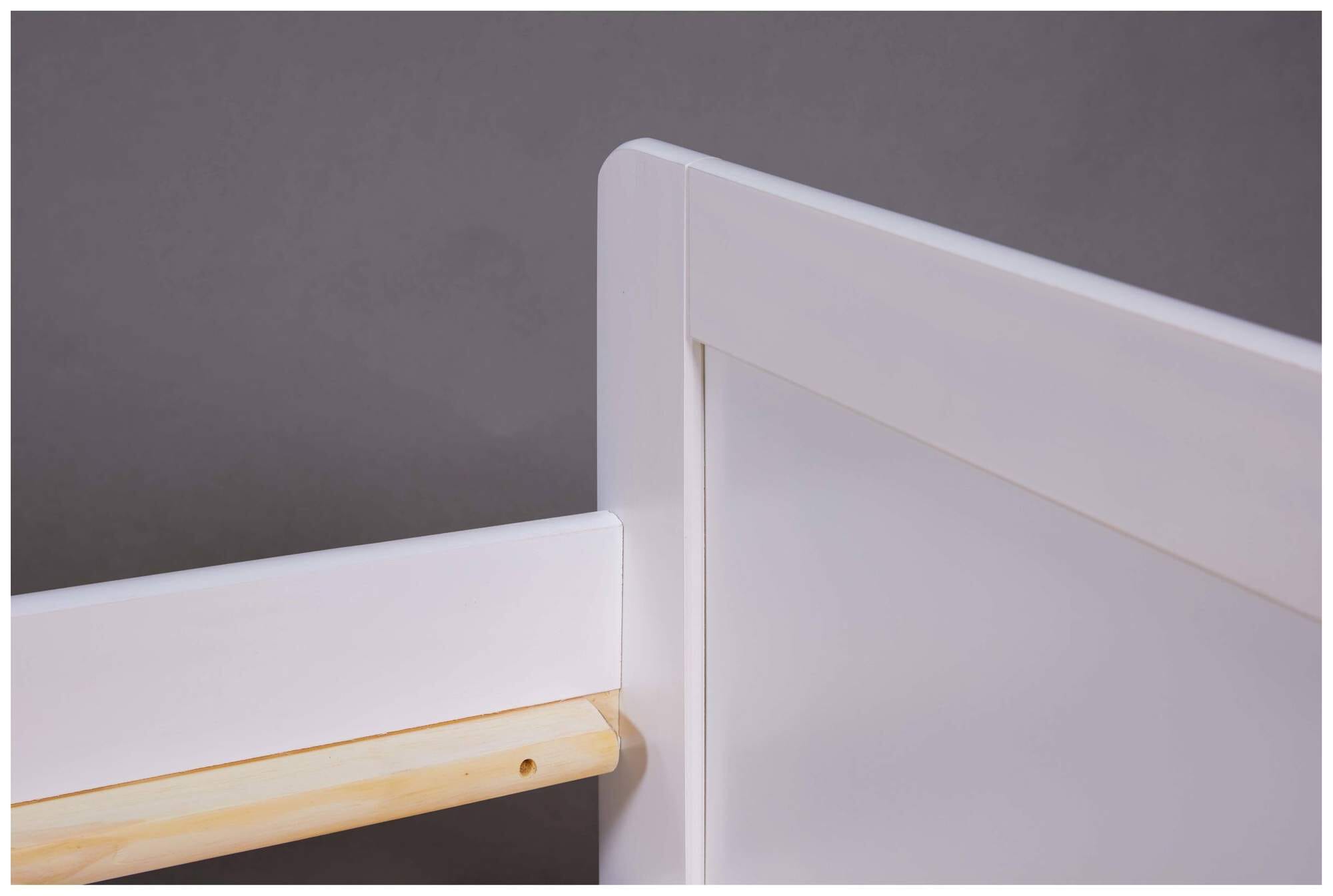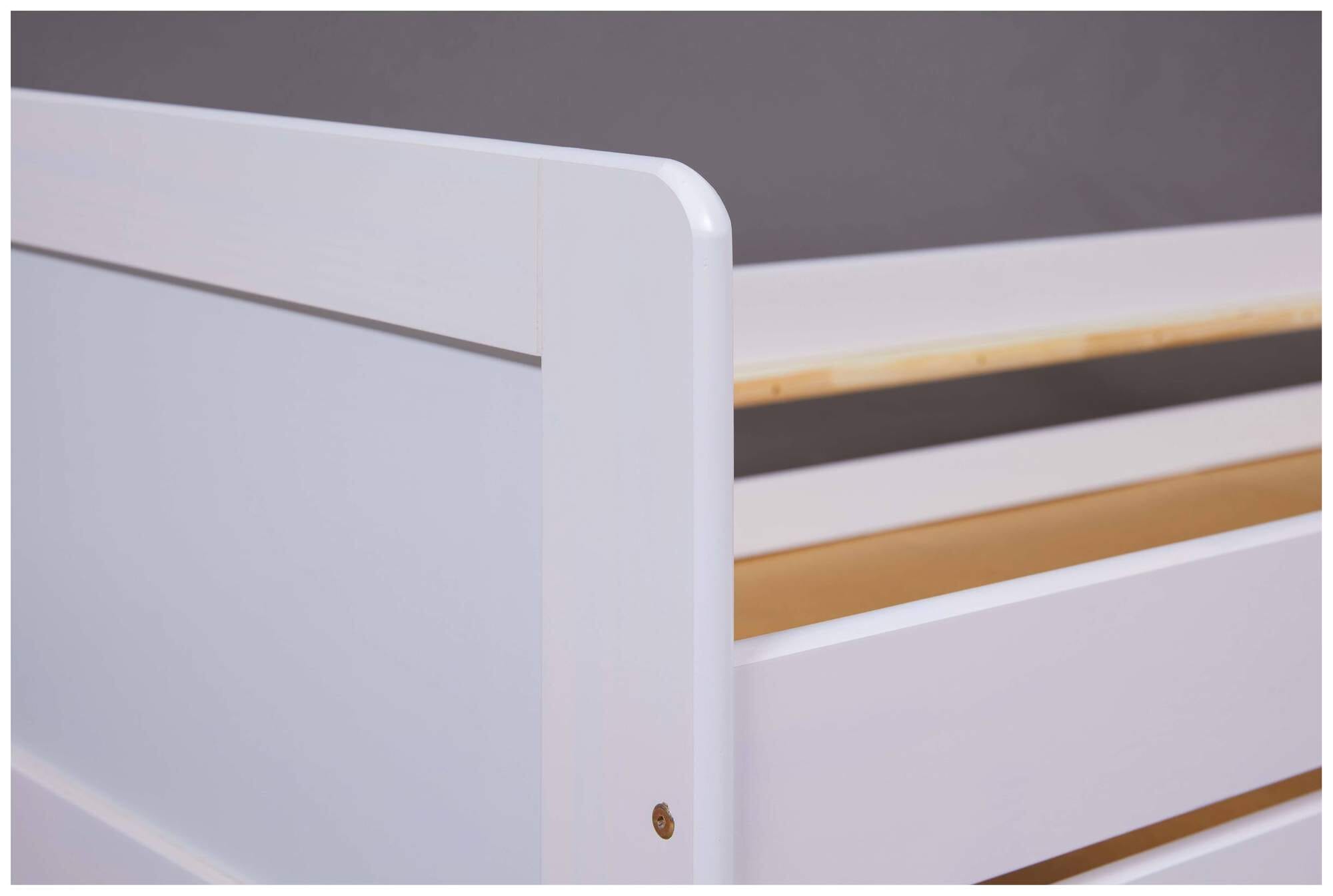 Das weiße Kinderbett SURF aus Kiefer Massivholz mit Gästebett wird, zur einfachen Selbstmontage, ohne Matratzen mit einem Roll-Lattenrost geliefert.