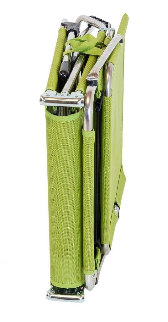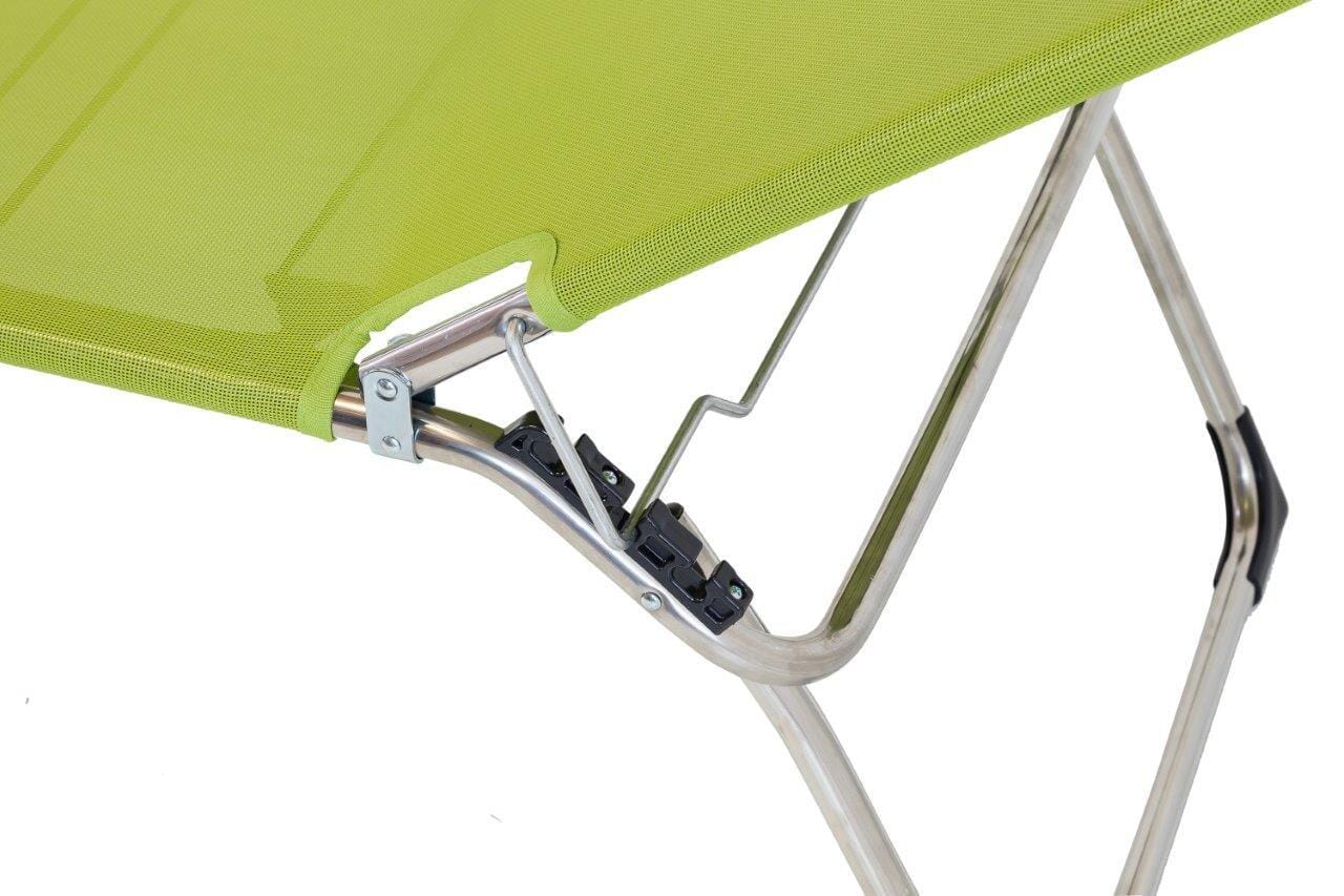 Das Gestell der Klappliege besteht aus Aluminiumrohr mit 21 mm Durchmesser, der Bezug ist aus strapazierfähigen, wetterfesten und UV-beständigen Textilene.