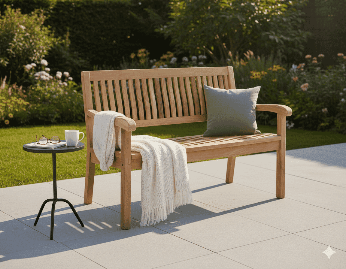 Gartenbank 120 cm in Premiumteak mit ergonomisch geformten Sitz und Rücken.