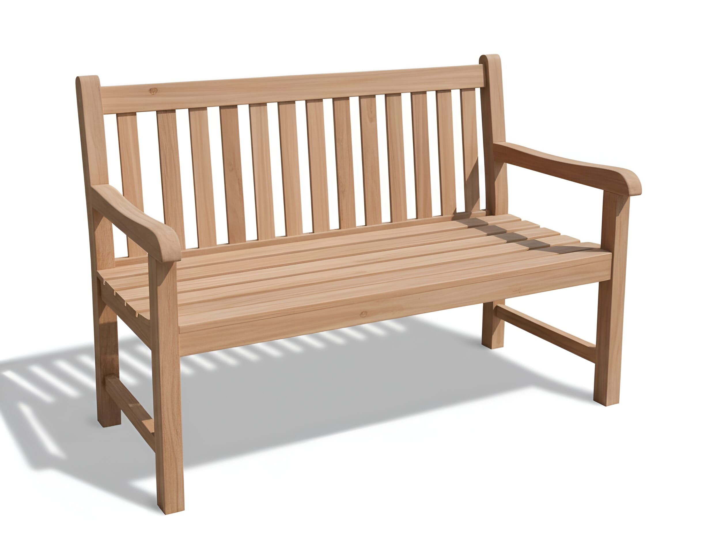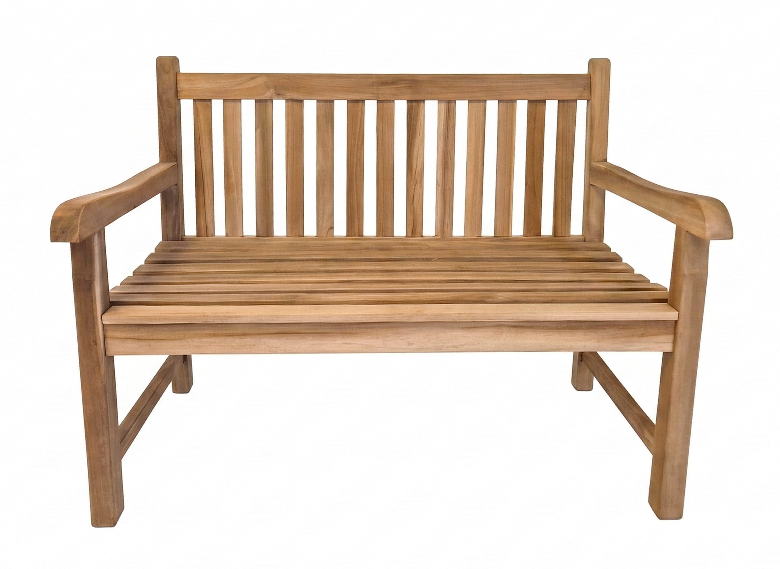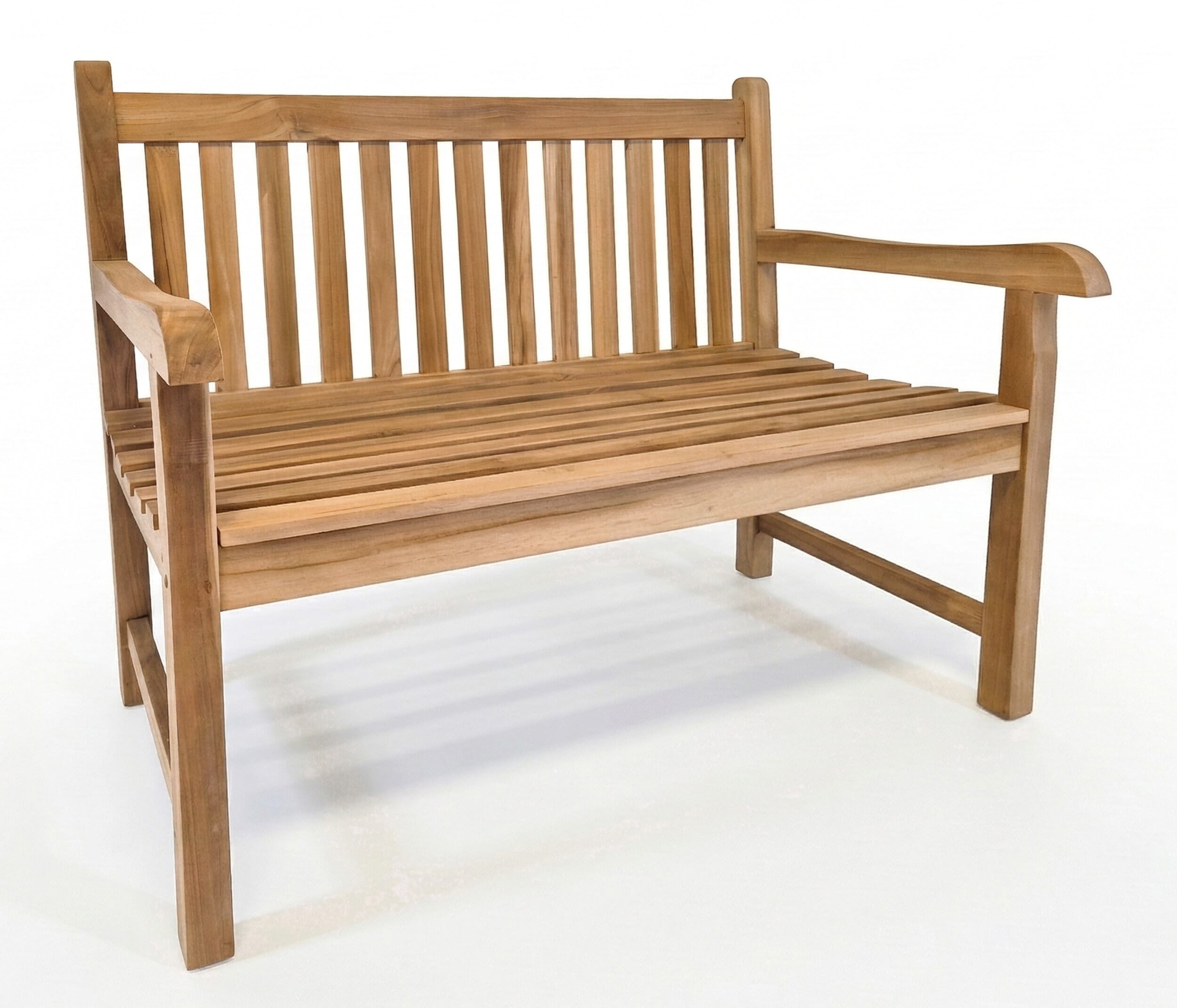 Gartenbank in Premiumteak mit ergonomisch geformten Sitz, Armlehnen und breitem Rückteil.