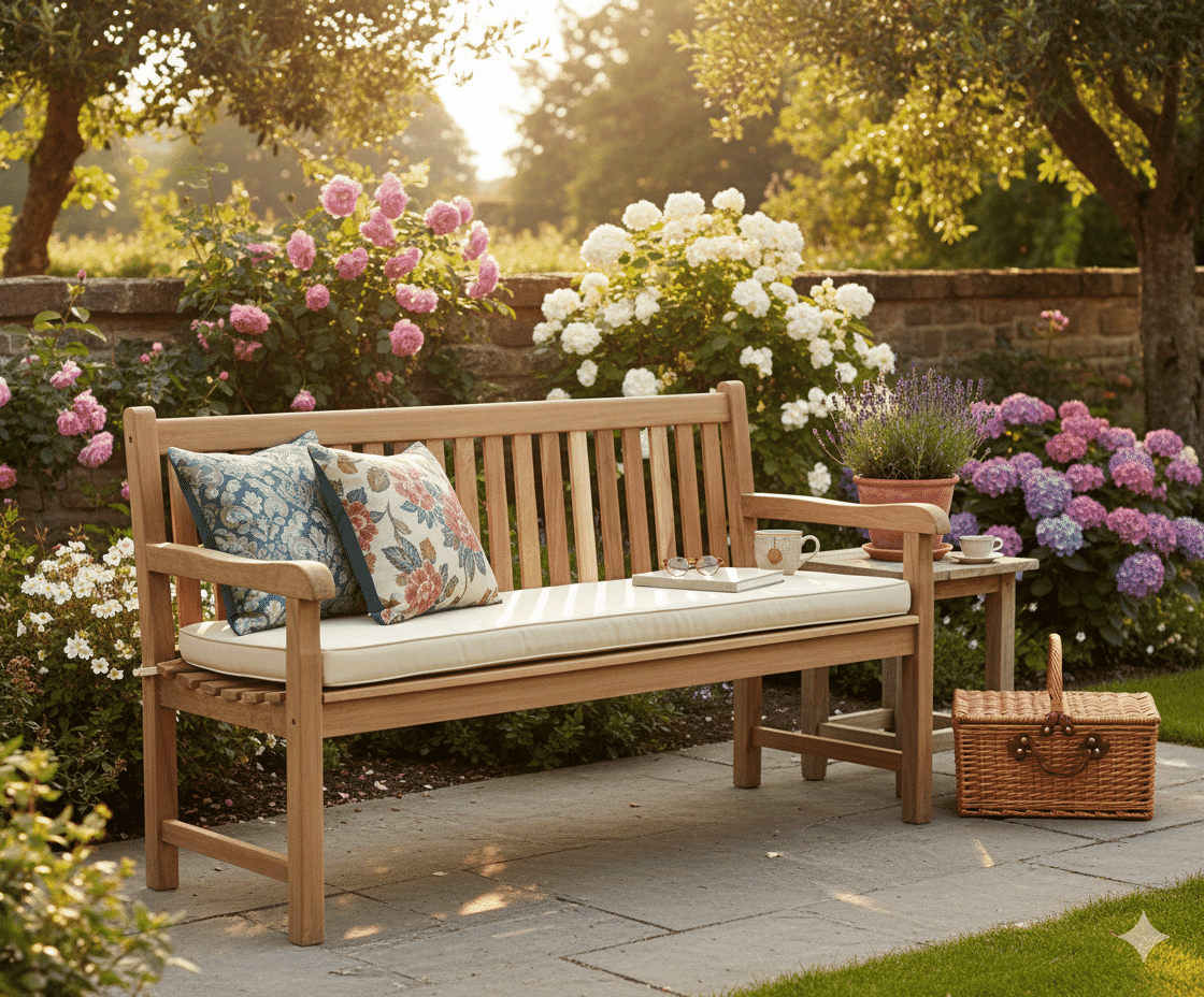 Gartenbank in Premiumteak mit ergonomisch geformten Sitz und breitem Rückteil