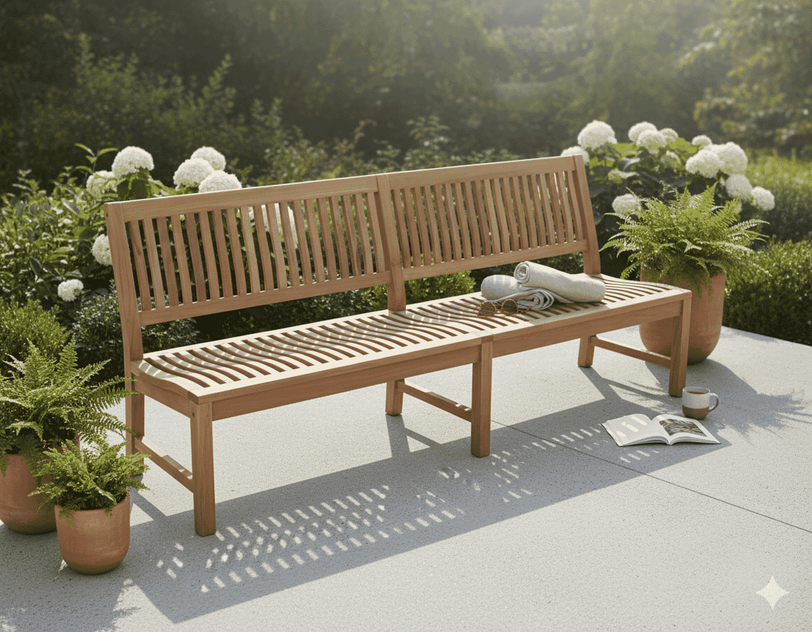 XXL Gartenbank in Premiumteak mit ergonomisch geformten Sitz und Rücken.